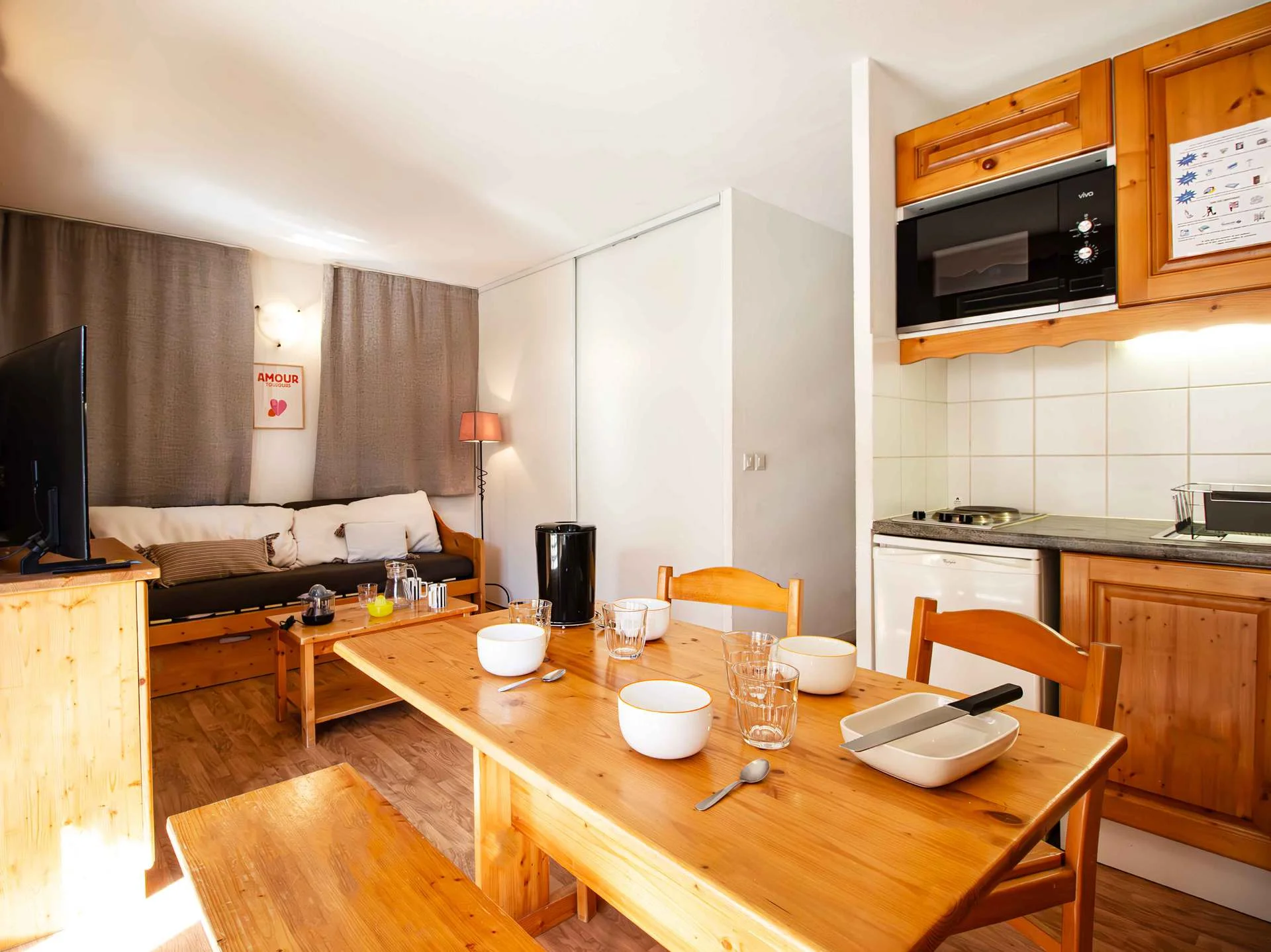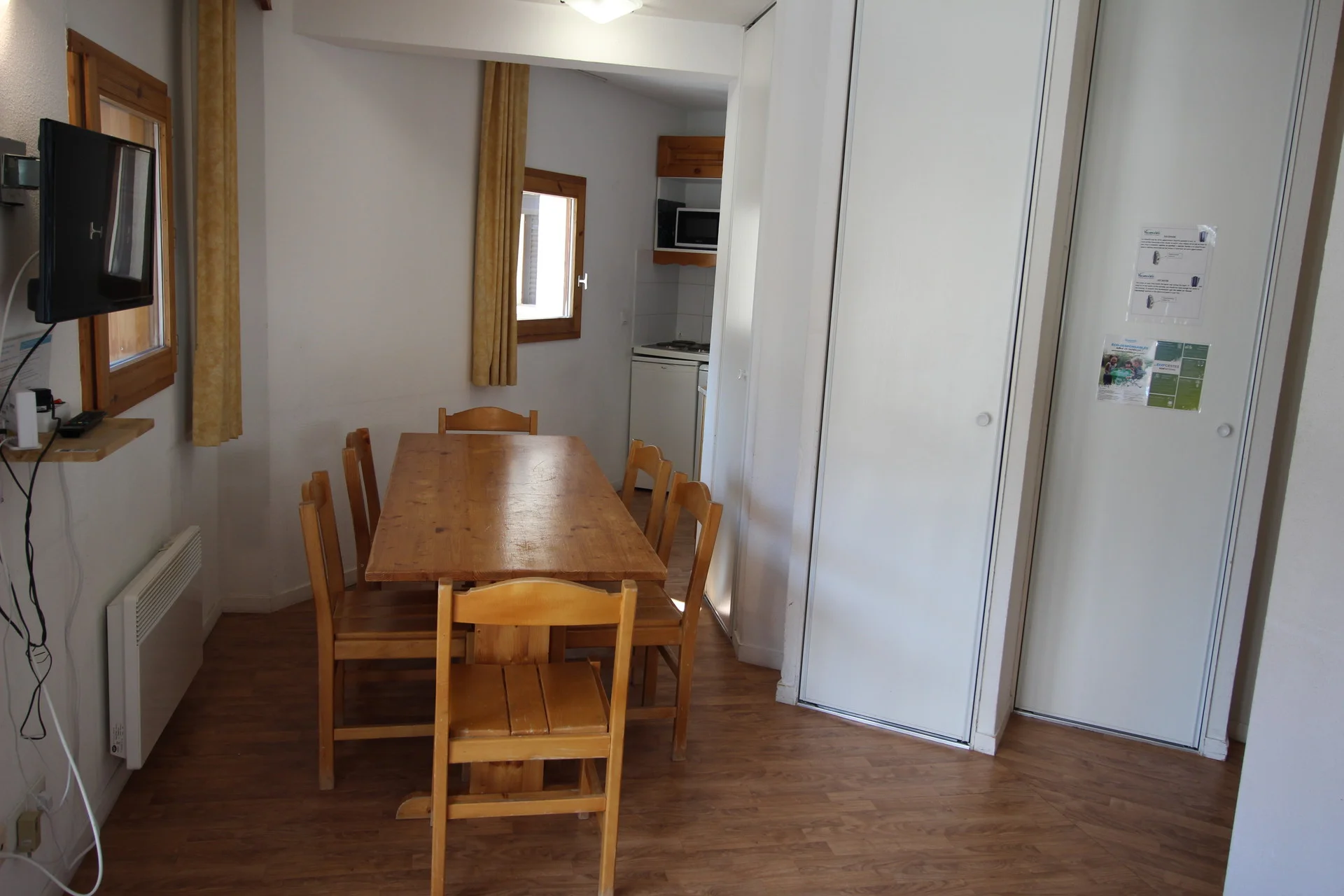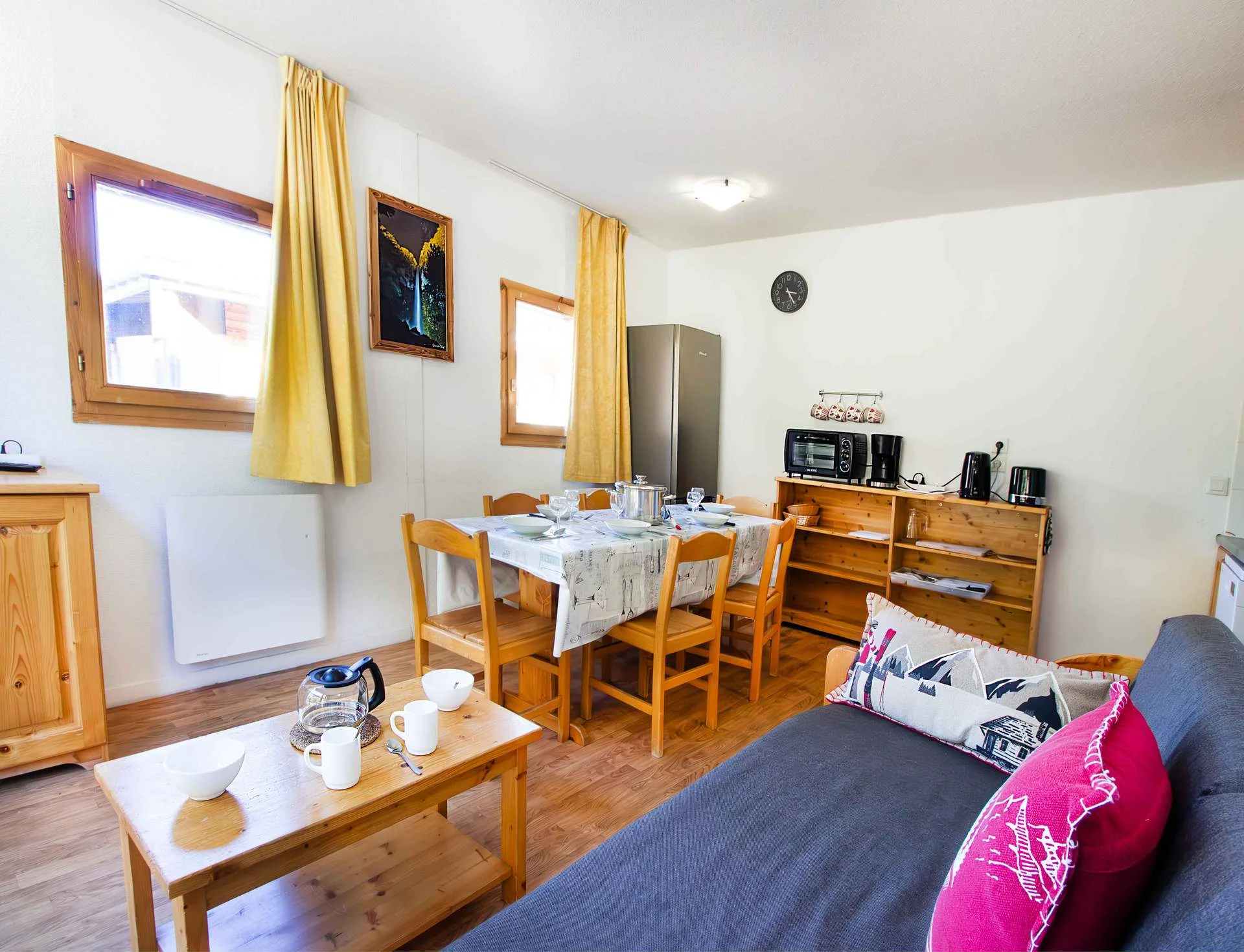 Dit is een compacte studio van 20 m² met een open indeling. De ruimte combineert woonkamer, slaapgedeelte en keuken in één vertrek. Je vindt hier een comfortabele zithoek met canapé-lit (slaapbank), televisie, twee salontafels en vier stoelen. De ruimte is voorzien van natuurlijk licht en heeft uitzicht op de pistes.