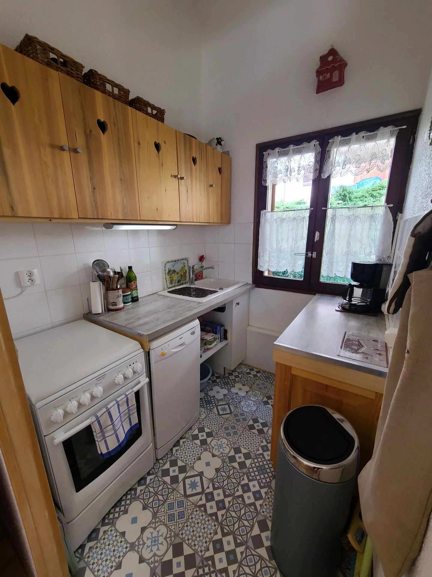Zithoek met slaapbank en 2 kussens, eettafel met toile cirée, 4 stoelen, 1 tabouret, televisie met decoder en 2 afstandsbedieningen, bureau, bureaustoelen, verlichting