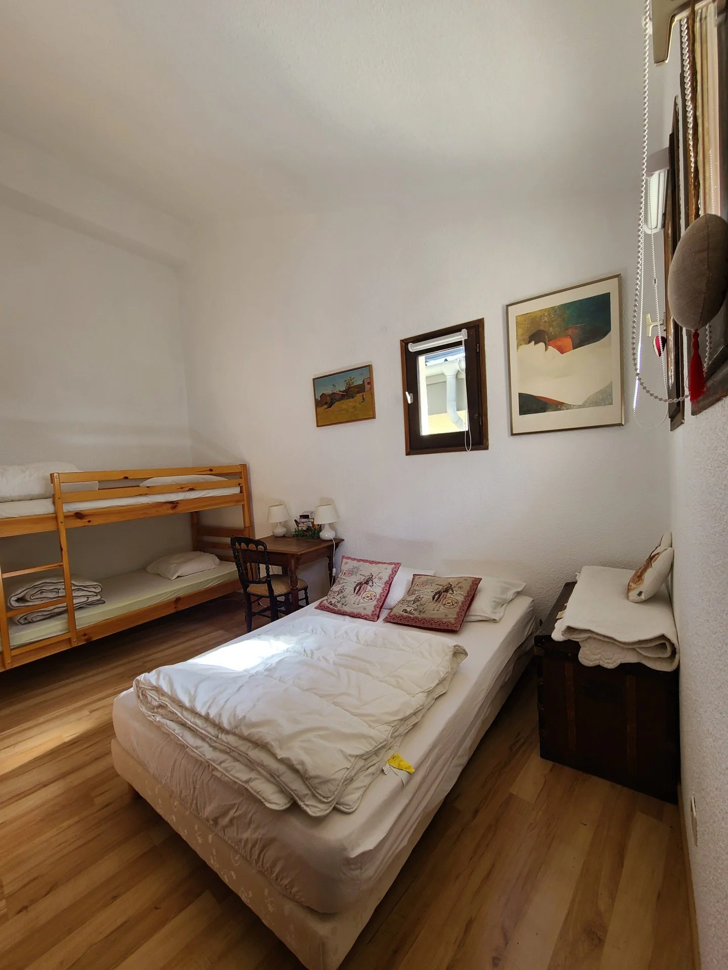 Slaapkamer: 1 tweepersoonsbed (140x190 cm) + 1 stapelbed (2 slaapplaatsen, 80x190 cm per bed)