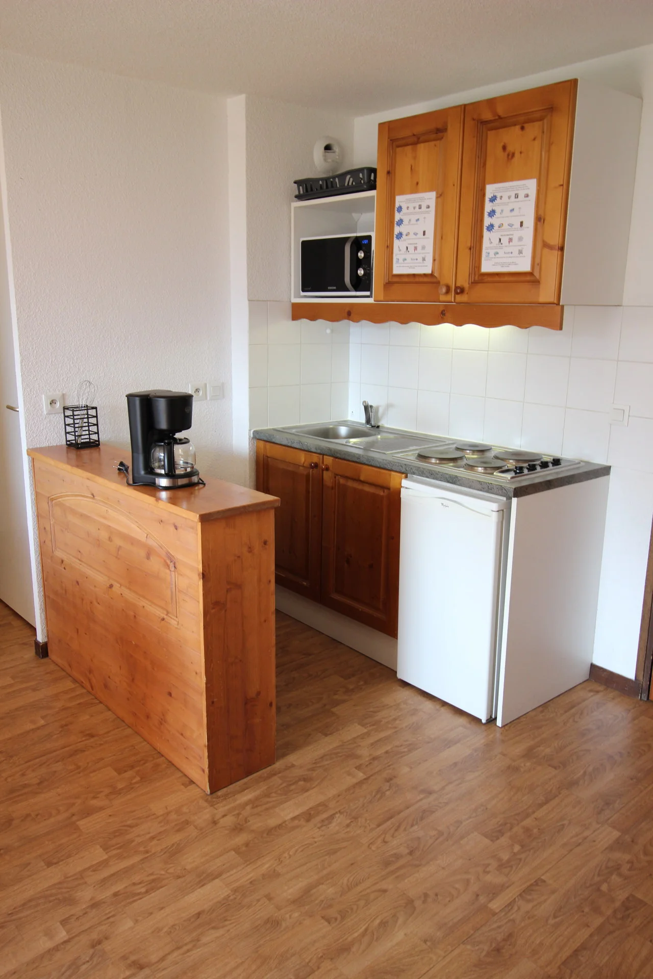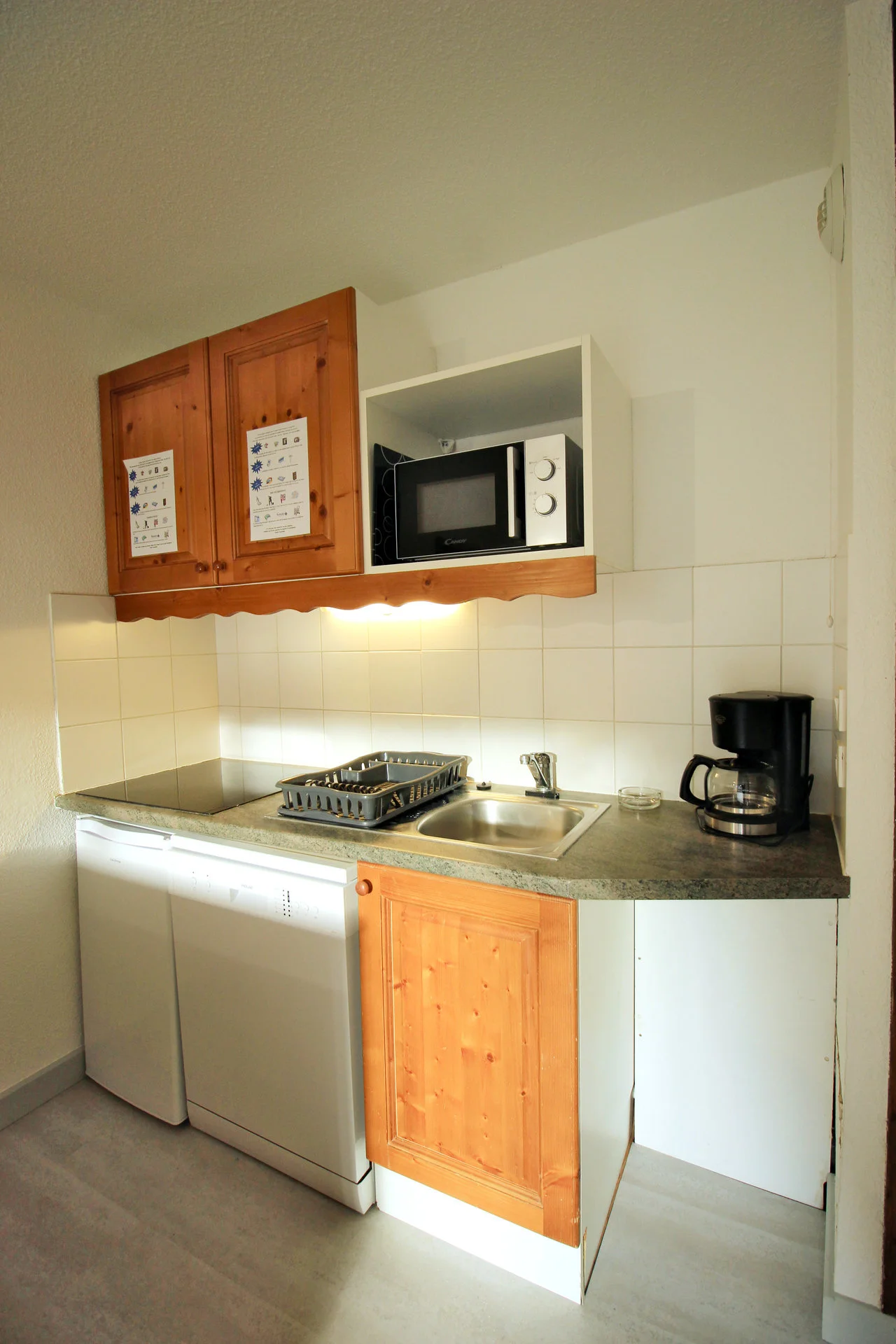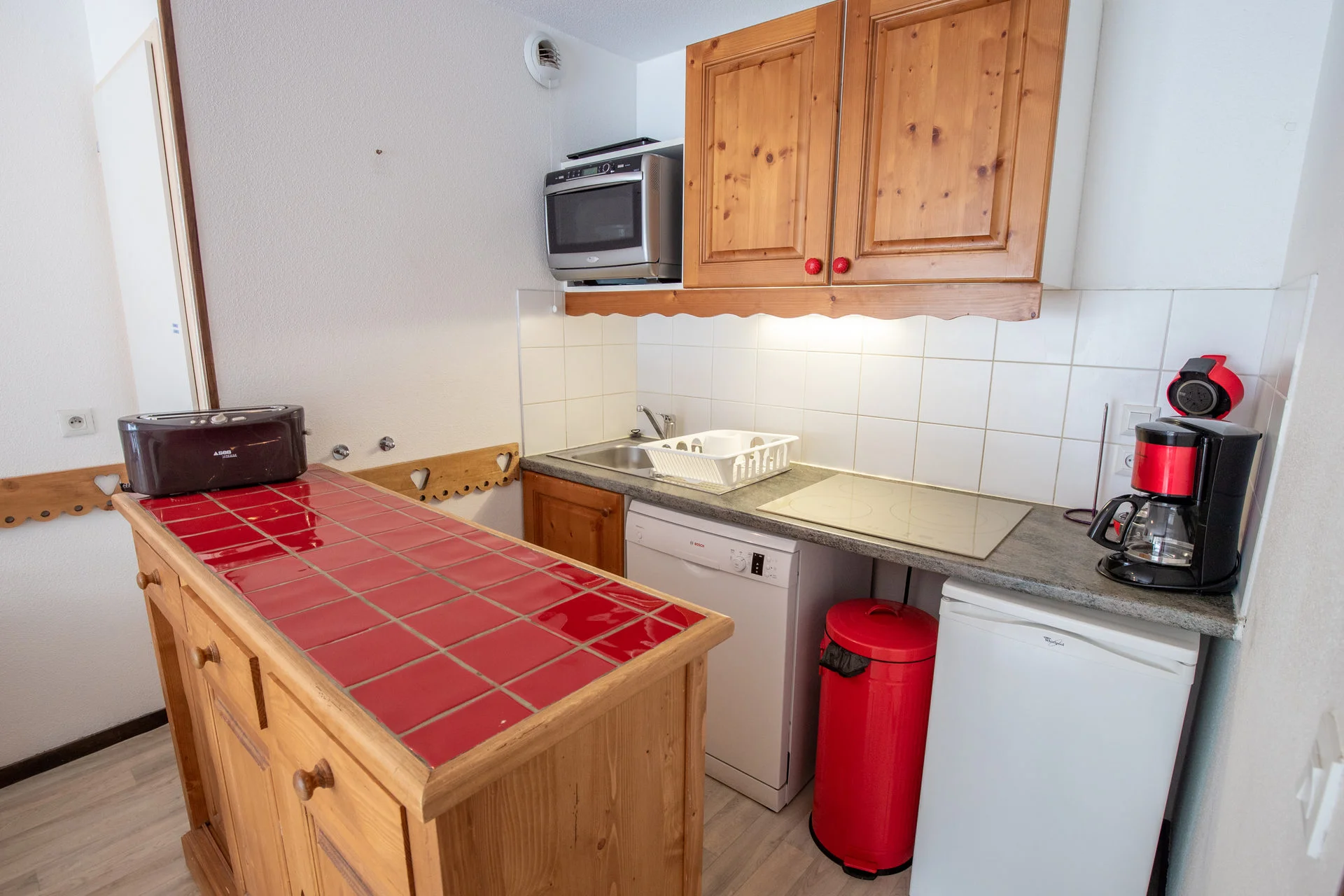 Volledig ingerichte keuken met inductiekookplaat (3 pitten), vaatwasser, magnetron, mini-oven, koelkast, waterkoker, koffiezetapparaat, sinaasappelpers en broodrooster.