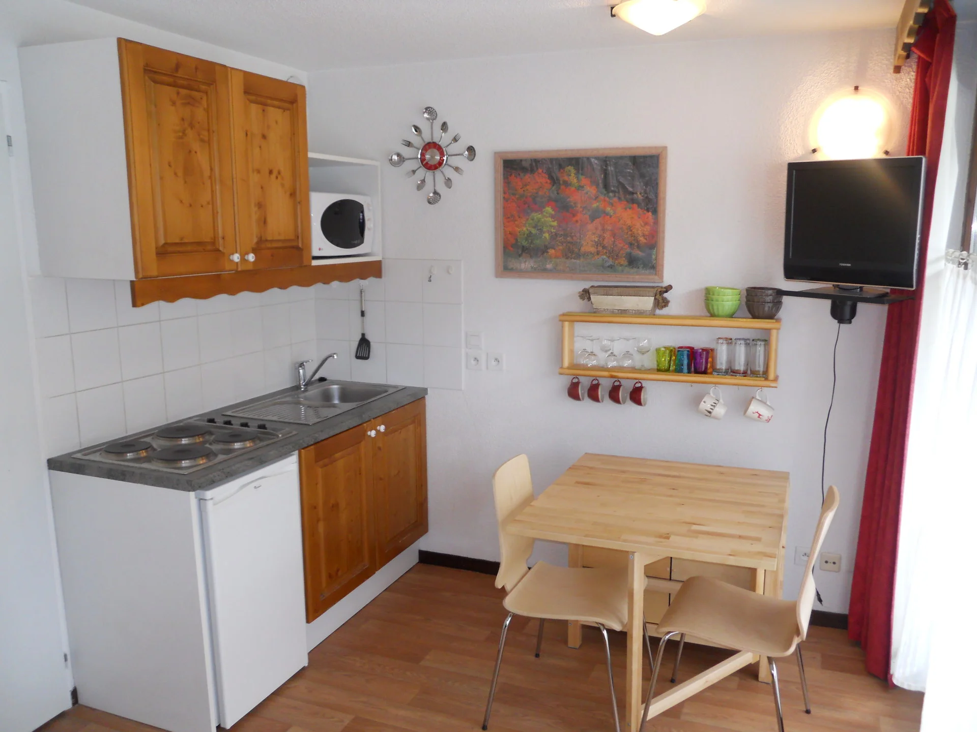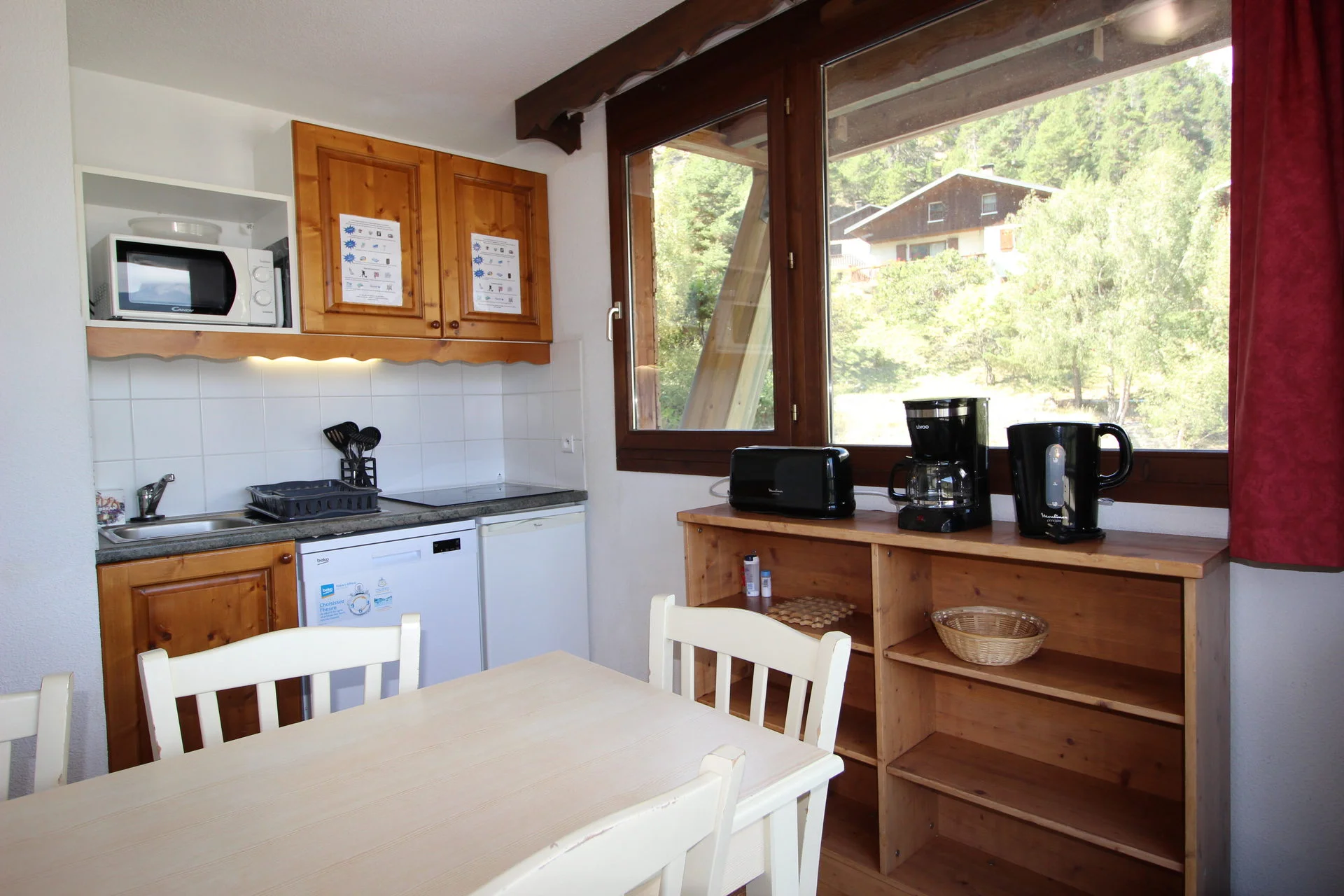 Keukenbenodigdheden: serviesset (borden, schaaltjes, dessertborden), kopjes, glazen, wijnglazen (6 stuks), bestek, pannen (3 stuks), snelkookpan, grote pan, 3 koekenpannen, crêpepan, deksel, messen, lepels, vorken, onderzetters (3 stuks), slacentrifuge, zeef, snijplanken (2 stuks), serveerschotels (2 stuks), ovenschotels (3 stuks), karaf, maatglas, fruitschaal, friteuse, raclette-apparaat, saladeschalen (5 stuks).