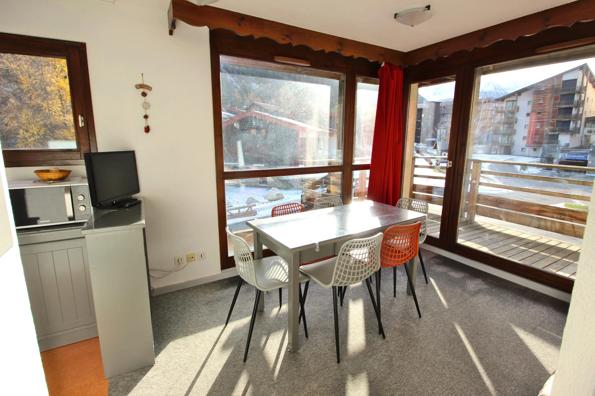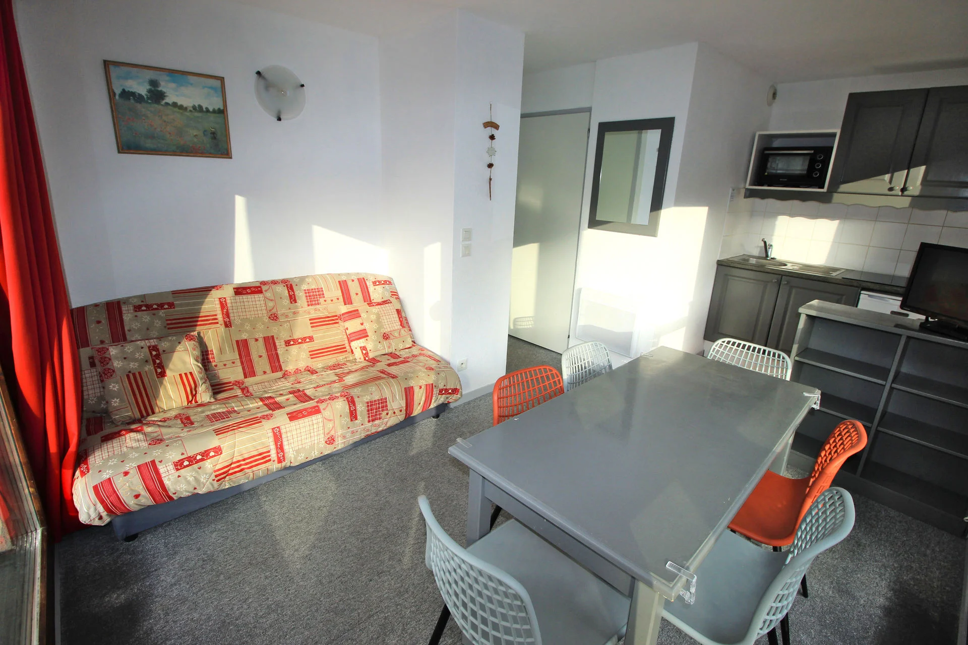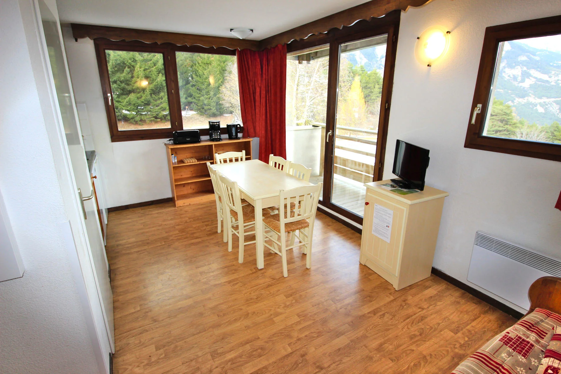 Gezellige woonkamer met TV en afstandsbediening. Slaapbank voor extra slaapplaatsen. Uitzicht op de bergen. Het appartement is voorzien van een balkon aan de oostzijde.