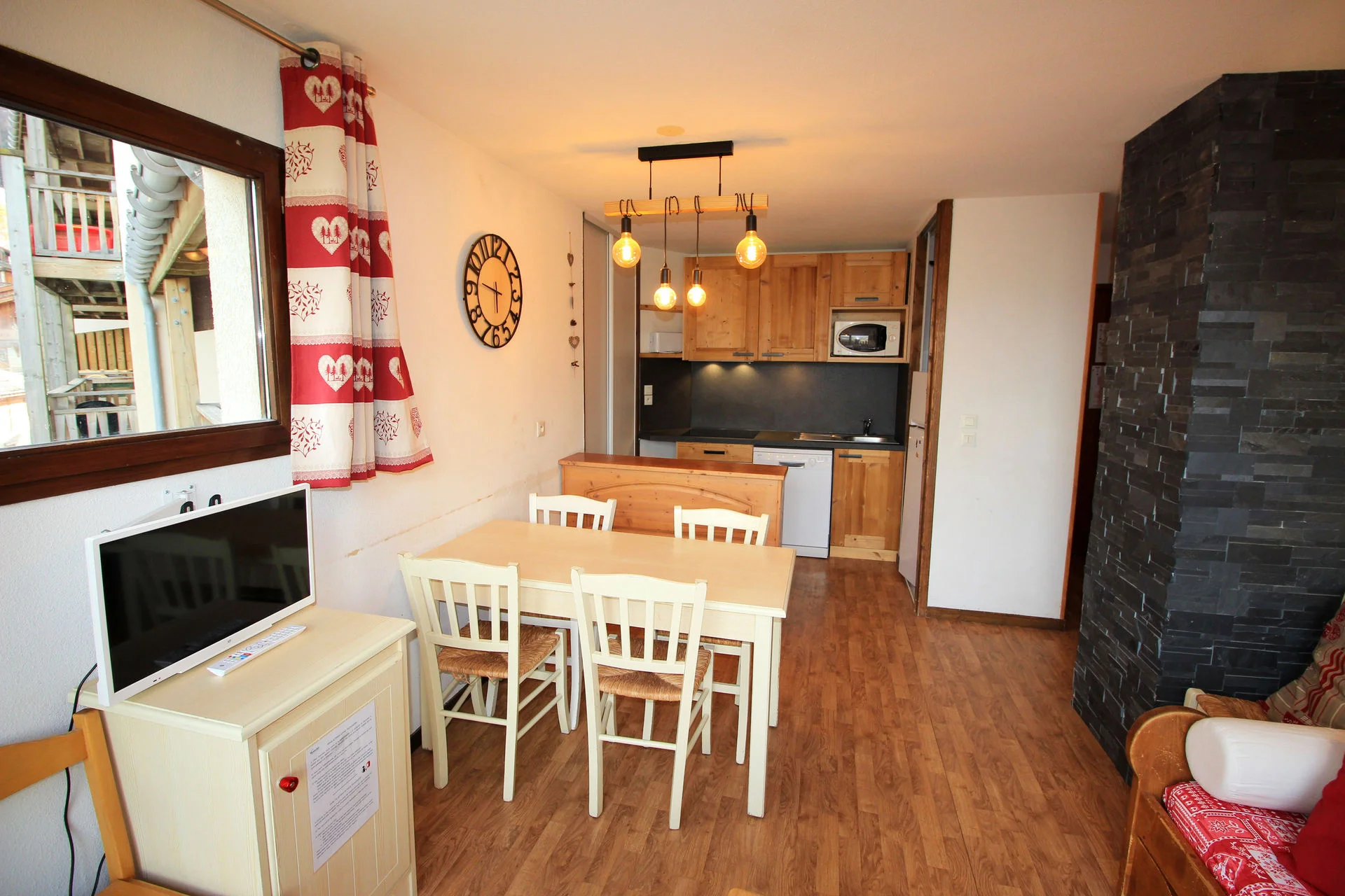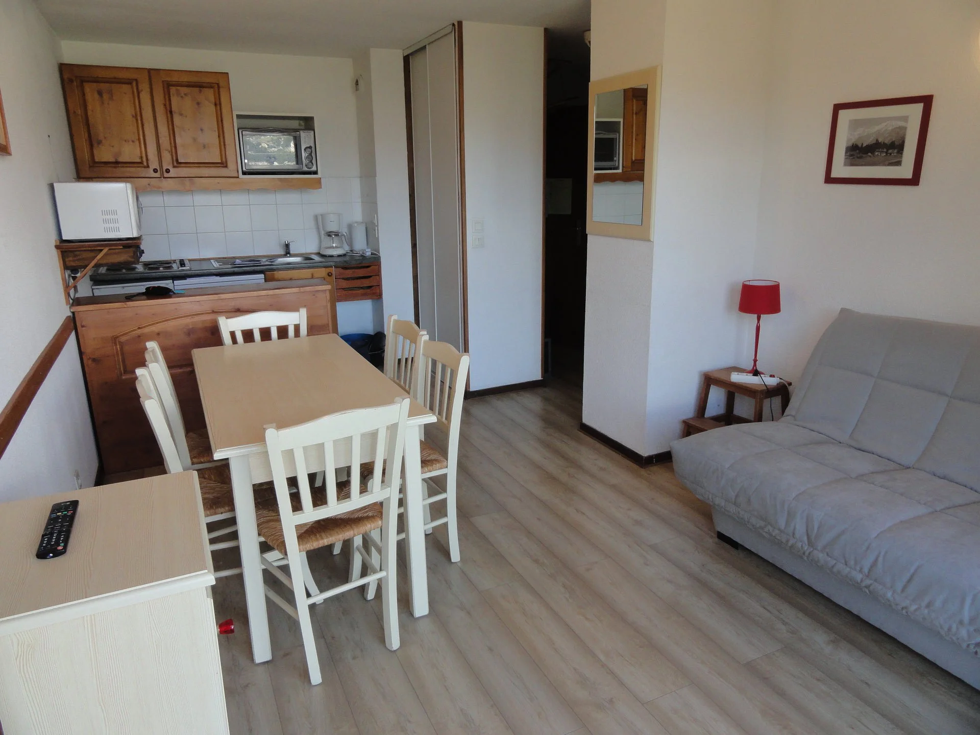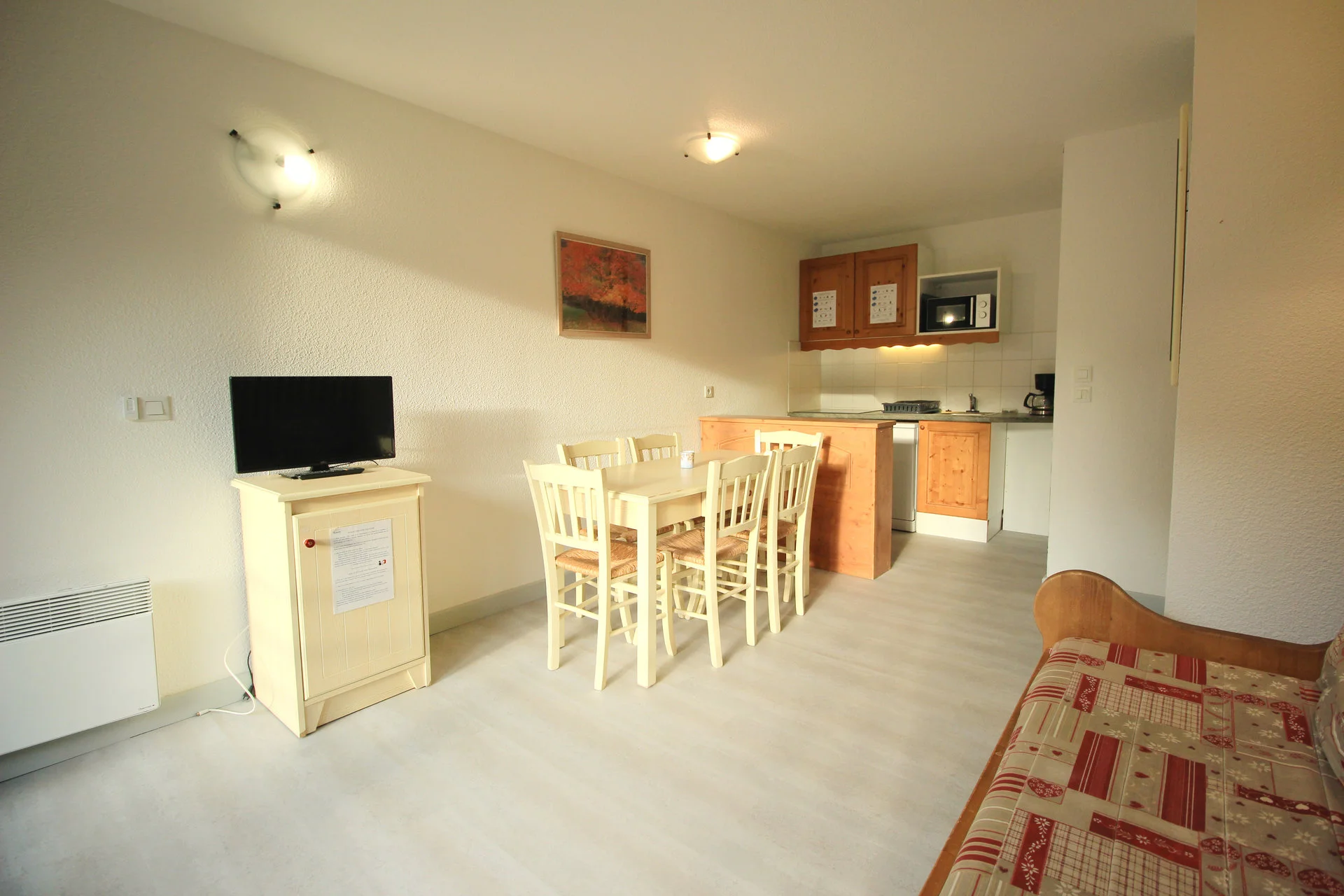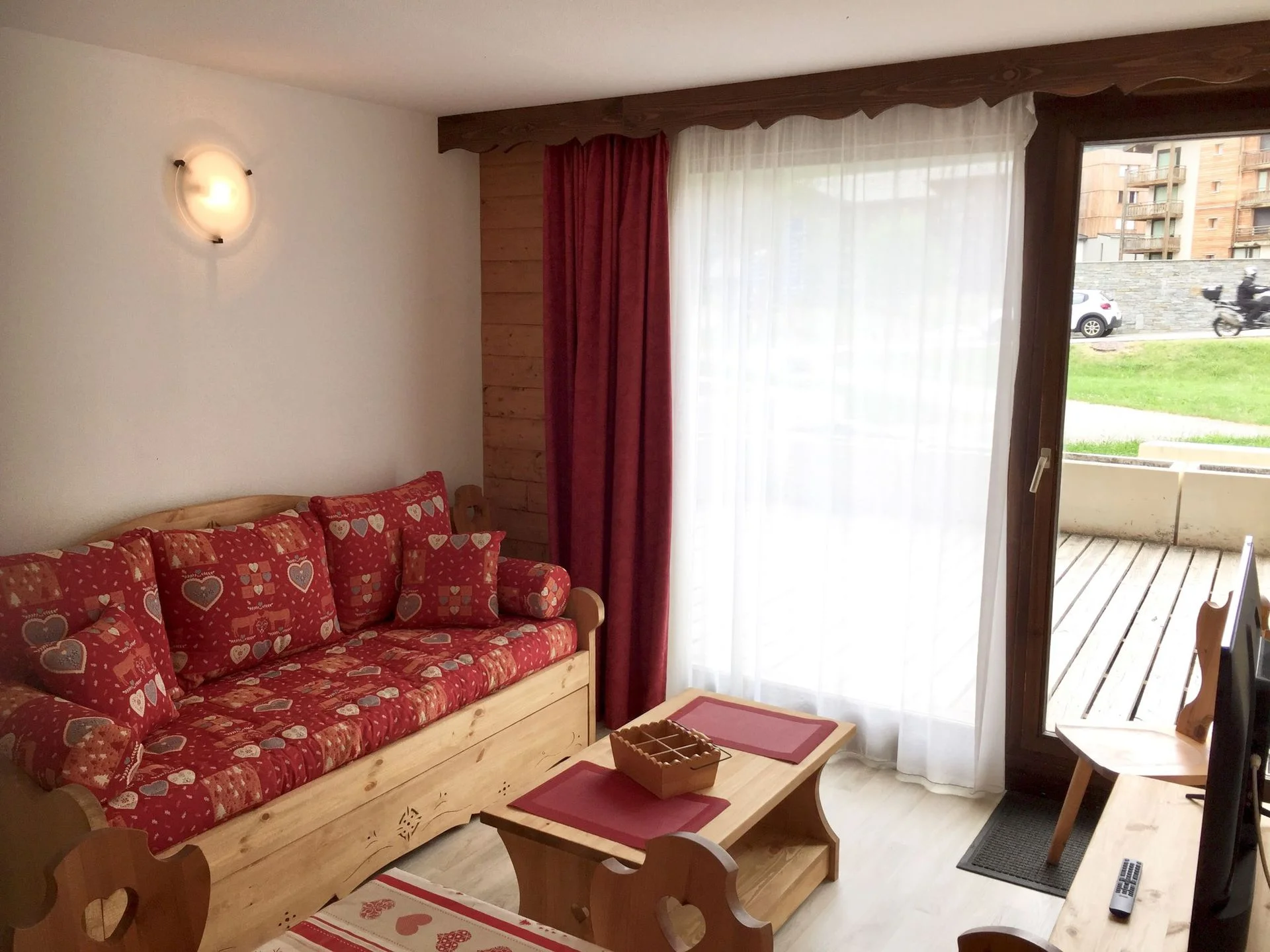 Gezellige woonkamer met TV en afstandsbediening. Slaapbank voor extra slaapplaatsen. Uitzicht op de bergen. Het appartement is voorzien van een balkon aan de oostzijde.