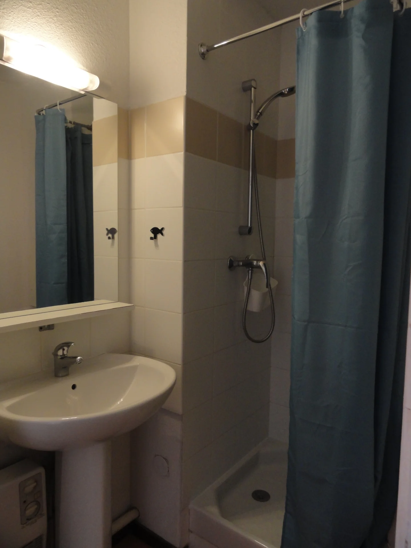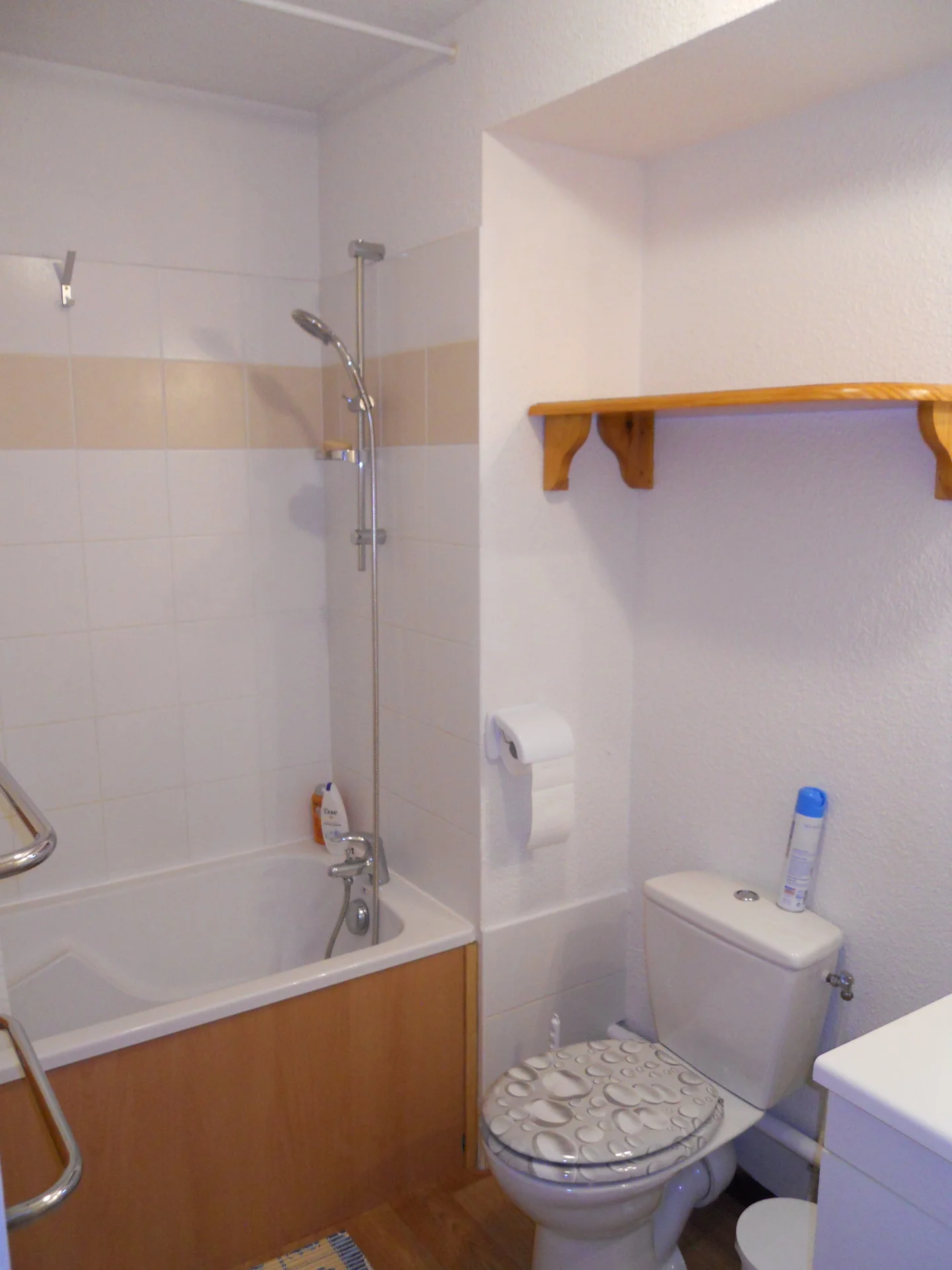 2 badkamers met toilet, föhn en spiegel.