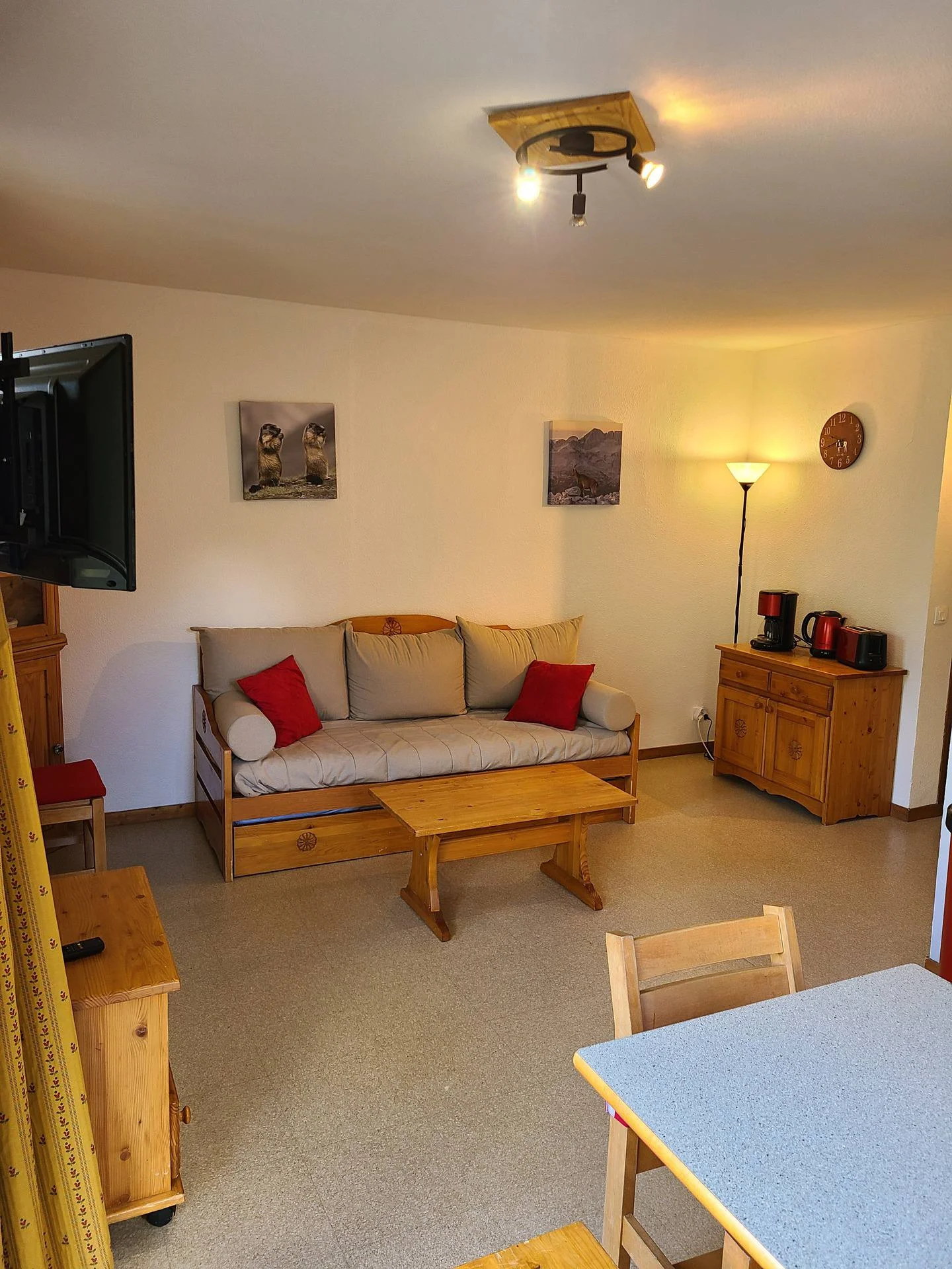 Dit is een compact bergappartement met twee ruimtes en een slaapkabine. Het bestaat uit een woonkamer, één slaapkamer en een slaapkabine. De indeling is perfect voor gezinnen of groepen die efficiënt willen logeren.