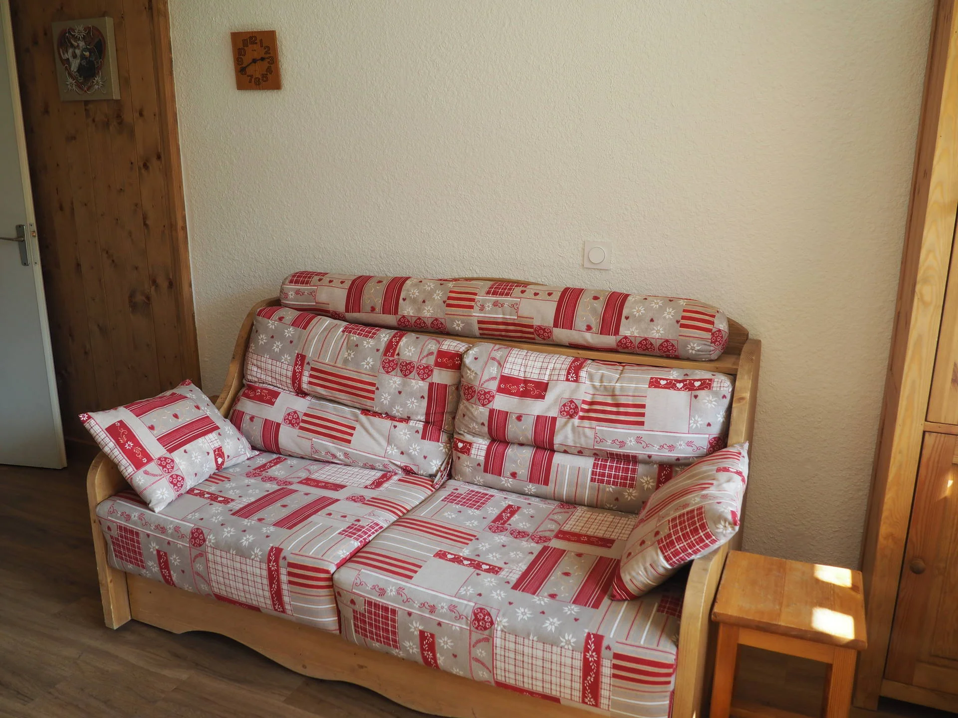 TV met afstandsbediening, uitklapbare bank (2 personen), tafel met stoelen en krukken.