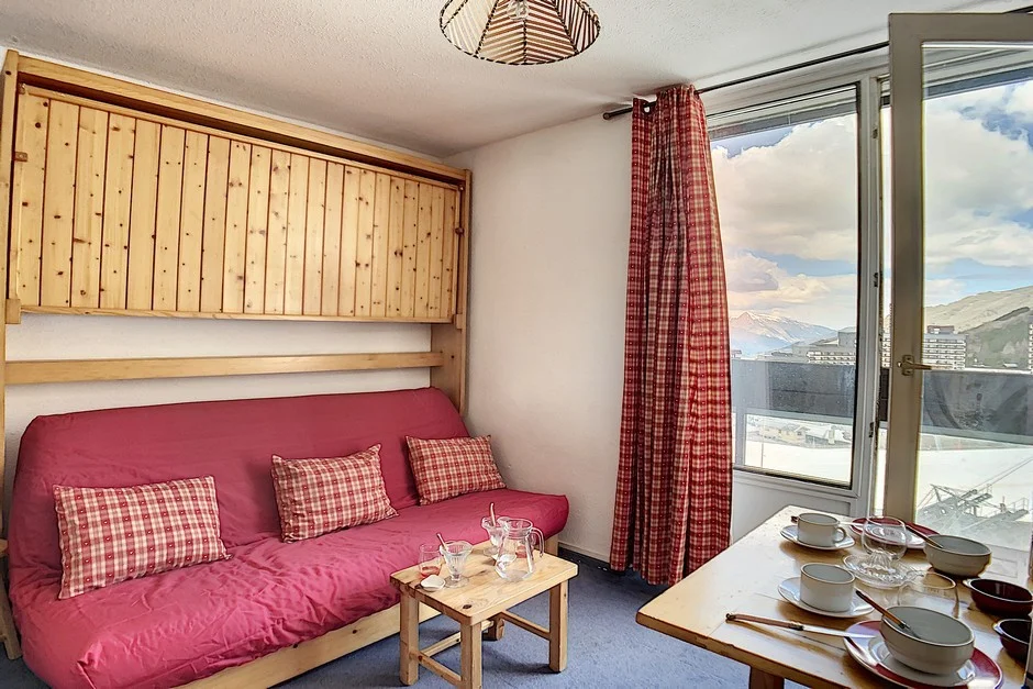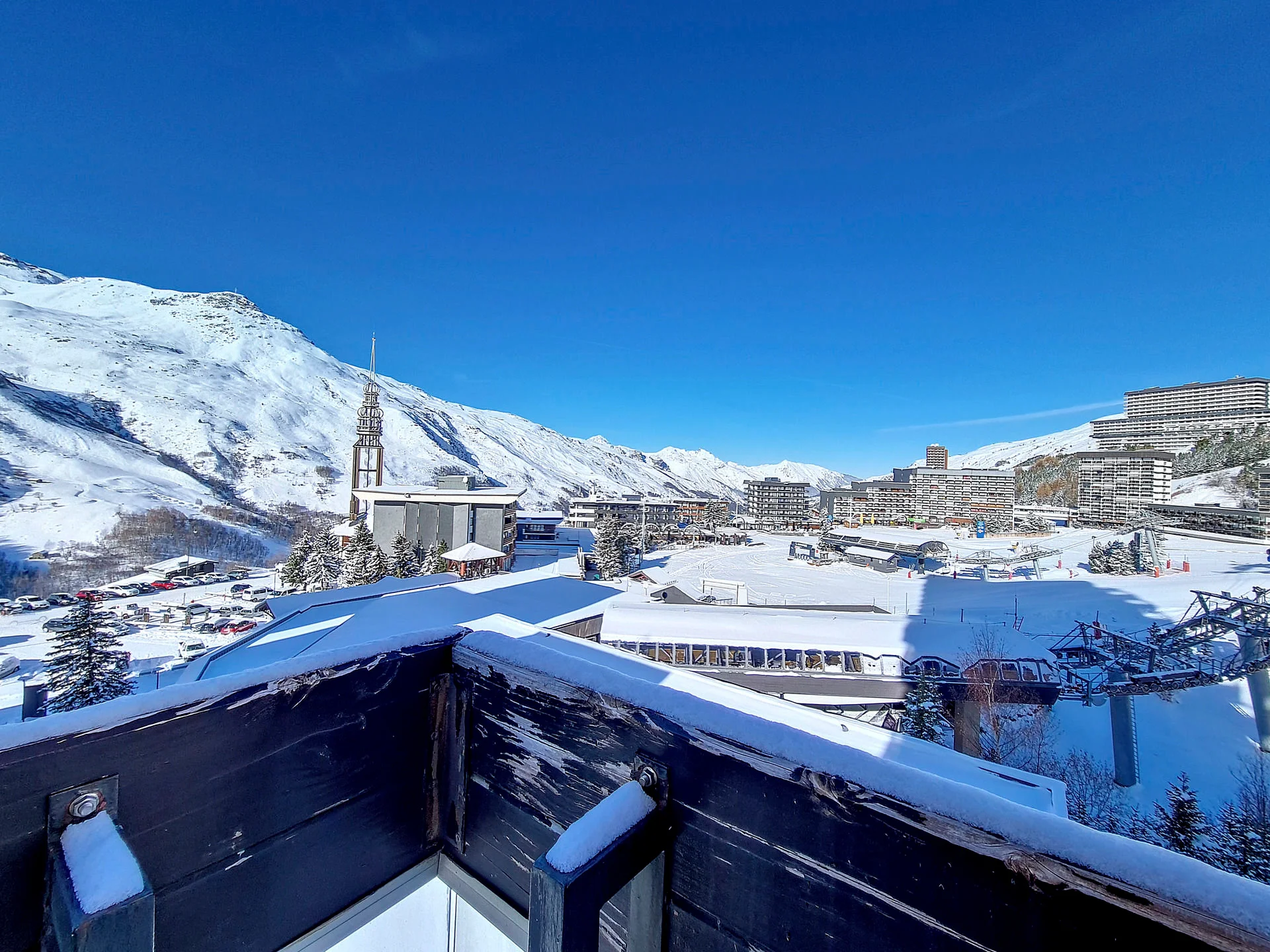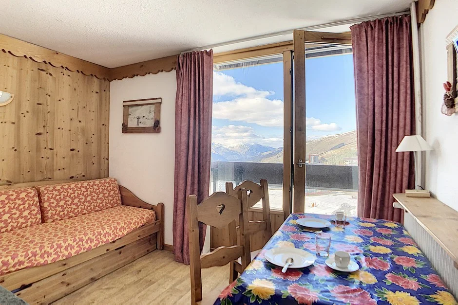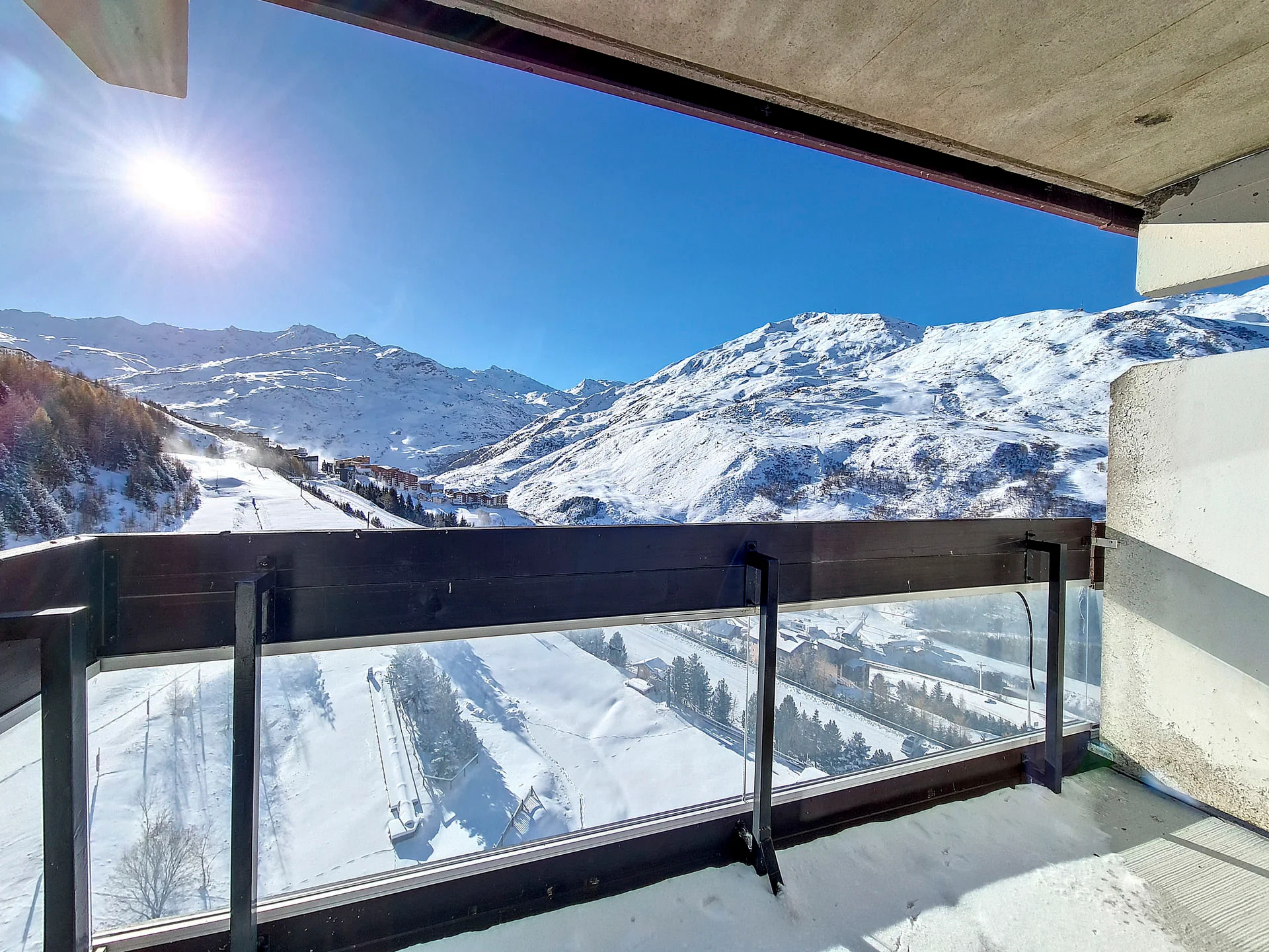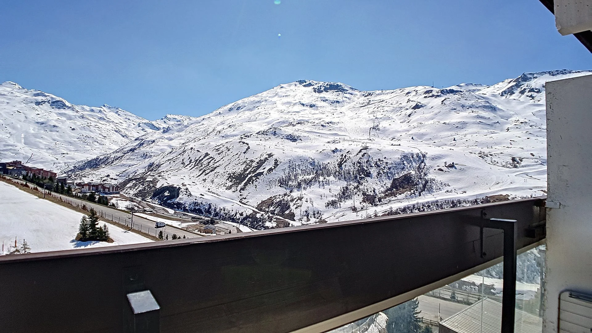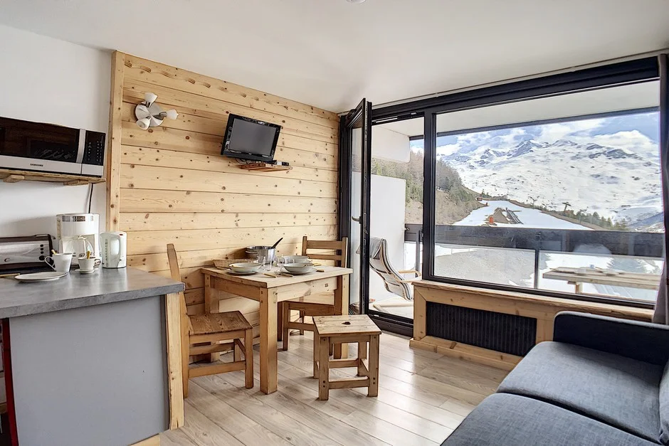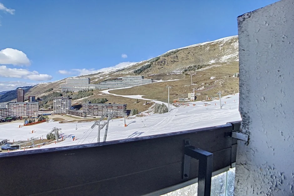Appartement op hoge verdieping met lift. Balkon op het zuiden met zitplaatsen en eettafel. Uitzicht op de skigebieden. Lift aanwezig in het gebouw. Direct aan de pistes gelegen.