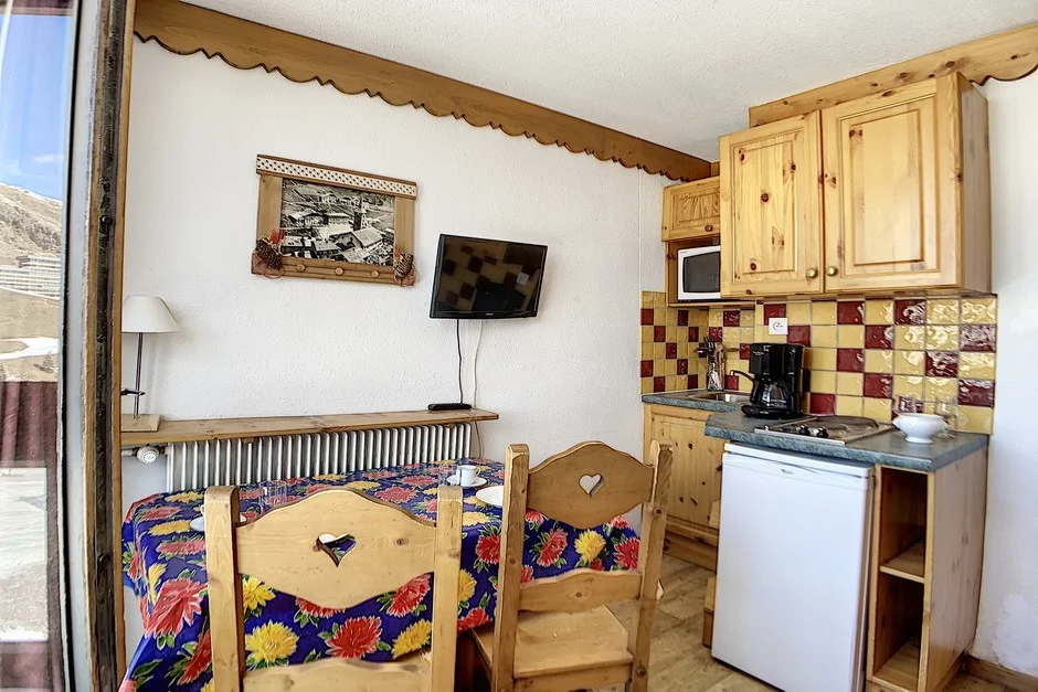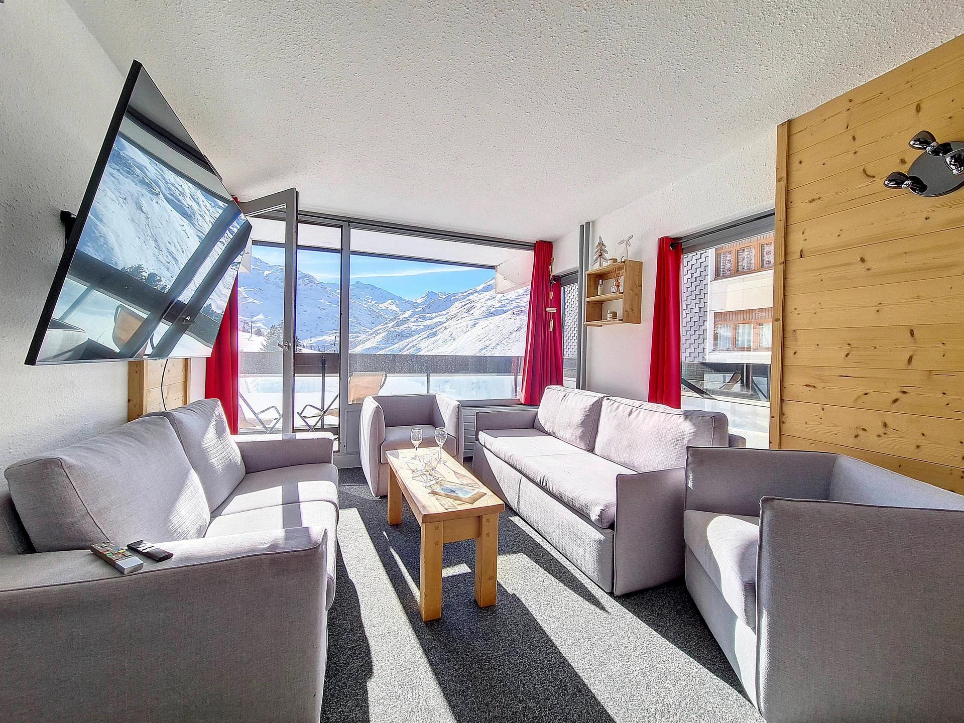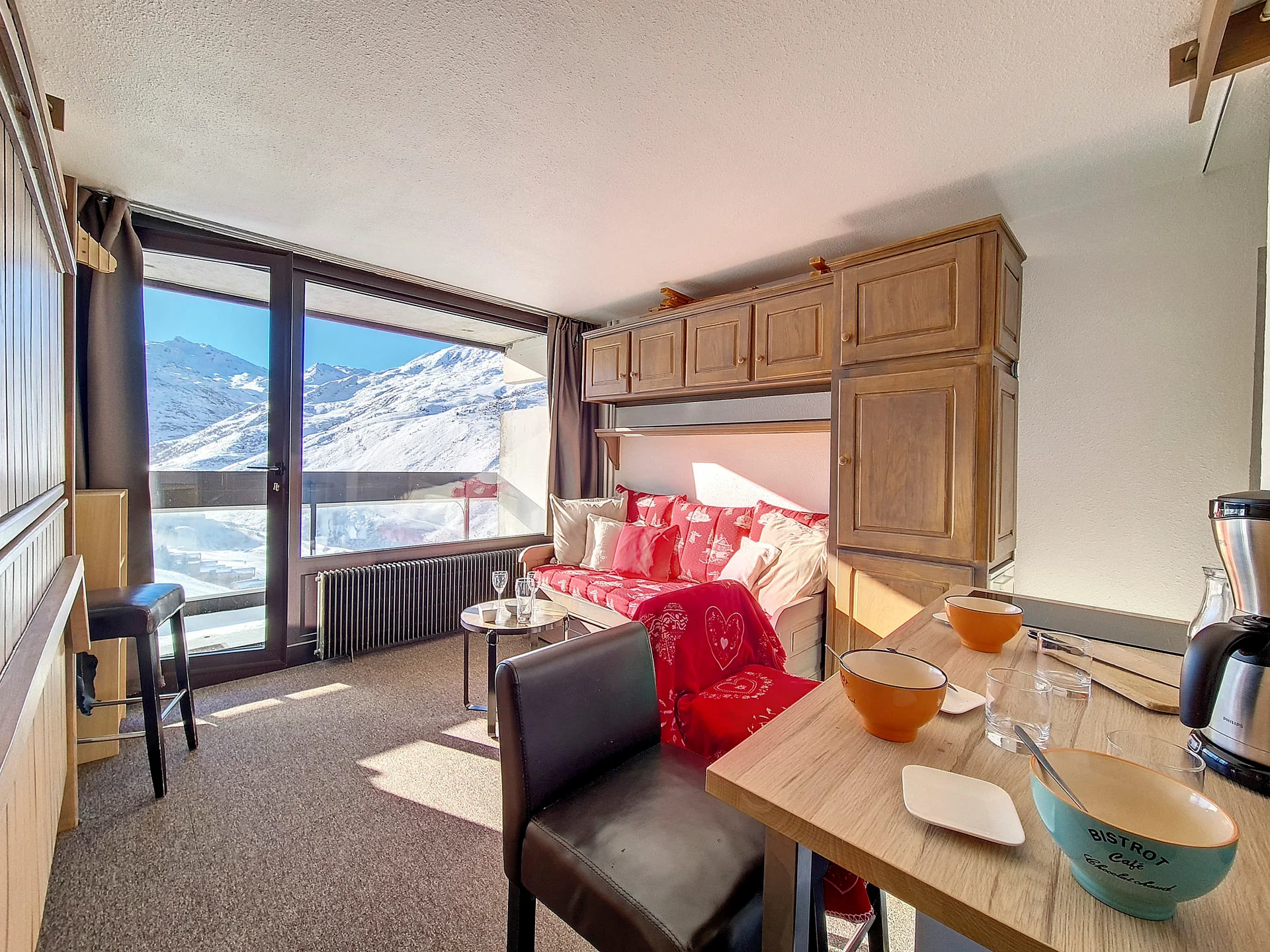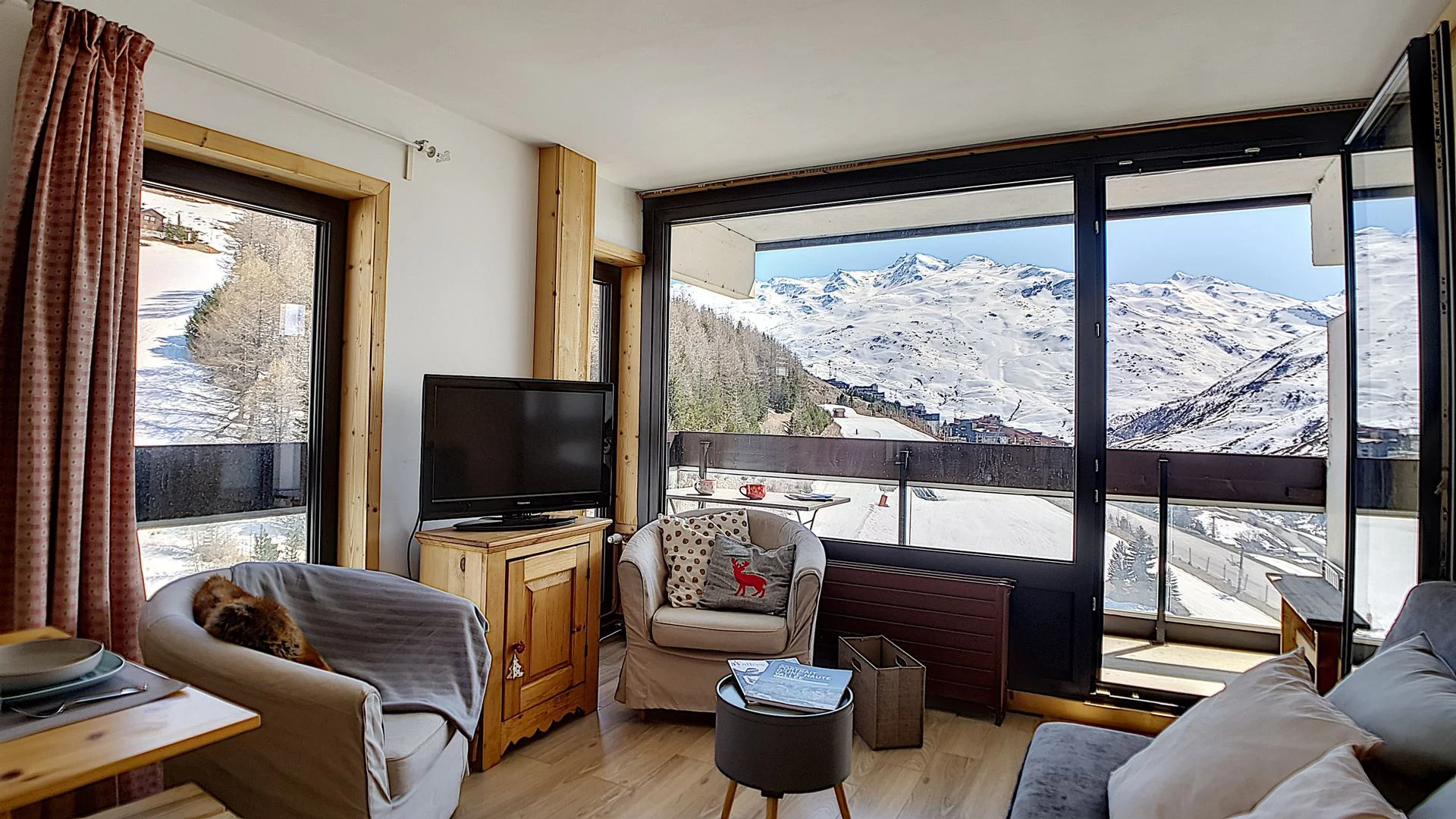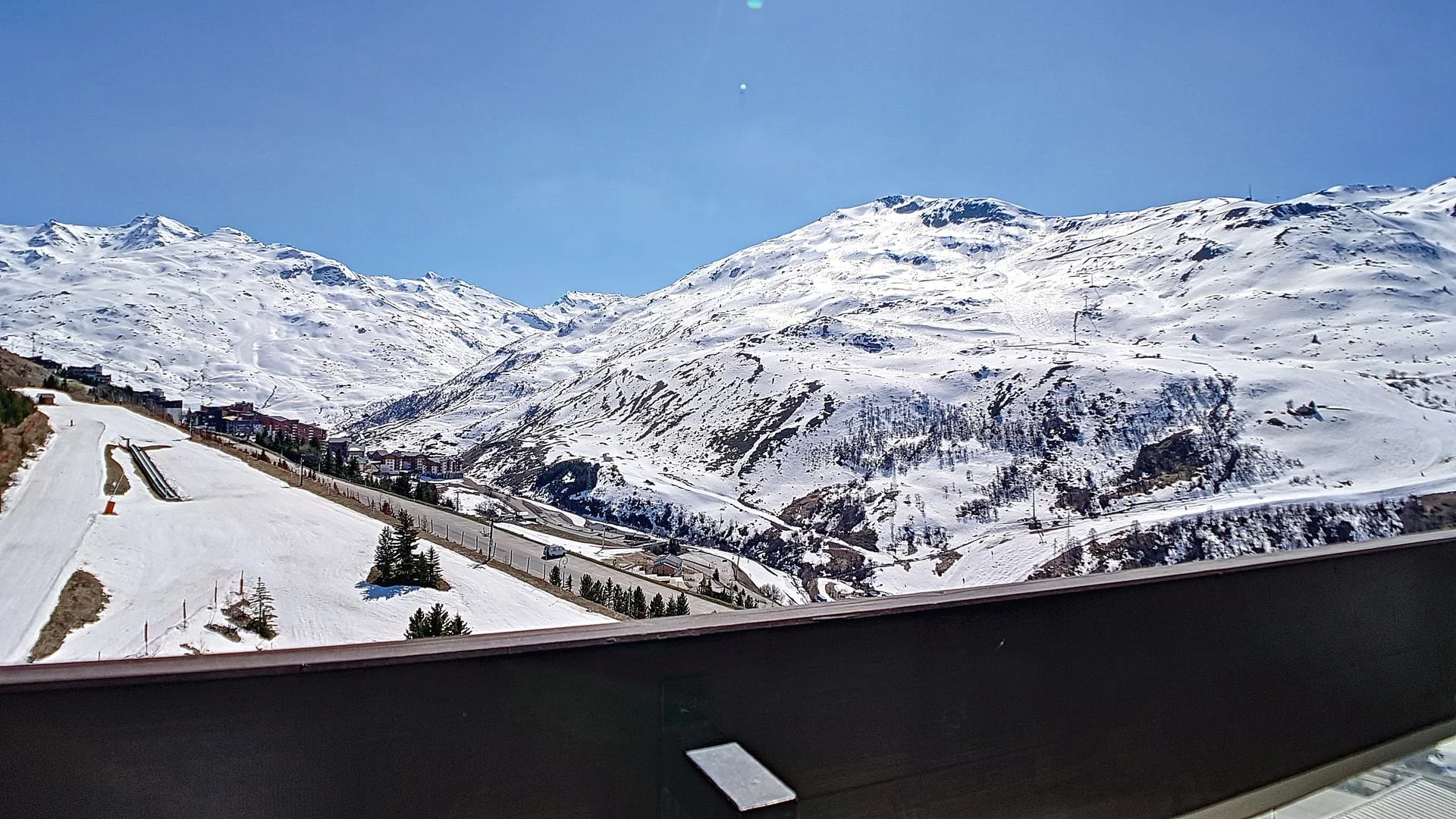 Appartement op hoge verdieping met lift. Balkon op het zuiden met zitplaatsen en eettafel. Uitzicht op de skigebieden. Lift aanwezig in het gebouw. Direct aan de pistes gelegen.