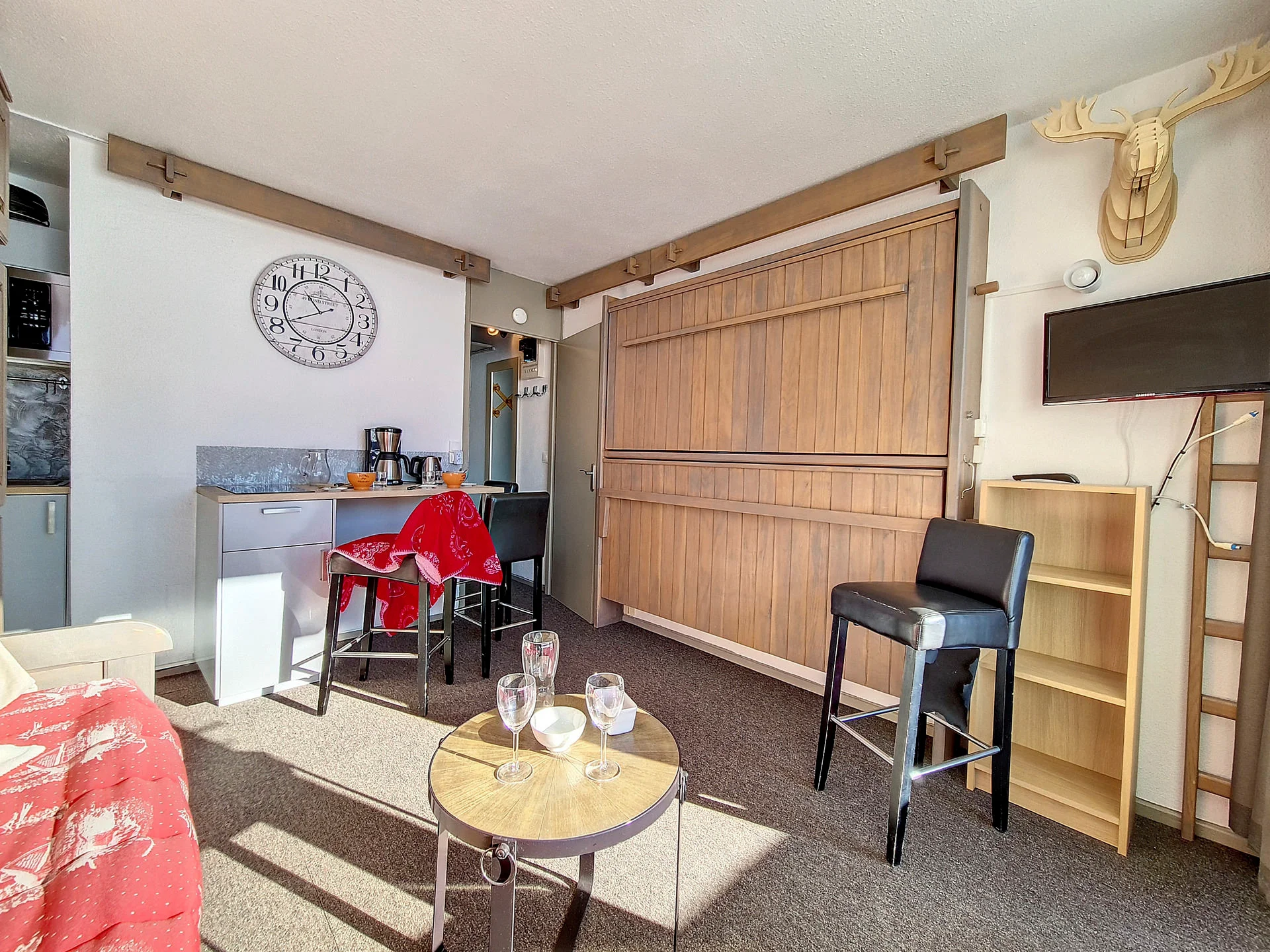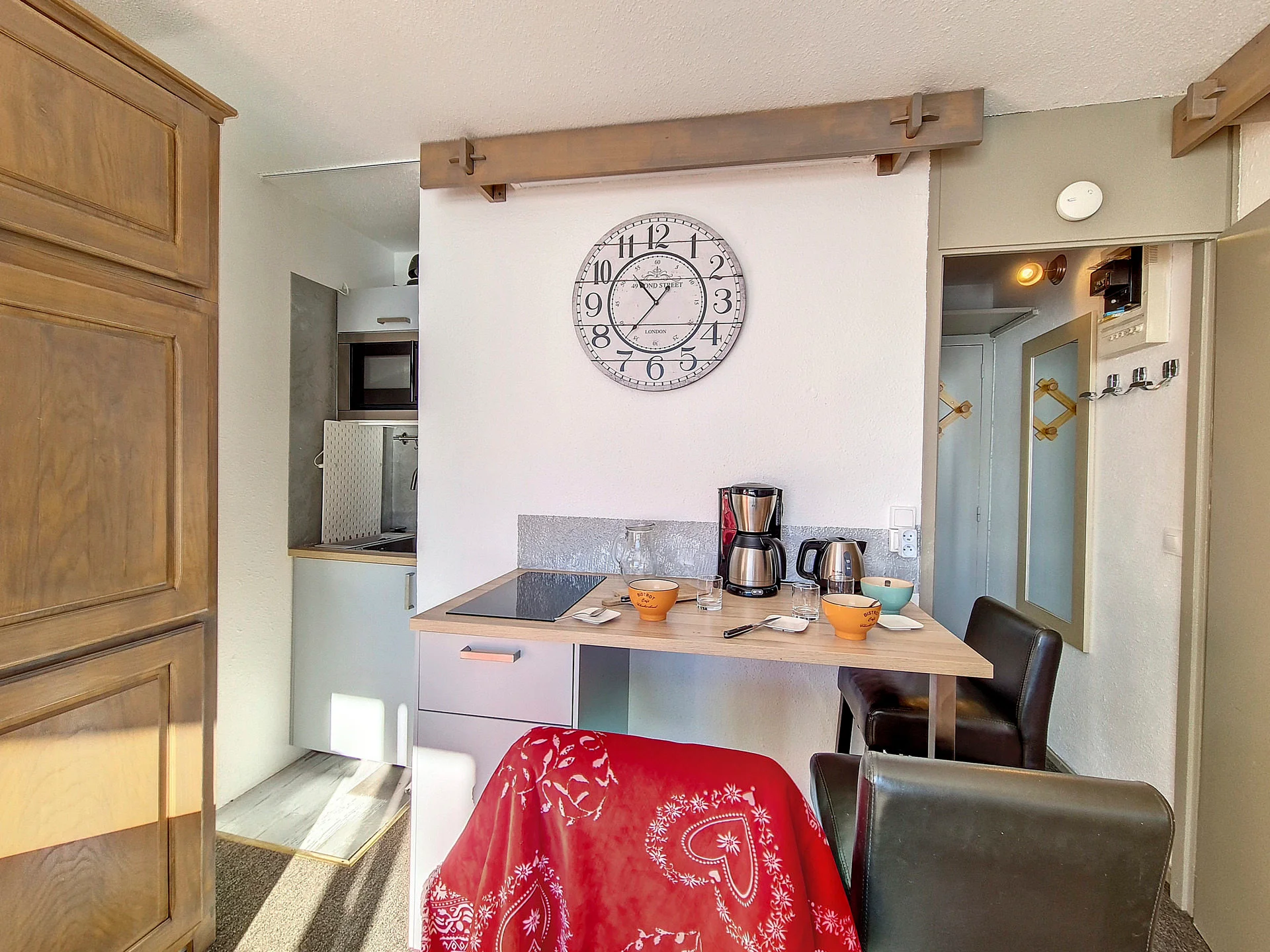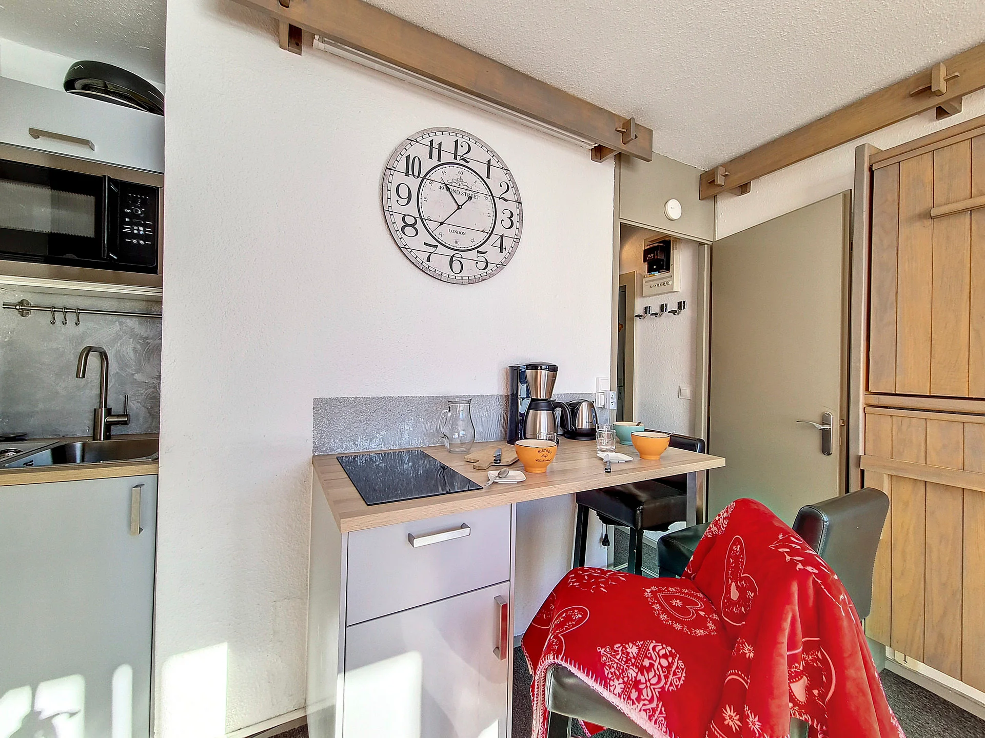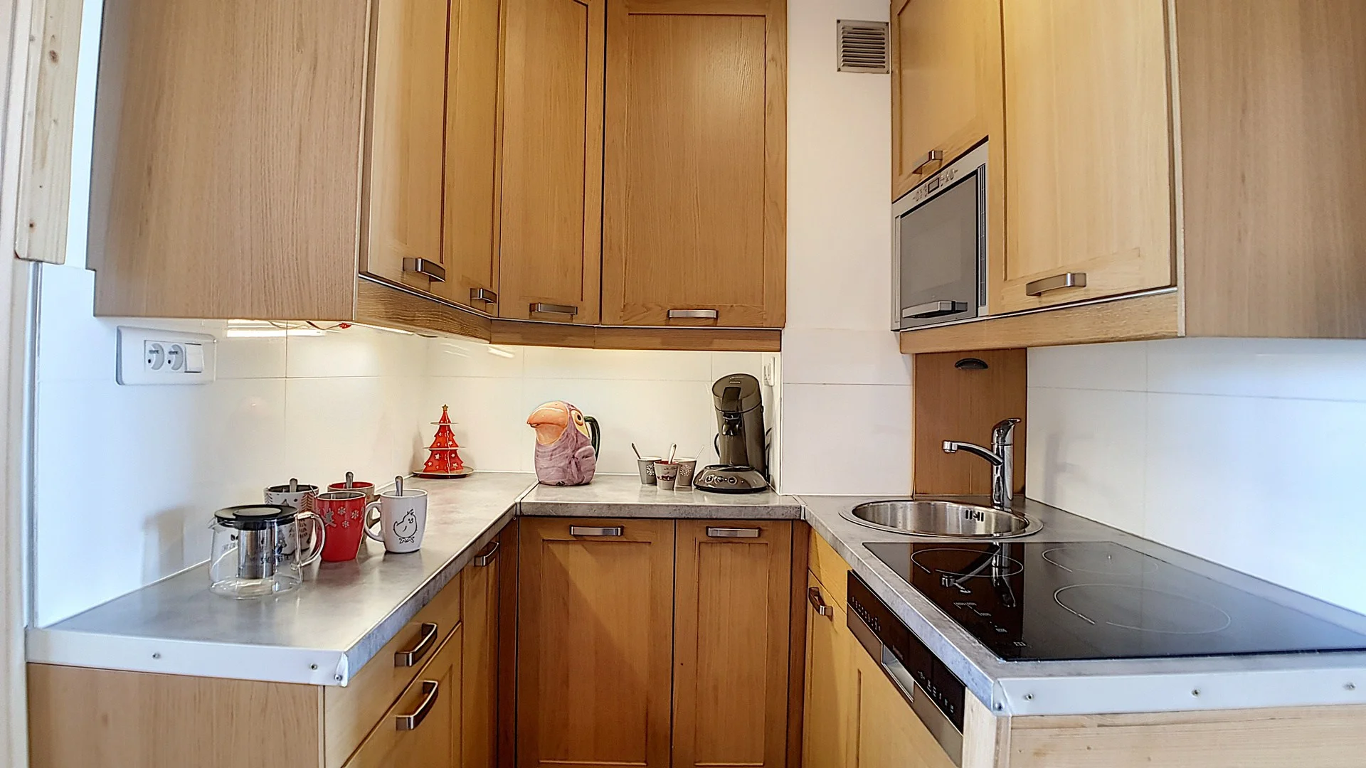 Volledig uitgerust met inductiekookplaat, oven, magnetron, vaatwasser, koelkast, broodrooster, waterkoker, Nespresso-apparaat, koffiezetapparaat, slacentrifuge, sinaasappelpers en raclette-apparaat. Volledige serviesset, bestek, pannen, kookgerei en alle noodzakelijke keukentextiel aanwezig.