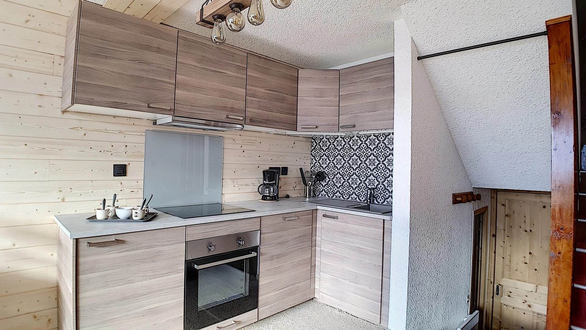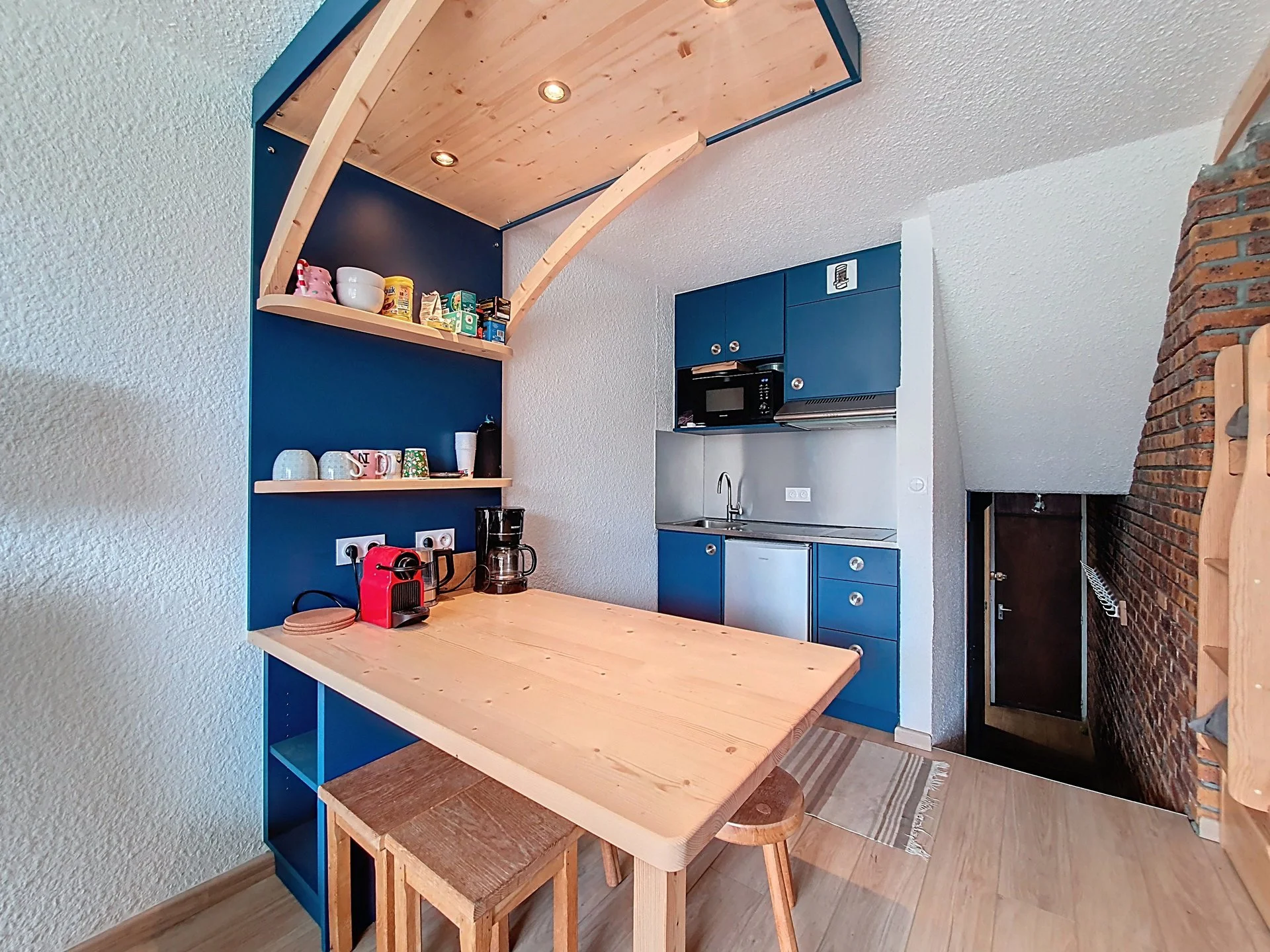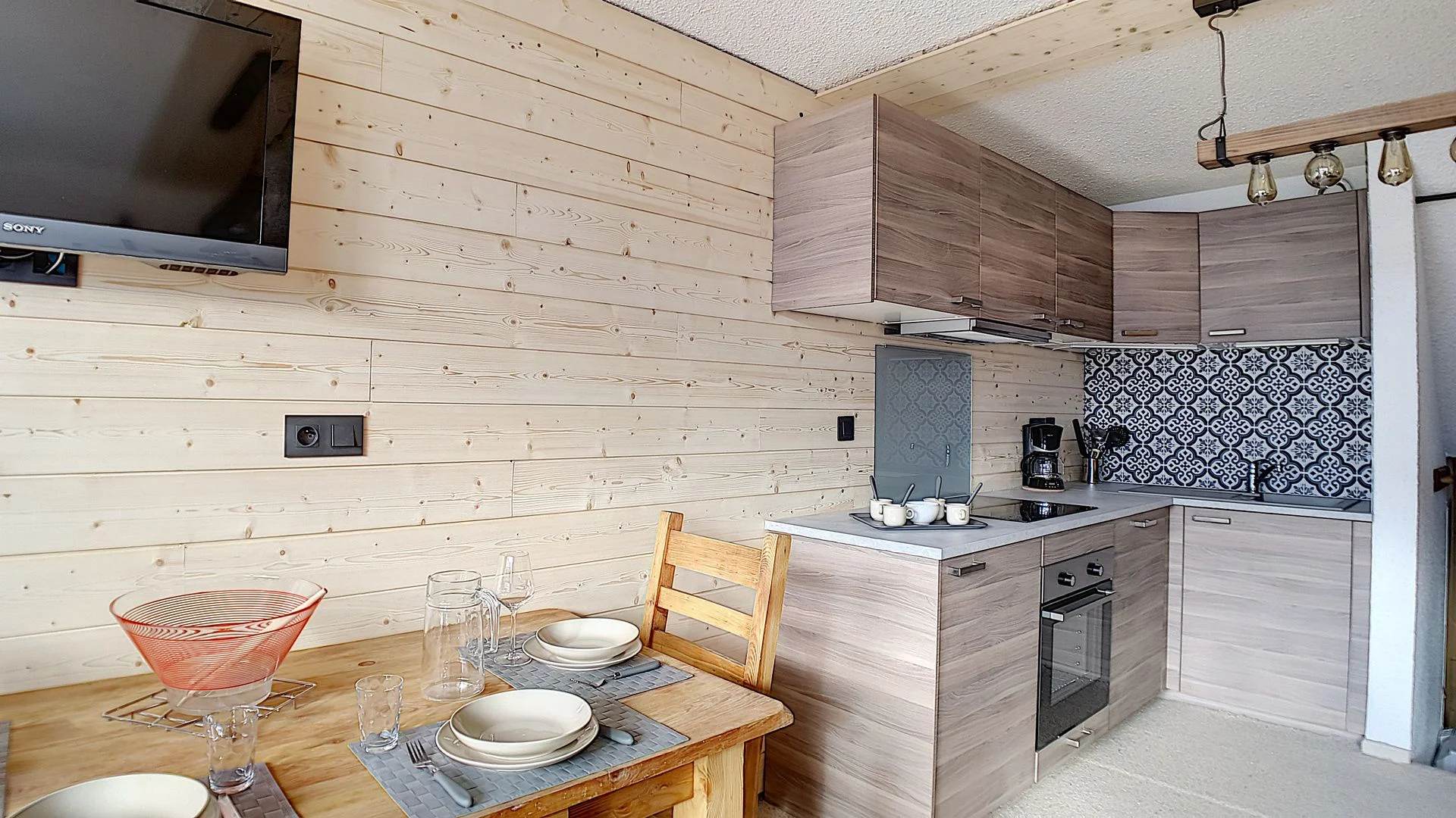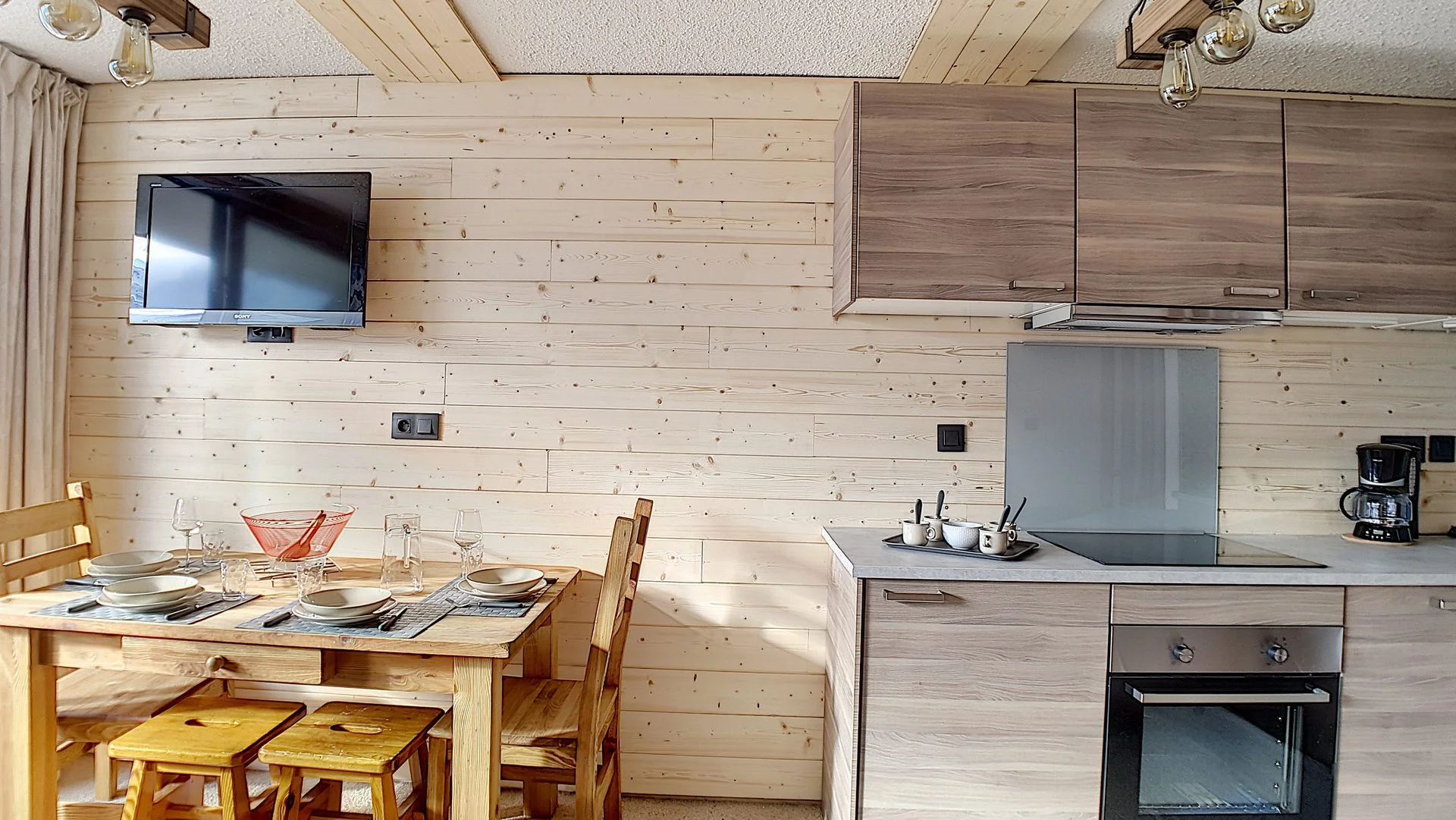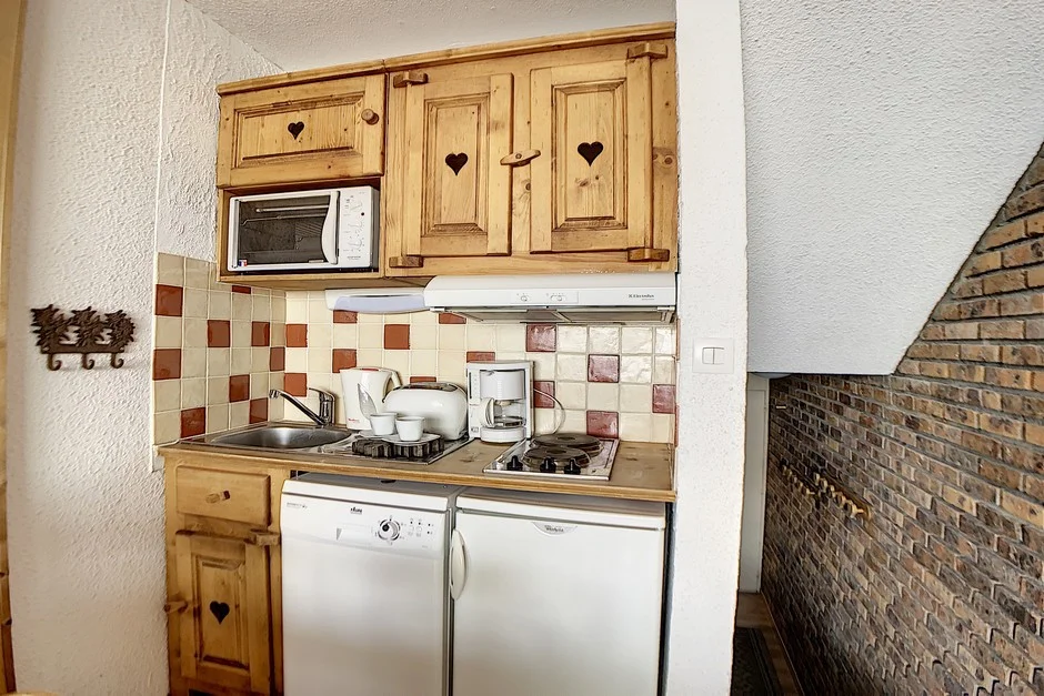 Inductiekookplaat, oven met grill, vaatwasser, magnetron, koelkast, waterkoker, broodrooster, Nespresso-apparaat, koffiezetapparaat, raclette-apparaat, fondue-set met pannetje, crêpepan, pannenkoekmaker, wafelijzer, blender, citruspers, vleeshakker, mixstok en maryse, spatels, fouet, tang voor toast, scheplepels, schuimspaan, snij- en serveerset, saladebeslekken, kaasrasp, flessenopeners, blikopeners, snijplank, snelkookpan, braadpan, 3 steelpannen, 3 koekenpannen, deksels, slacentrifuge, zeef, 2 broodmanden, afdruiprek, 2 bladen, maatbeker, schalen, serveerschotels, ovenschalen, 2 tartevormen, 3 cakevormem, 2 theekannen, tafellinnen en servies (borden, schaaltjes, bekers, mokken, glazen).