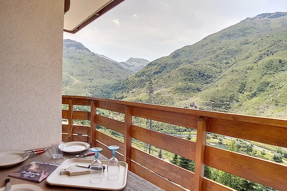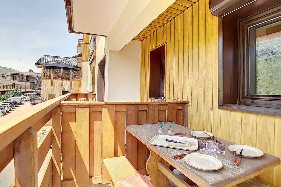 Het appartement heeft een westers gericht balkon met tafel en banken, ideaal voor het genieten van de berglucht.