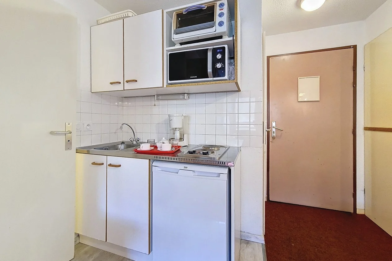 Het appartement is voorzien van een volledig uitgeruste kitchenette met inductiekookplaat, oven, magnetron, koelkast, vaatwasser, koffiezetapparaat, waterkoker, broodrooster, raclette-apparaat en fondue-set. Verder beschikt de keuken over compleet servies, bestek, pannen, kookgerei en al het benodigde keukengerei voor een aangenaam verblijf.