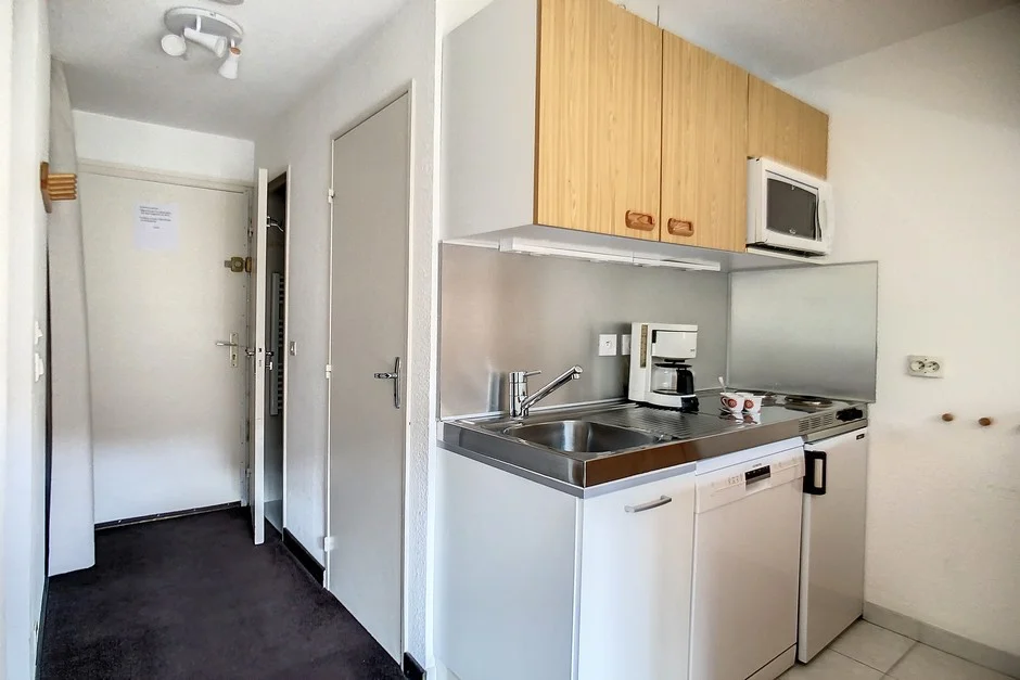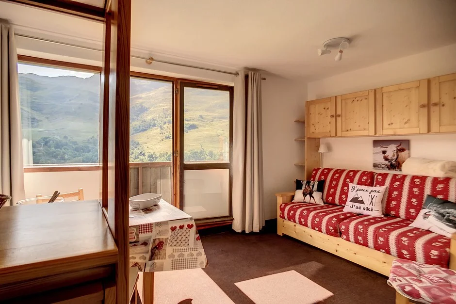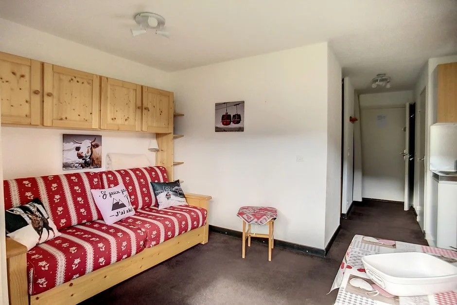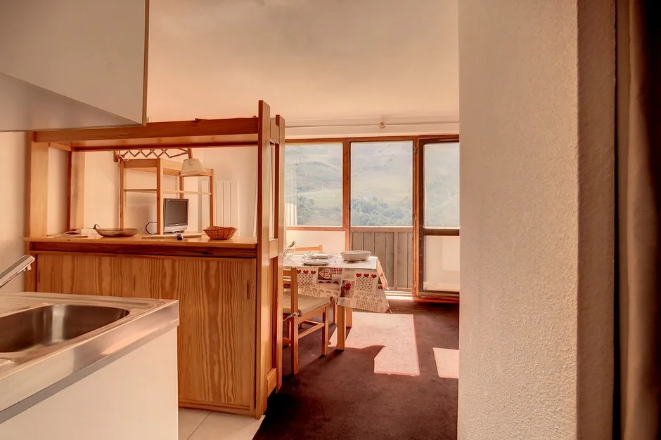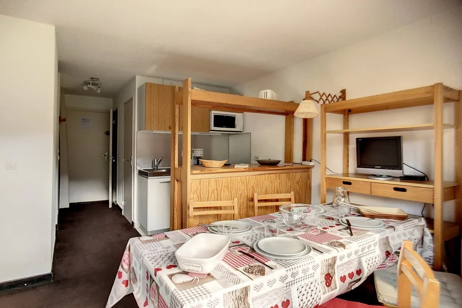 Dit is een compact studioappartement met een gezellige bergsfeer. De ruimte combineert slaapgedeelte, woonkamer en keuken in één open ruimte van 25 vierkante meter.
