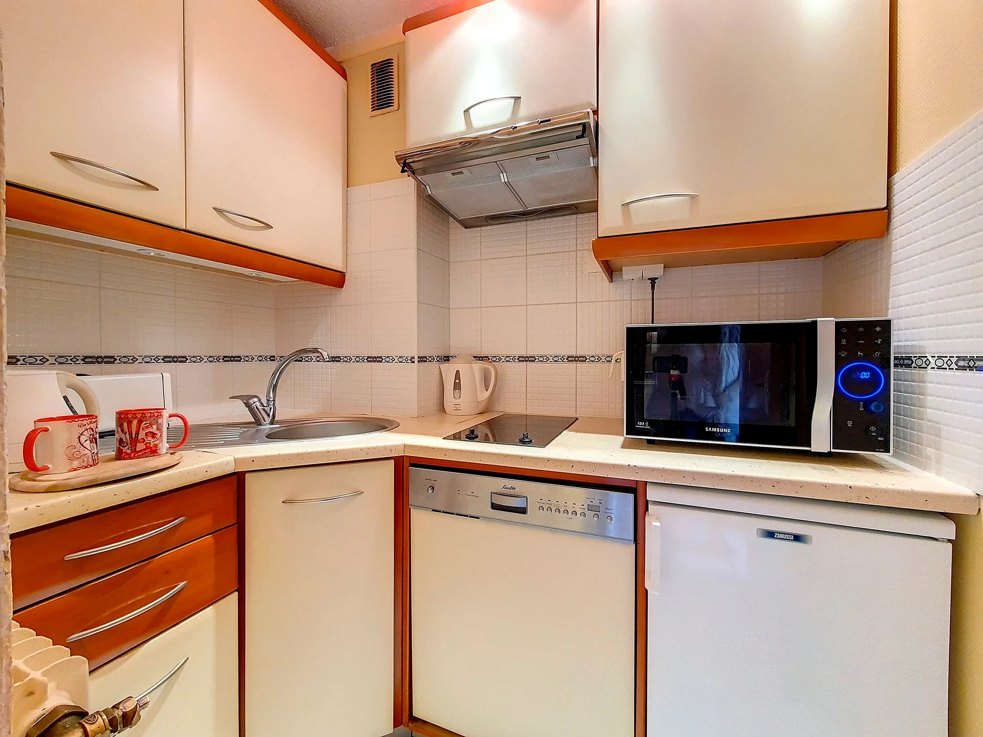 De open keuken is voorzien van een inductiekookplaat, vaatwasser, magnetron, koelkast, oven, waterkoker, broodrooster, Nespresso-apparaat, mixer en diverse keukenapparatuur. Verder zijn er pannen, steelpannen, een fondue-set, raclette-set, crêpepan en compleet servies aanwezig.