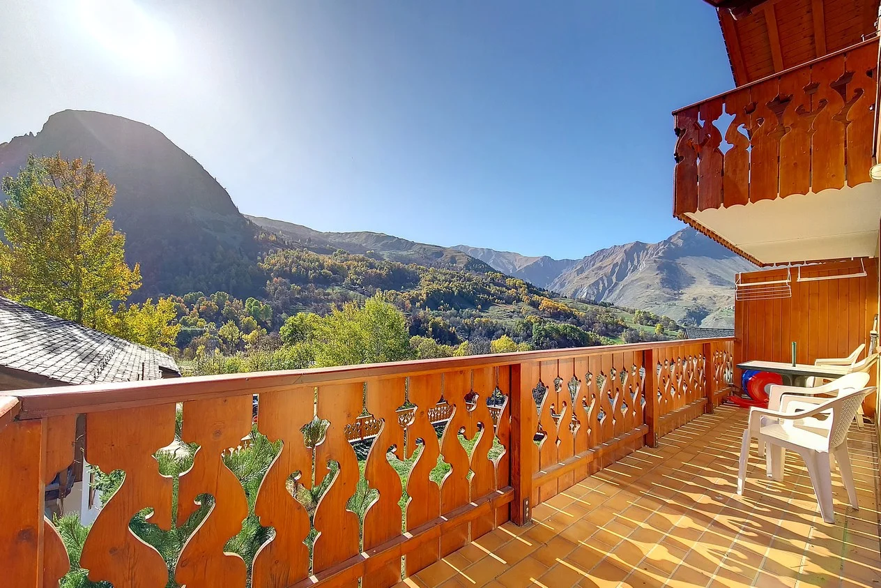 Balkon/terras georiënteerd op zuid en west met uitzicht. Uitgerust met 5 tuinstoelen, kussens en parasol met voet. Tuintafel, barbecue en handdoekenrekken. Thermometer aanwezig.