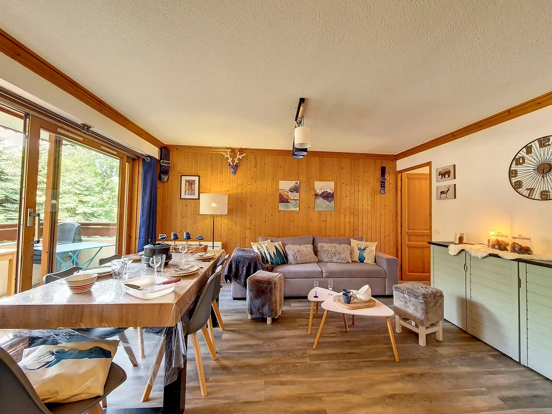 Gezellige woonkamer met zithoek (bank, fauteuil), eethoek met tafel en stoelen, TV met afstandsbediening, DVD-speler, boeken en spellen.
