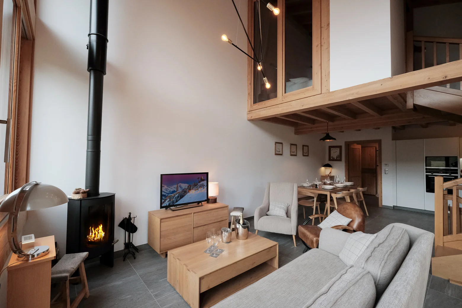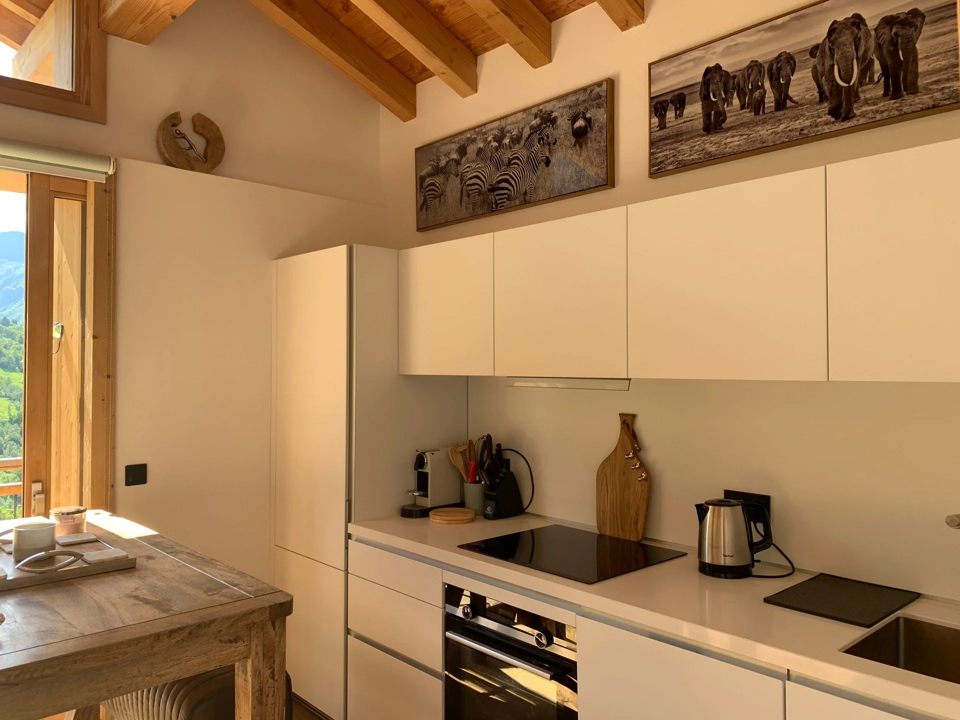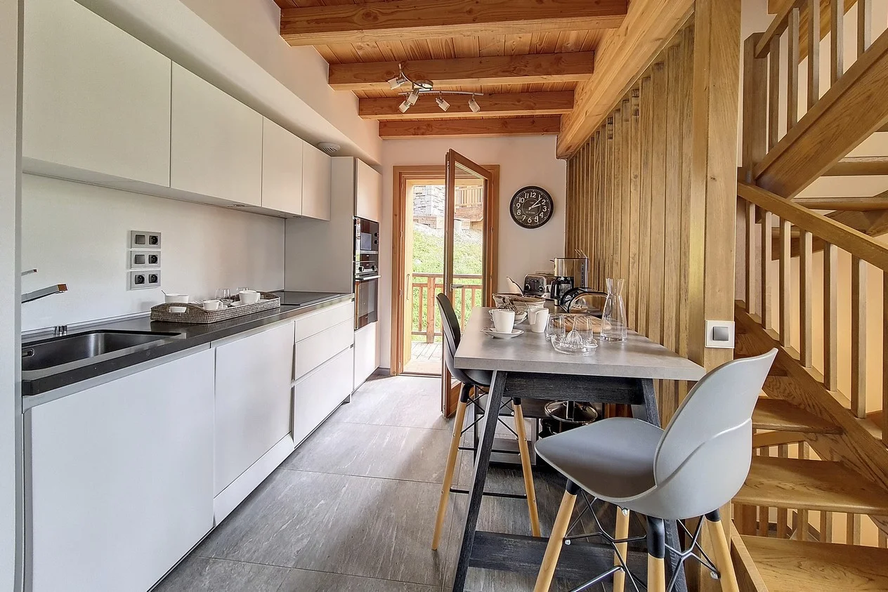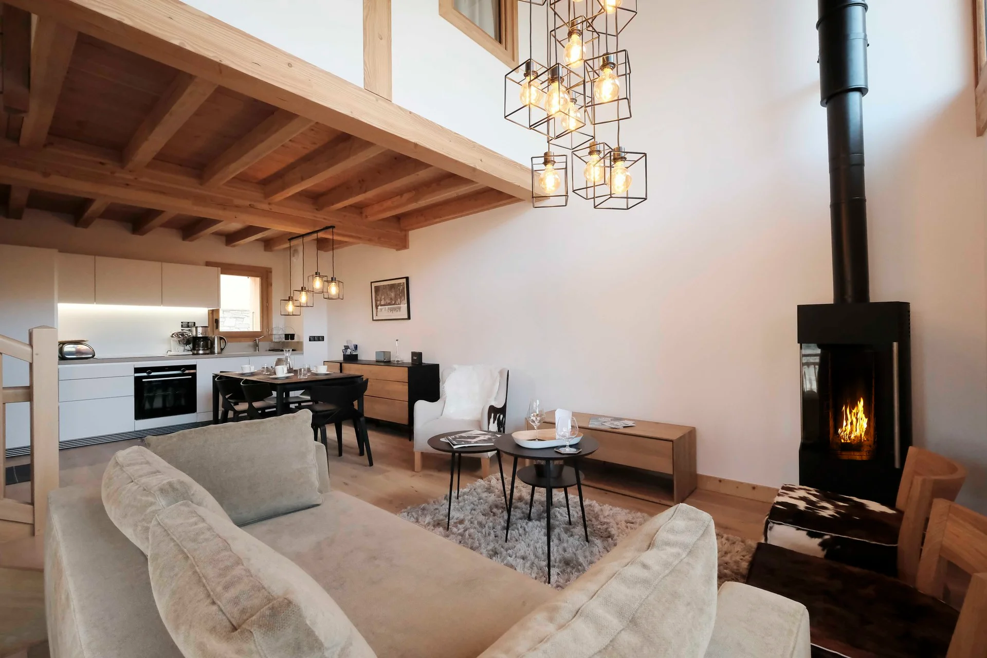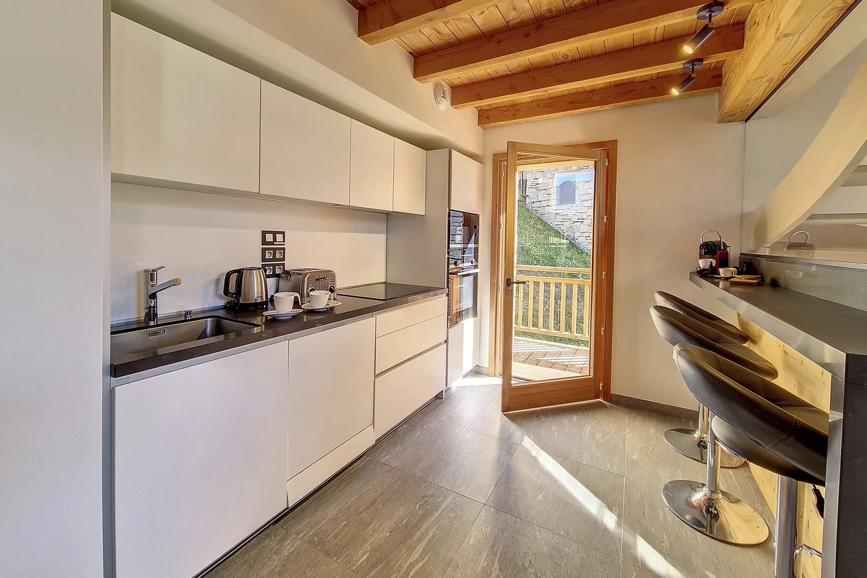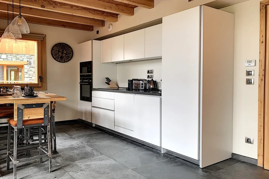 Gezellige woonkamer met TV, Orange-box aansluiting en 2 afstandsbedieningen, zithoeken met 3 fauteuils en canapé, 3 salontafels, 8 stoelen, tafel, 6 onderzetters, speelplaid, Marshall-speaker, houten houtmand, schapenvacht en decoratieve houders. Elektrische induction kookplaat (3 pitten) Siemens, oven, broodrooster Cuisinart, elektrische hachoir WMF, espresso-apparaat illy, filterkoffiezetapparaat HKoenig, vaatwasser Siemens en koelkast met vriesvak.