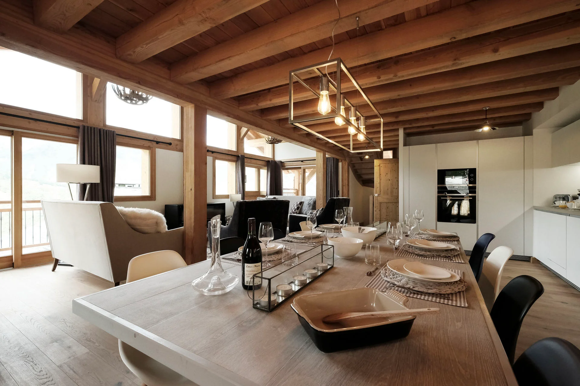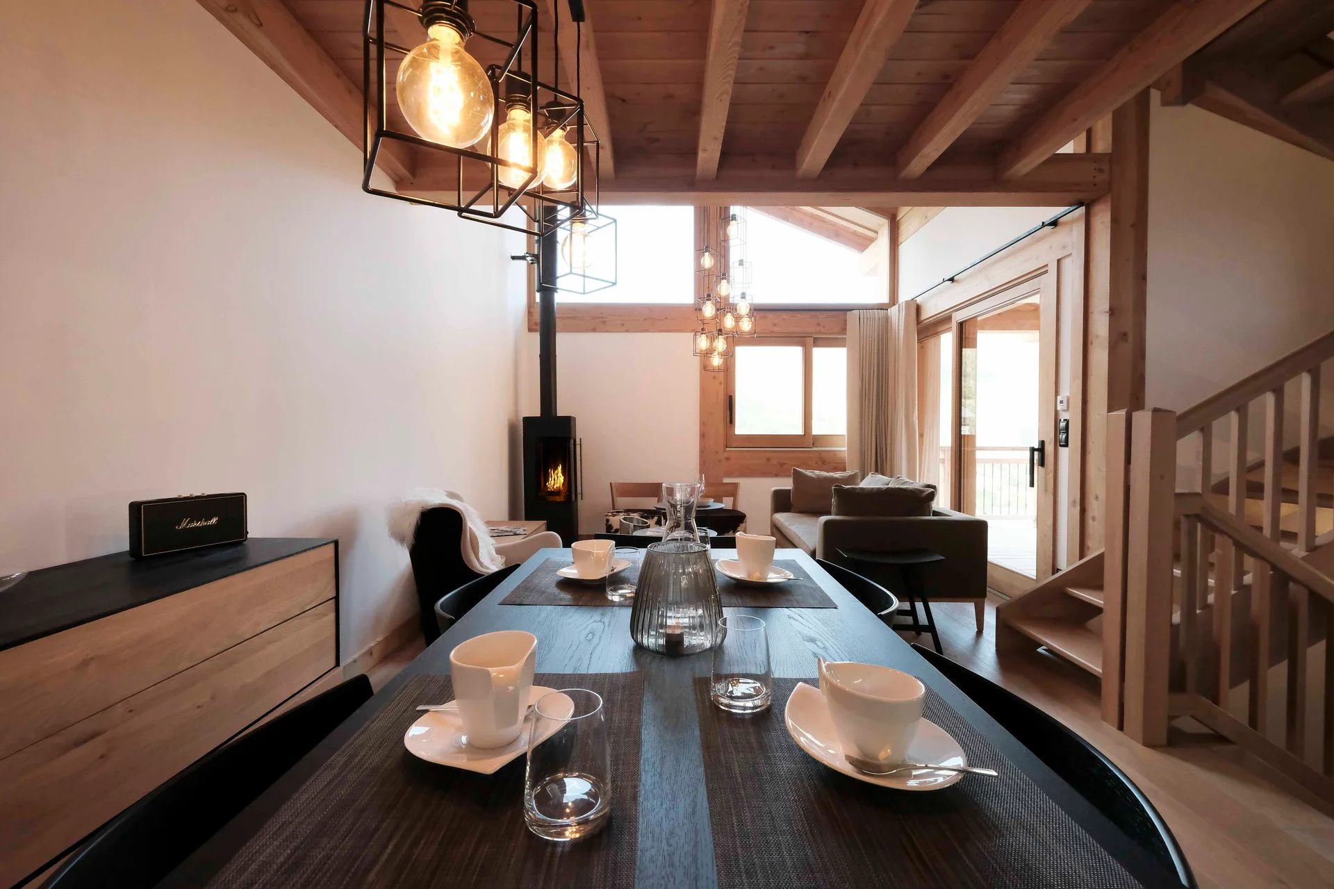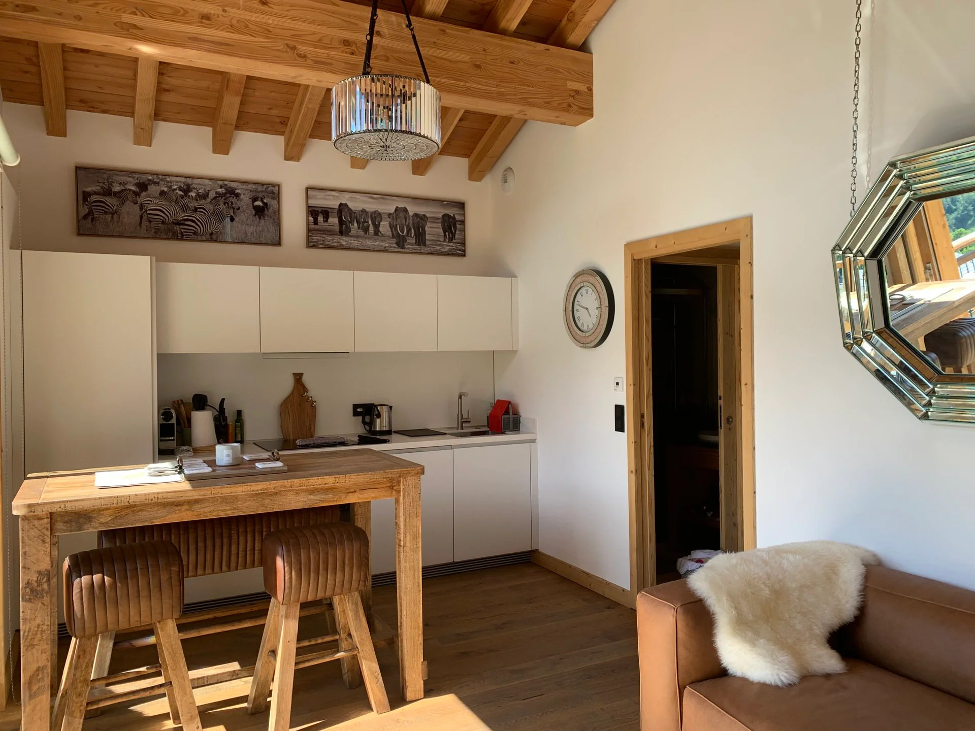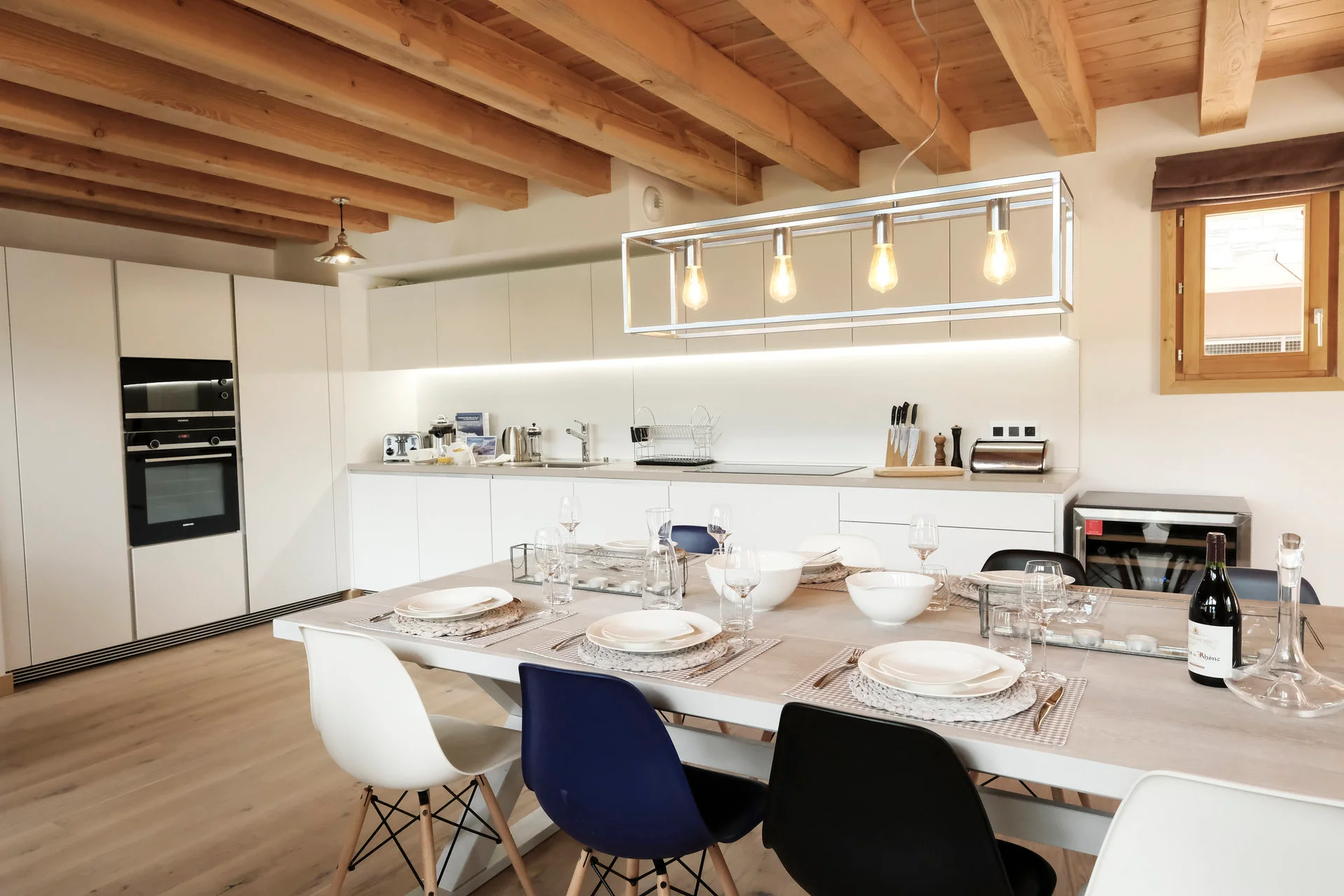 Gezellige woonkamer met TV, Orange-box aansluiting en 2 afstandsbedieningen, zithoeken met 3 fauteuils en canapé, 3 salontafels, 8 stoelen, tafel, 6 onderzetters, speelplaid, Marshall-speaker, houten houtmand, schapenvacht en decoratieve houders. Elektrische induction kookplaat (3 pitten) Siemens, oven, broodrooster Cuisinart, elektrische hachoir WMF, espresso-apparaat illy, filterkoffiezetapparaat HKoenig, vaatwasser Siemens en koelkast met vriesvak.