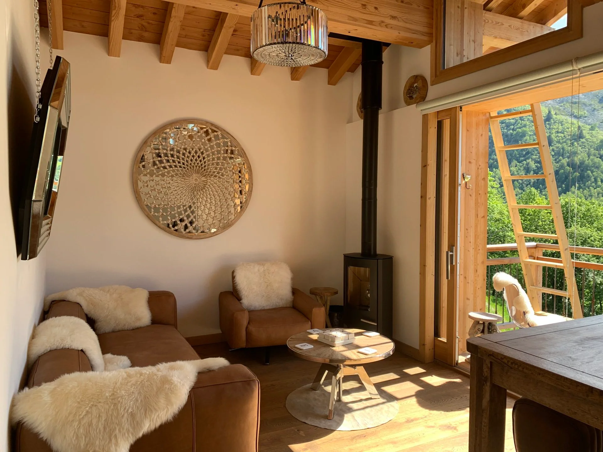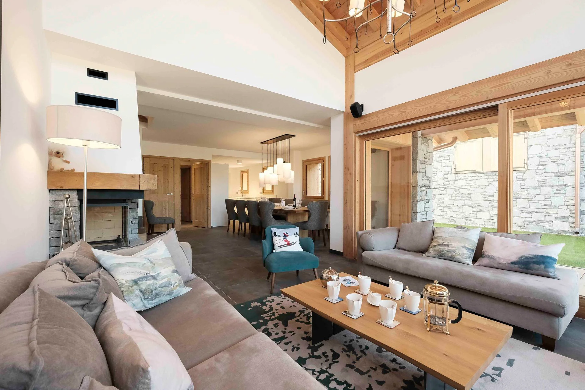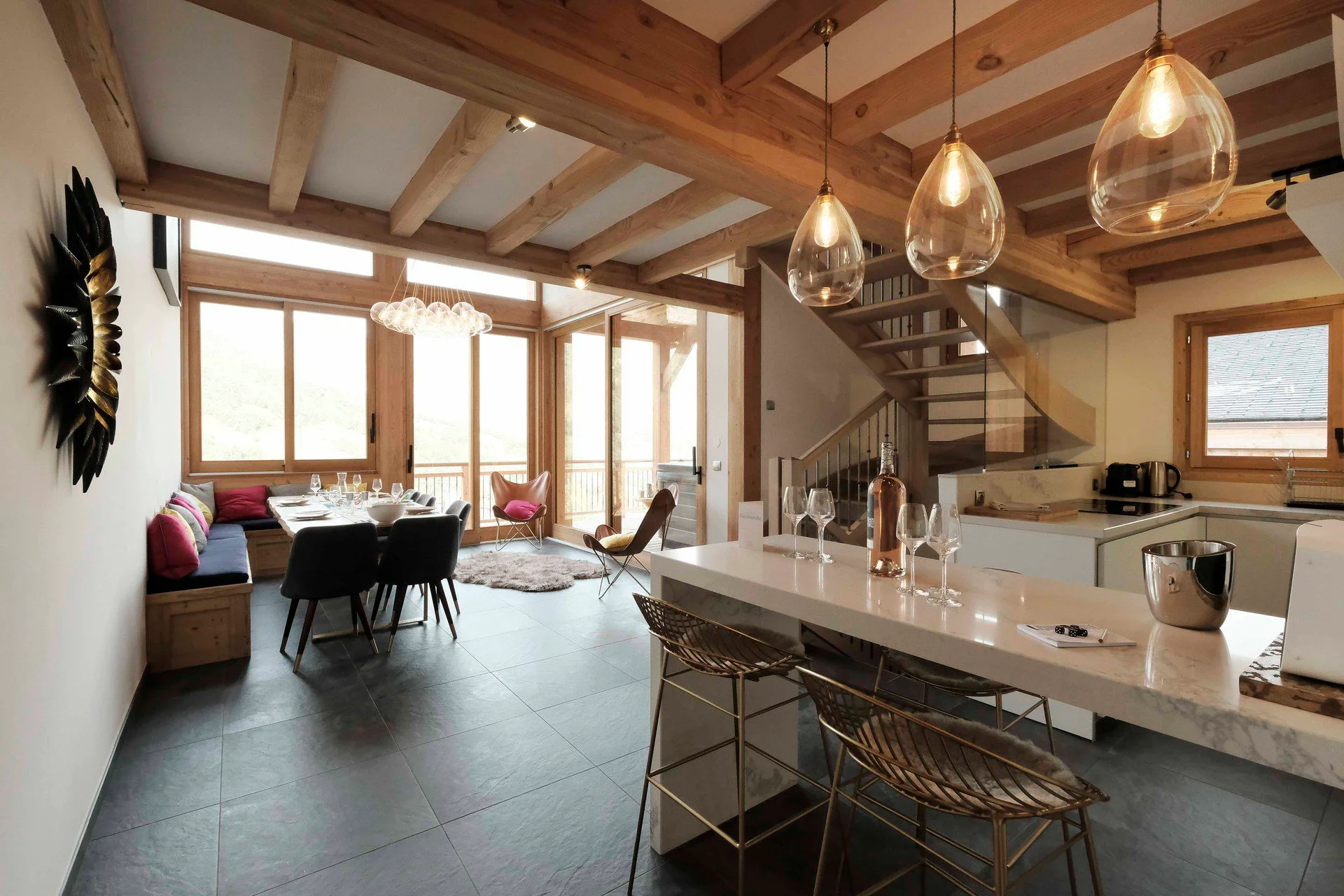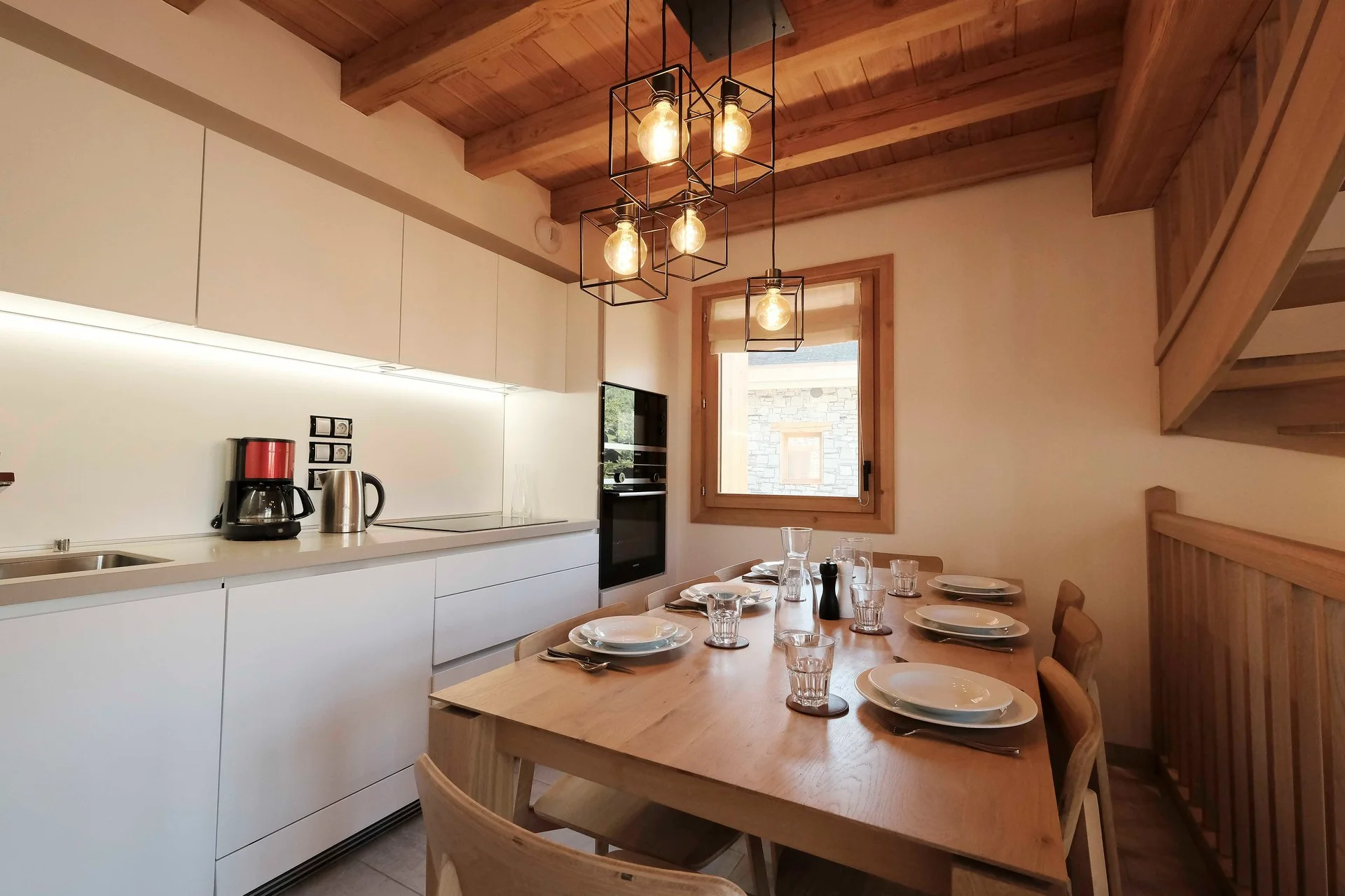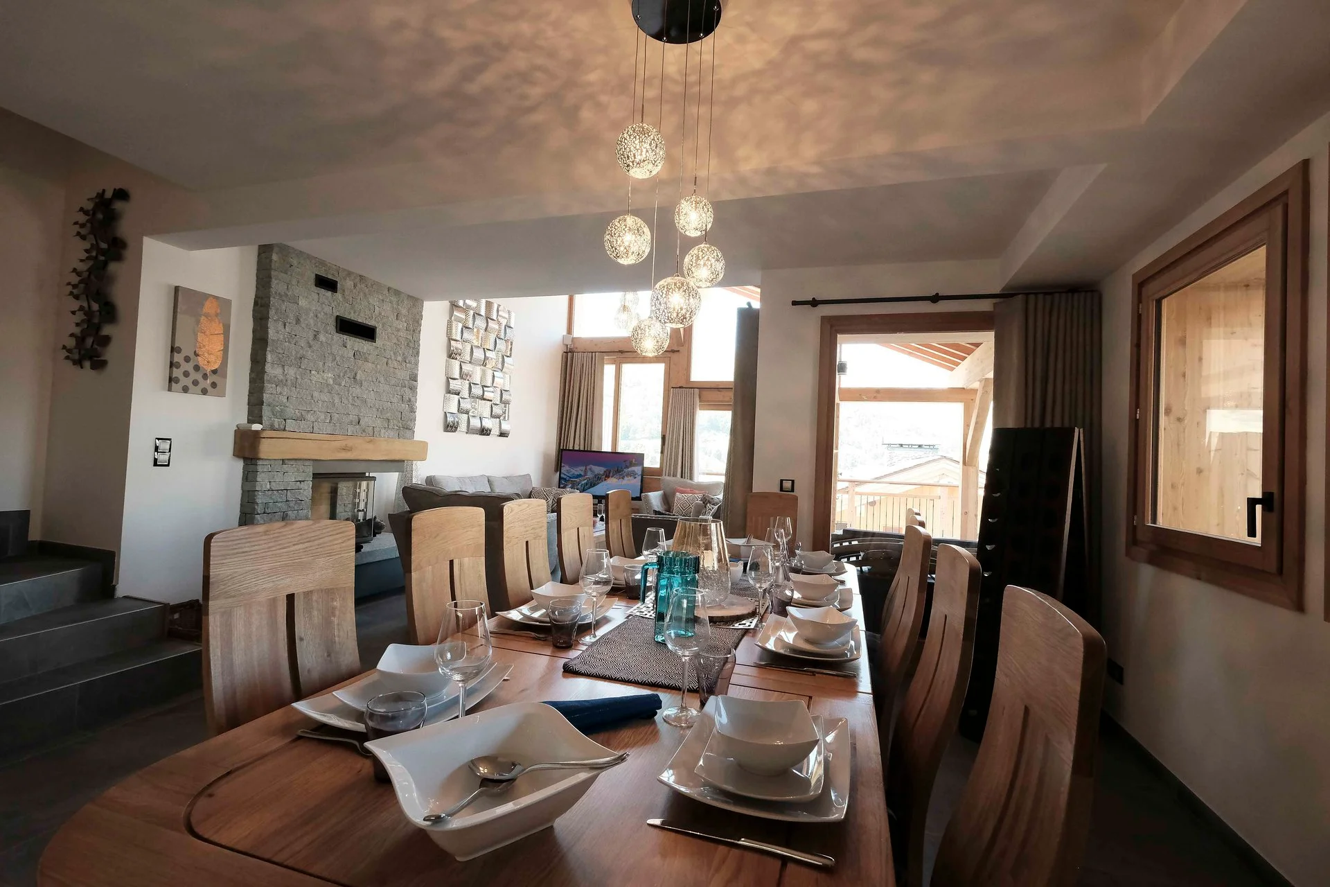 Gezellige woonkamer met TV, Orange-box aansluiting en 2 afstandsbedieningen, zithoeken met 3 fauteuils en canapé, 3 salontafels, 8 stoelen, tafel, 6 onderzetters, speelplaid, Marshall-speaker, houten houtmand, schapenvacht en decoratieve houders. Elektrische induction kookplaat (3 pitten) Siemens, oven, broodrooster Cuisinart, elektrische hachoir WMF, espresso-apparaat illy, filterkoffiezetapparaat HKoenig, vaatwasser Siemens en koelkast met vriesvak.