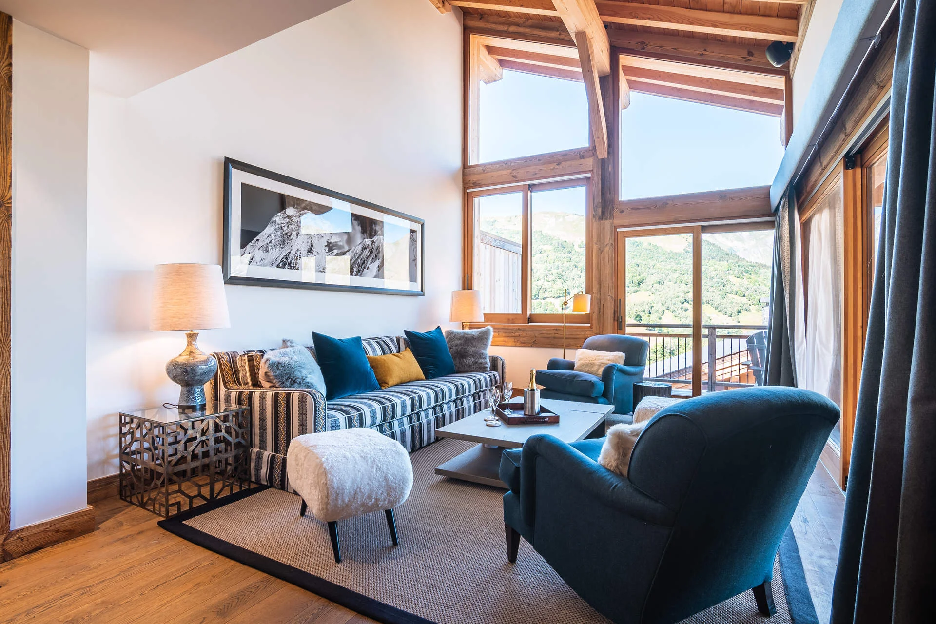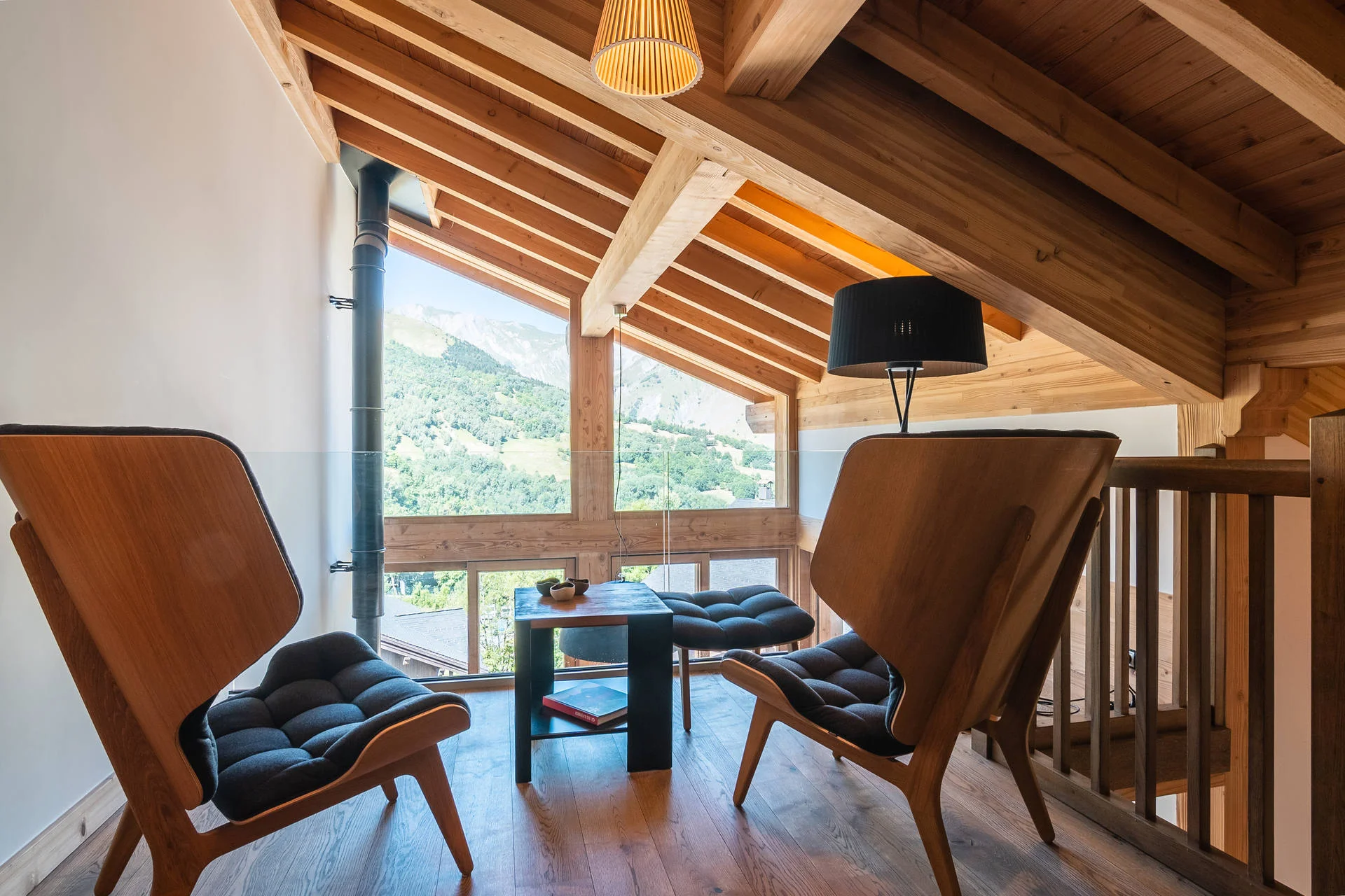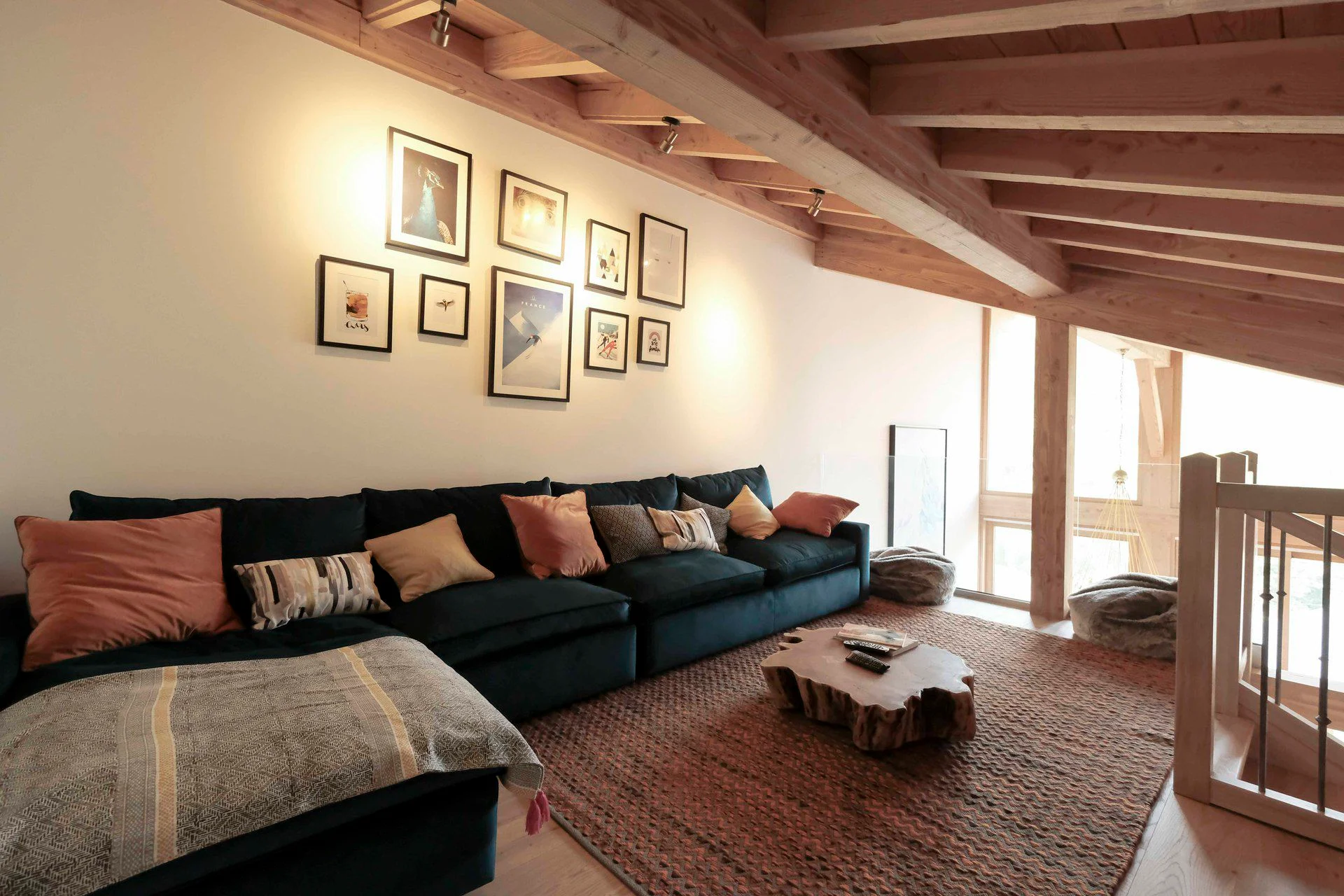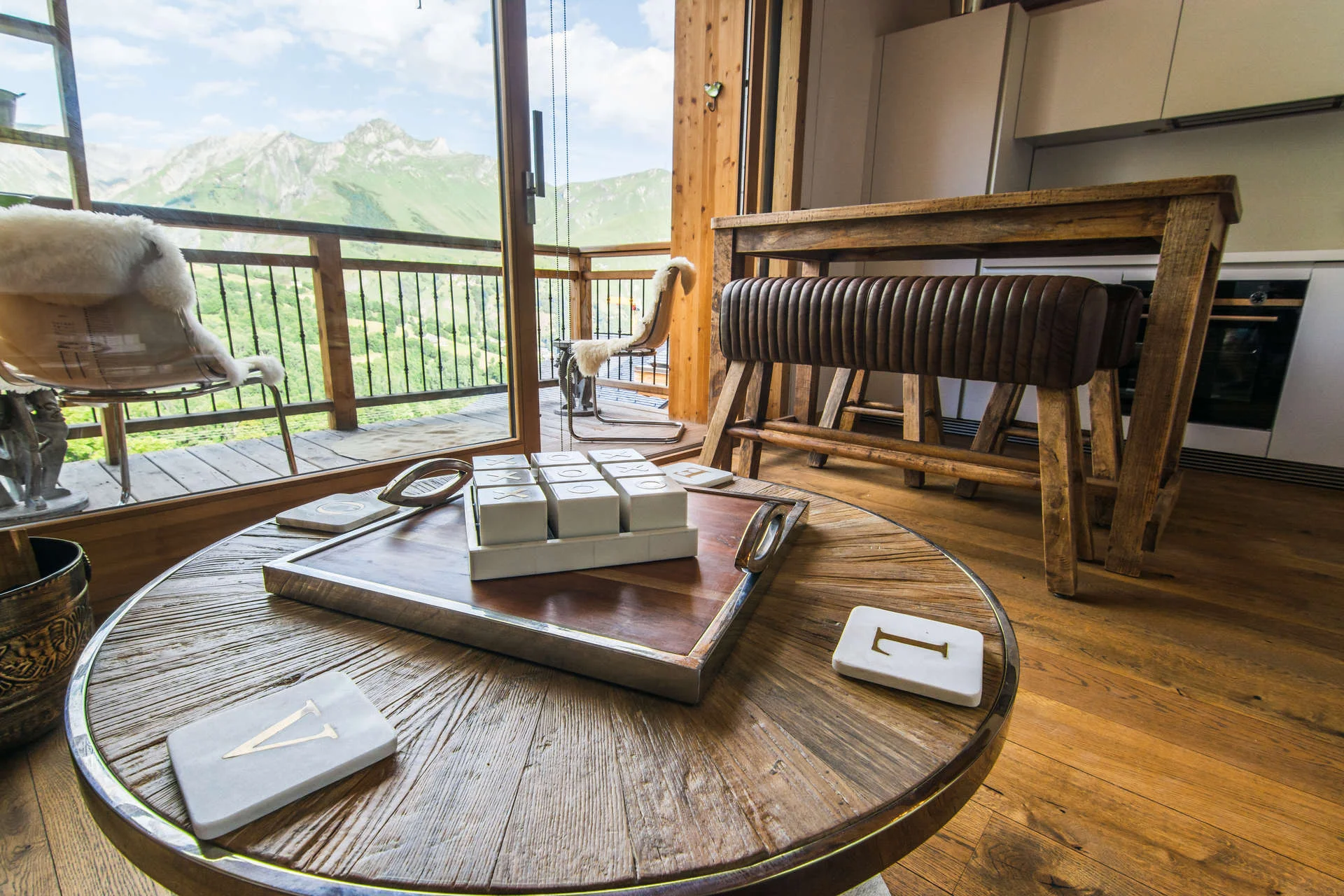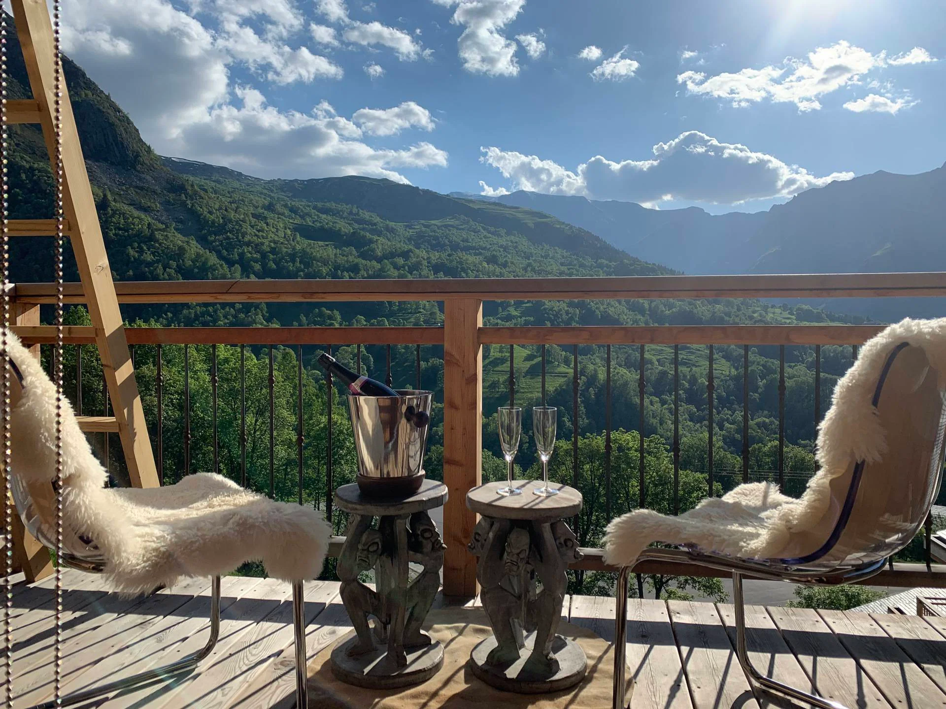 Balkon aan de westkant met balkonmeubels, gezellige salontafel, fotofoor en decoratieve accessoires.