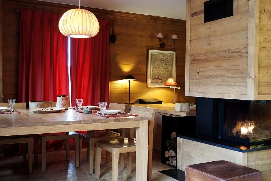 Gezellige woonkamer met open haard en complete haardset. Modern interieur met TV, DVD-speler, audioapparatuur (Bose-soundsysteem), boeken en bordspellen. Eetkamer met grote tafel, stoelen en bankje.