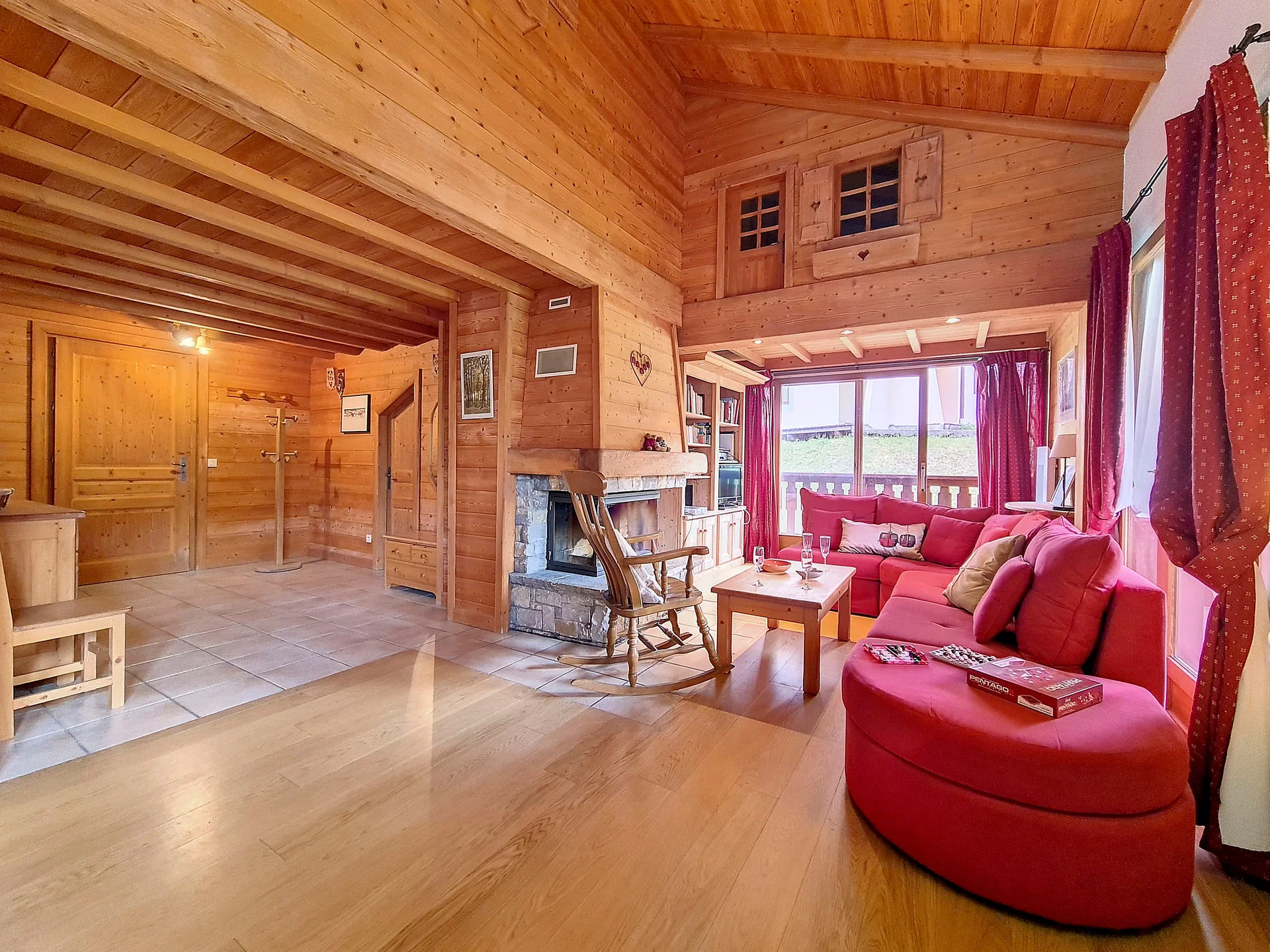 Ruime woonkamer met zitplaatsen, salontafel, tv met dvd-speler, stereo met speakers, haard met toebehoren, boeken en gezelschapsspelen.