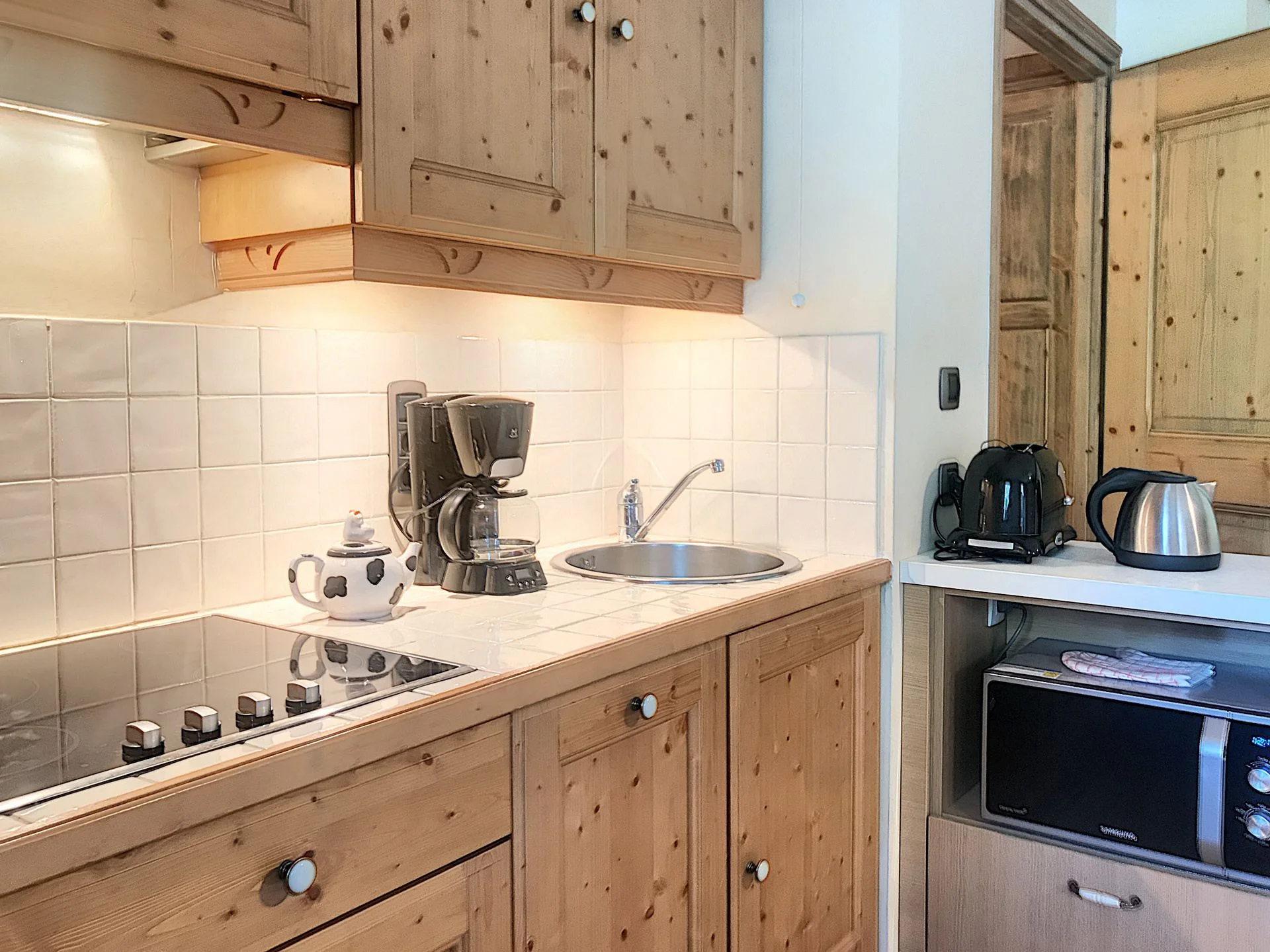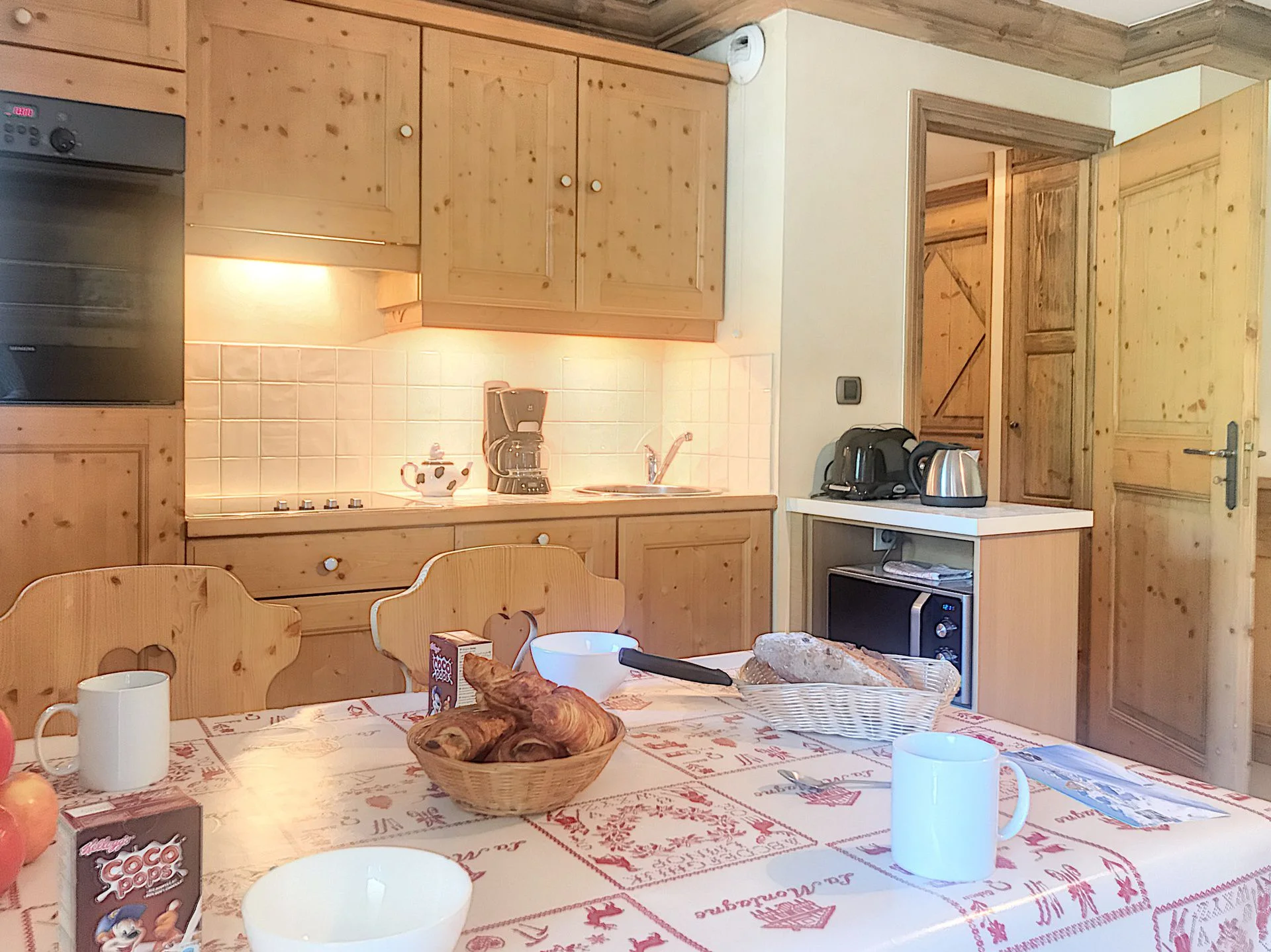 De keuken is voorzien van een inductiekookplaat (4 pitten), oven, magnetron, koelkast, vaatwasser, broodrooster, waterkoker, sinaasappelpers en alle noodzakelijke keukenbenodigdheden. Het servies omvat borden, kommen, glazen, bestek, pannen en kookgerei.