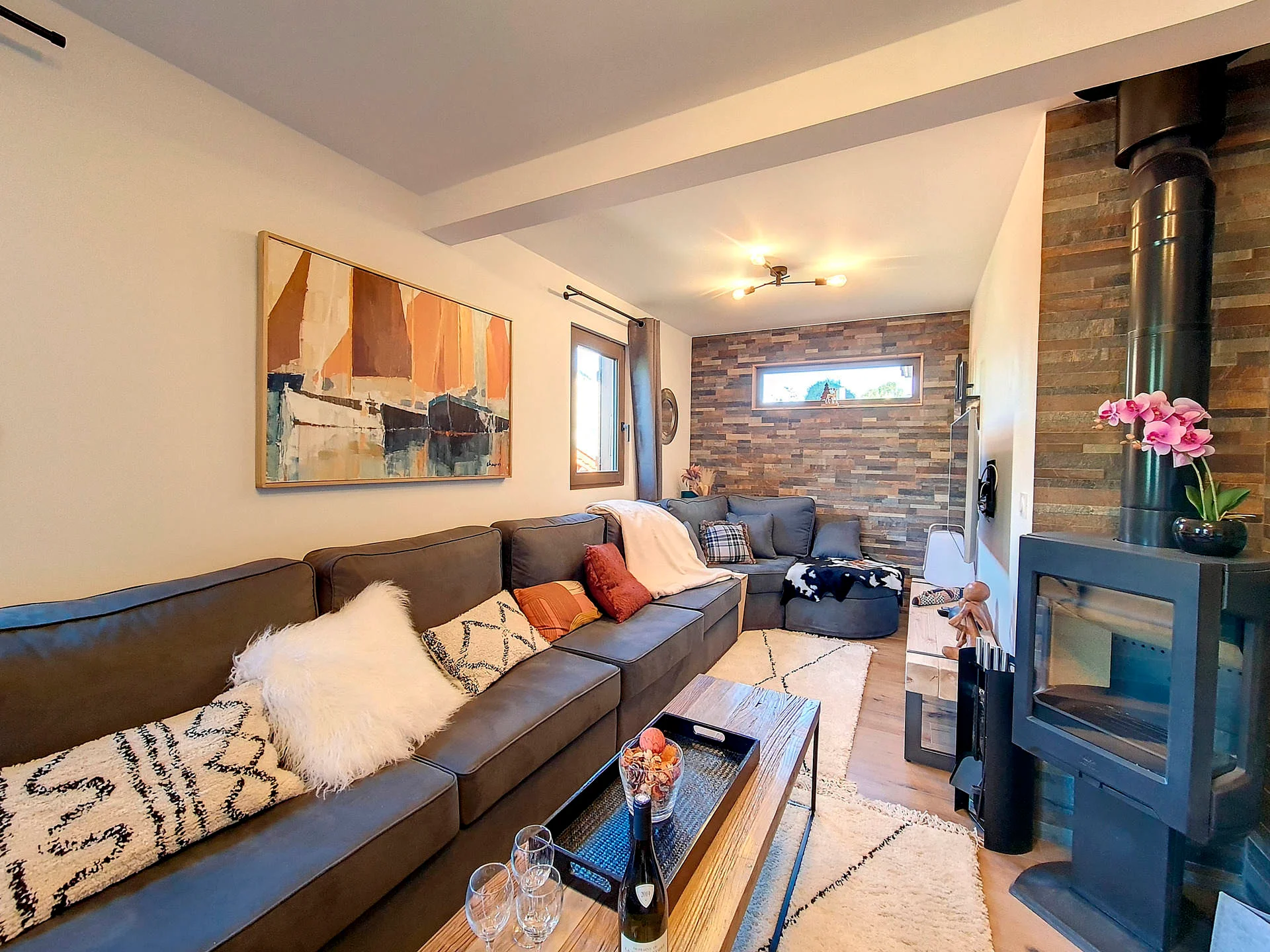 Gezellige woonkamer met open haard, televisie met dvd-speler, grote hoekbank (canapé d'angle) en zithoeken. De woonkamer is voorzien van decoratieve elementen en schappen. Hier kun je ontspannen en tijd doorbrengen met elkaar.