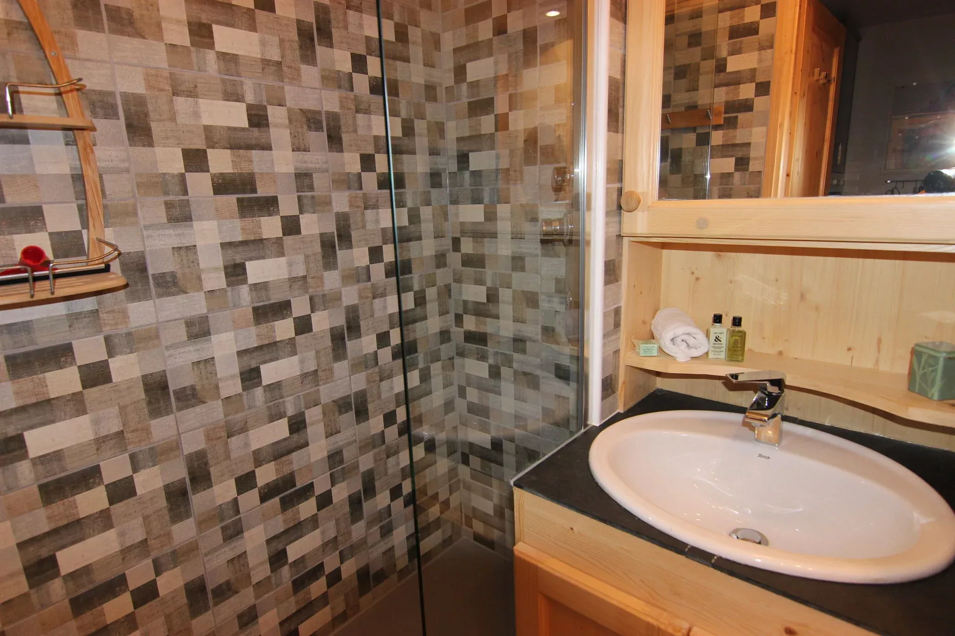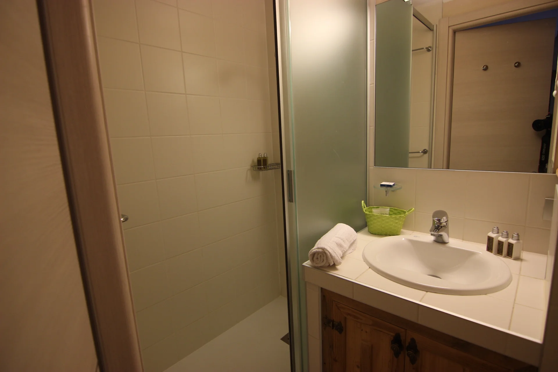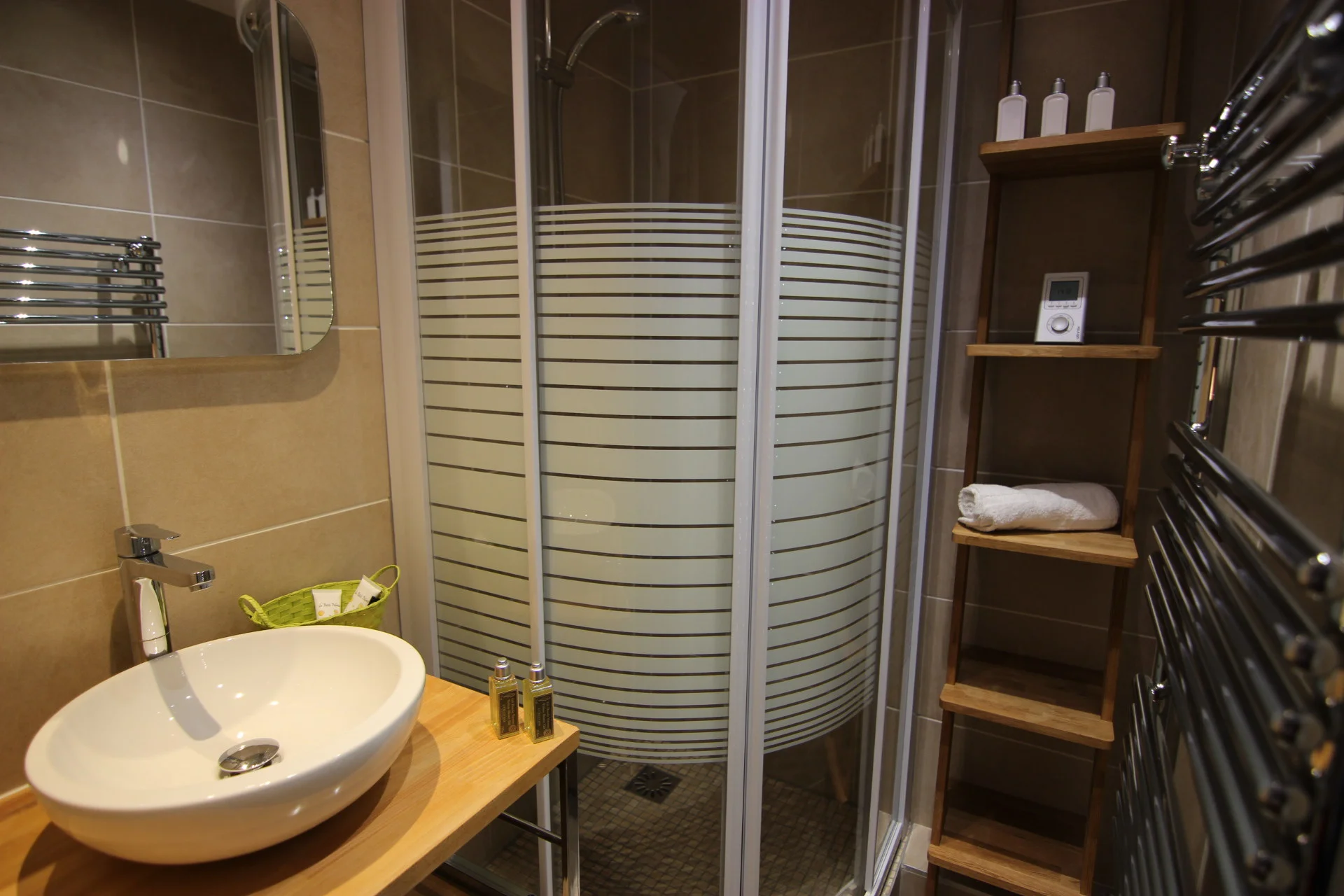 Badkamer met doucheruimte, wastafel en elektrische handdoekverwarmer. Apart toilet met een compleet pakket sanitaire voorzieningen.