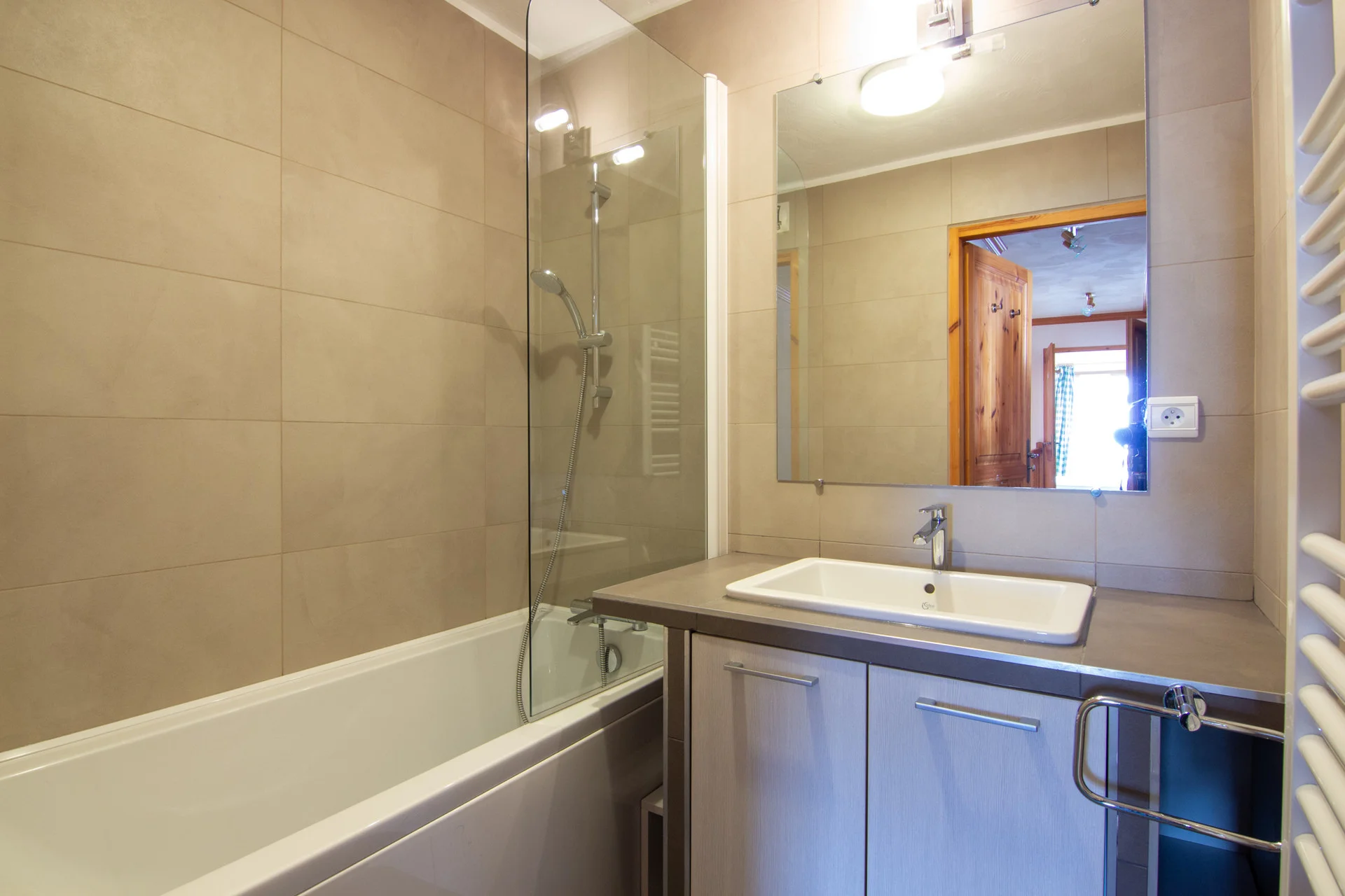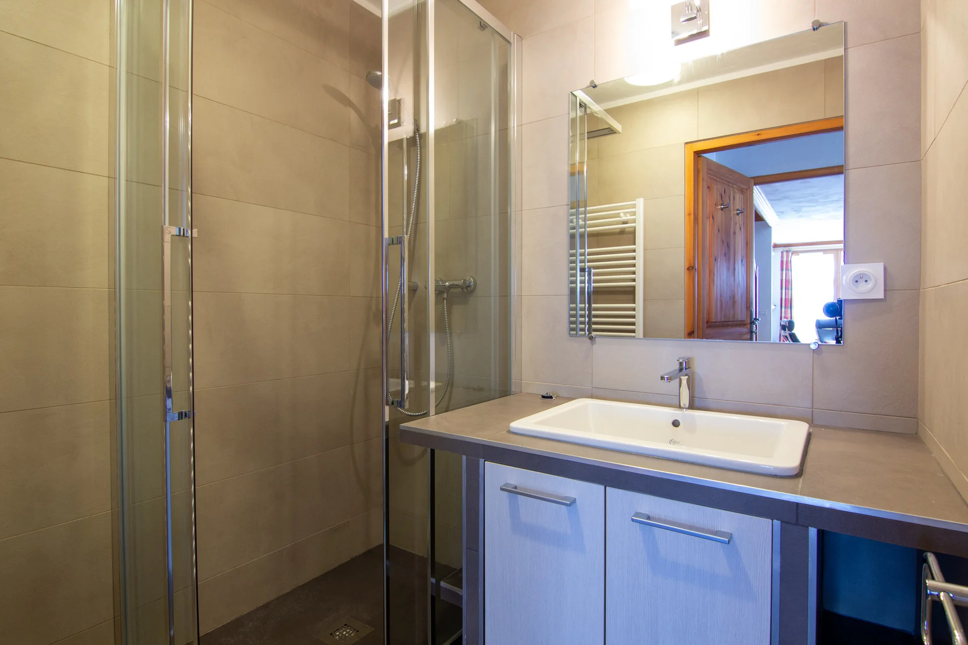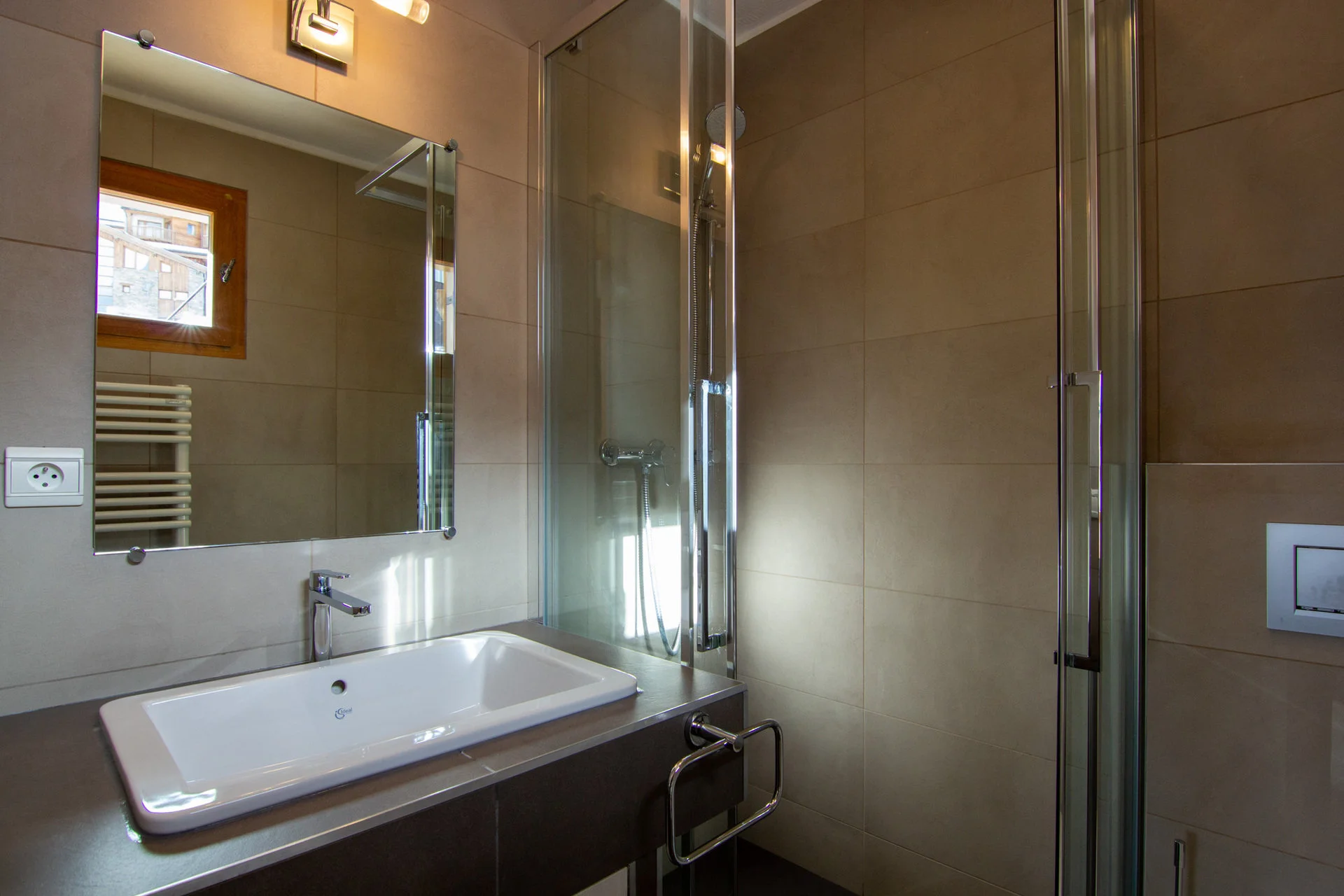 Het chalet beschikt over meerdere badkamers. Alle badkamers zijn voorzien van een doucheruimte met glazen wand, wastafels, handdoekradiators en toilet.