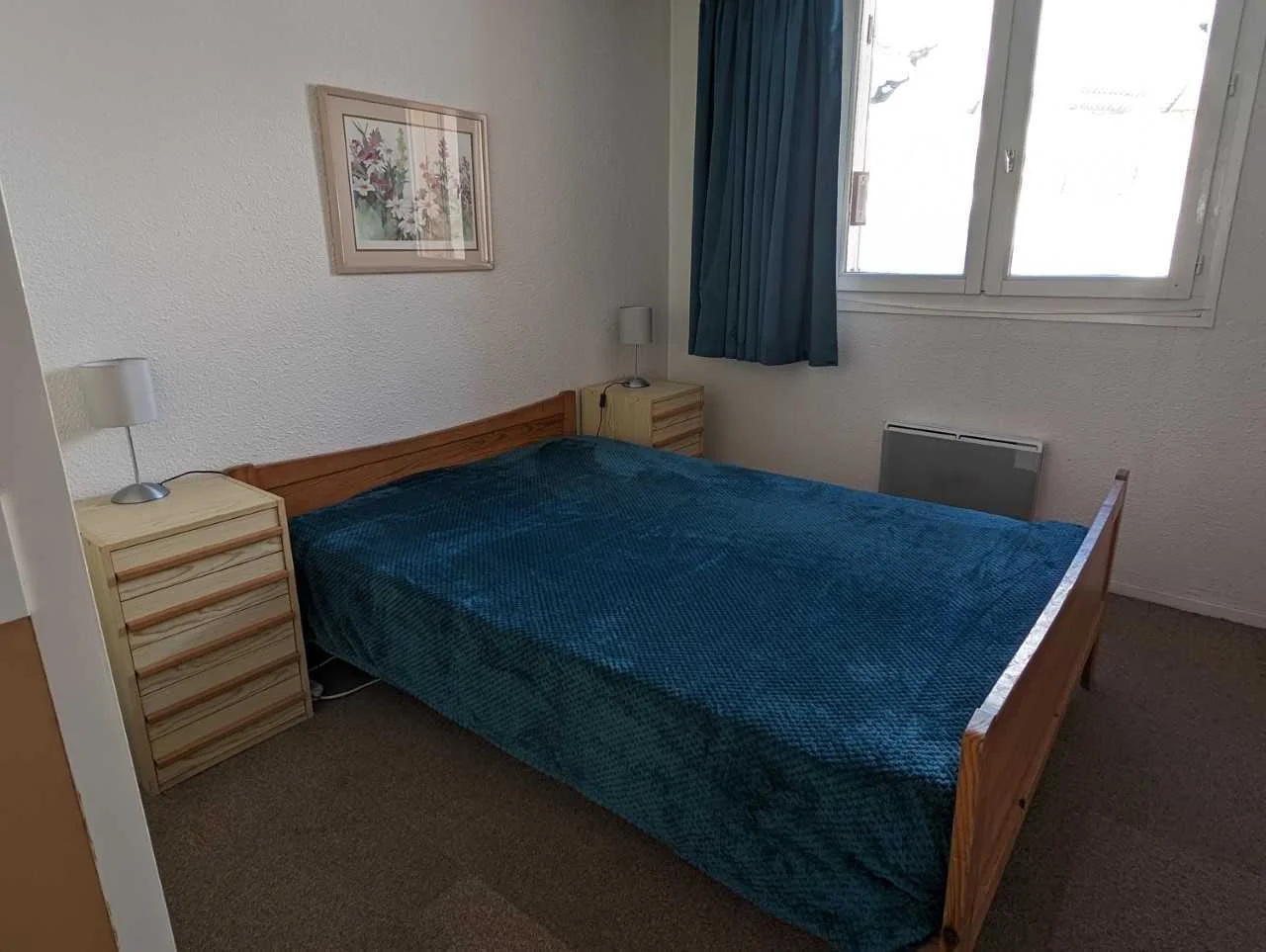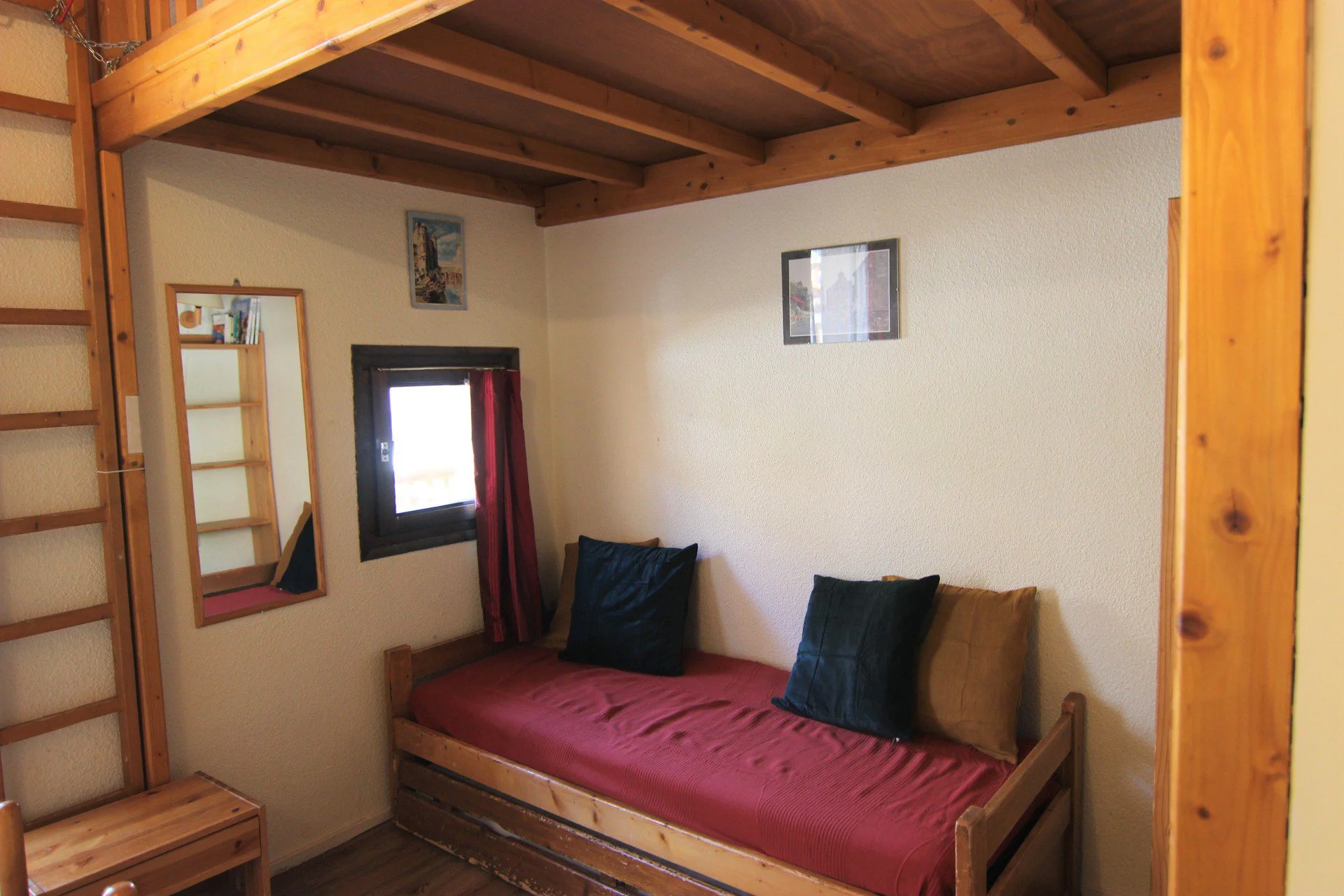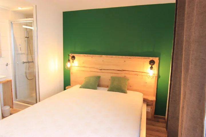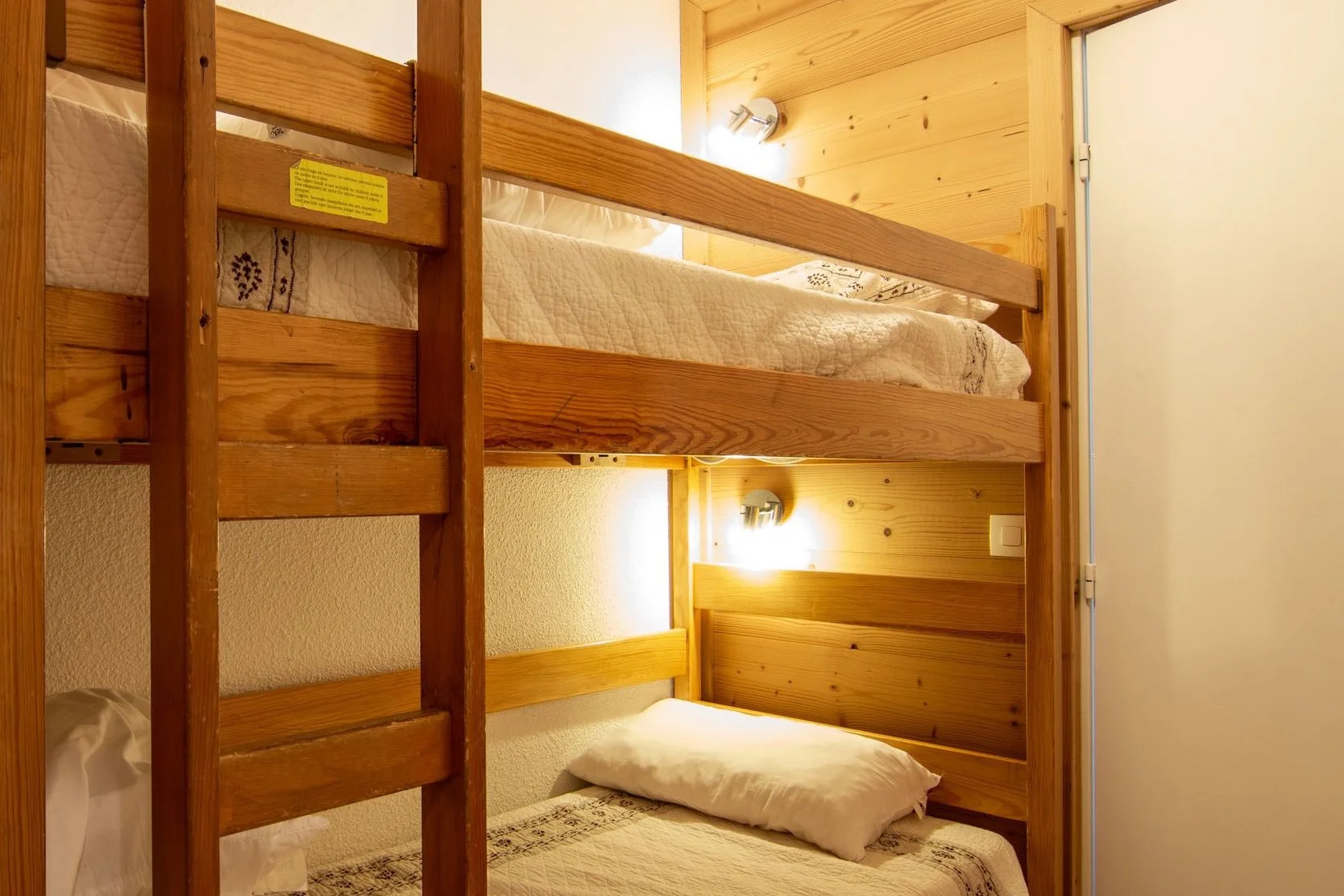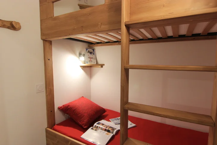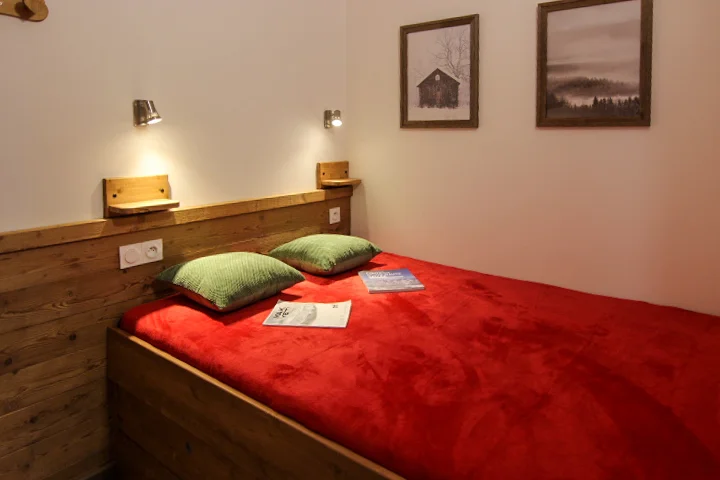De slaapkamer bevat een tweepersoonsbed en een stapelbed. De ruimte beschikt over twee armoires voor opberging, en ramen met twee luiken voor optimale lichtregie.
