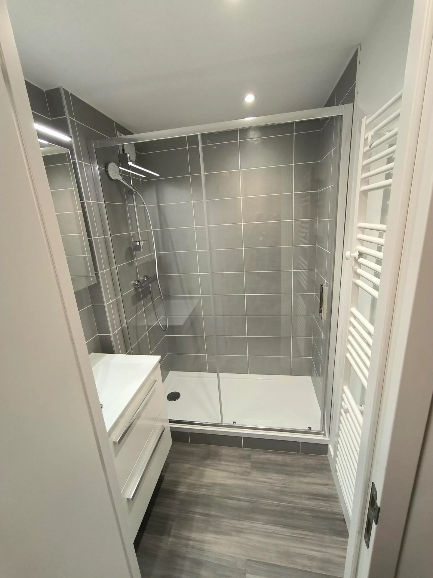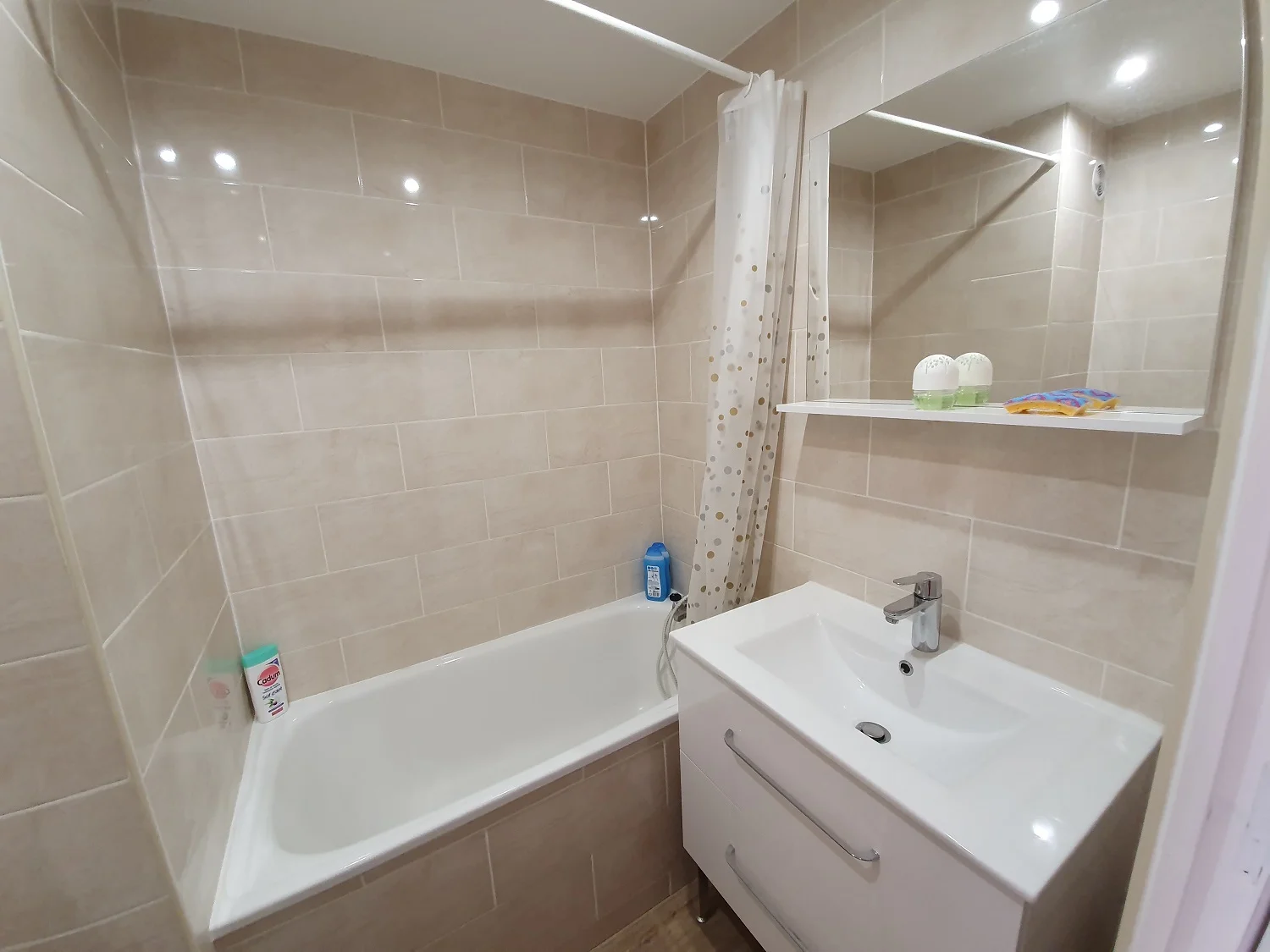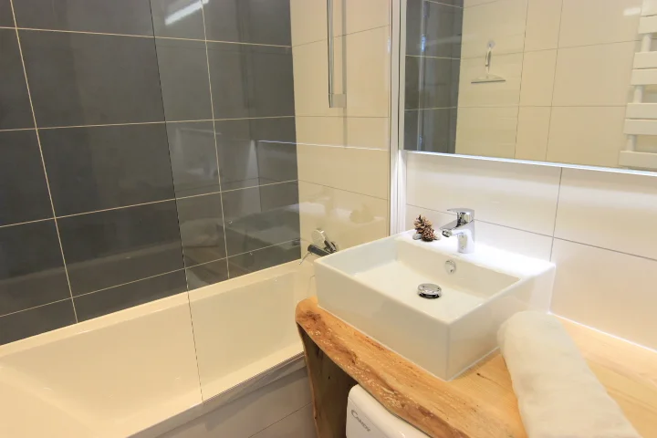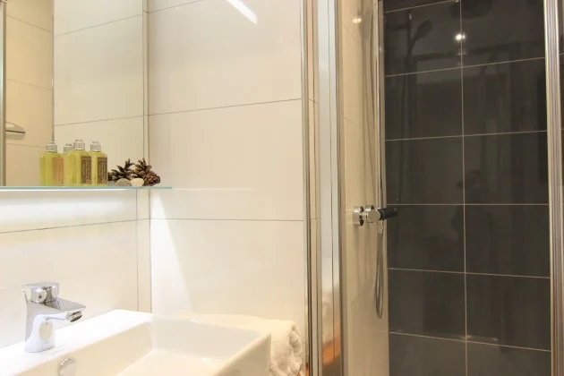 Het appartement beschikt over een doucheruimte met douchewand en apart toilet. Beide zijn goed voorzien van handdoeken en spiegels.