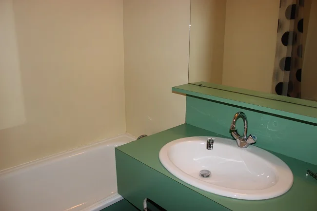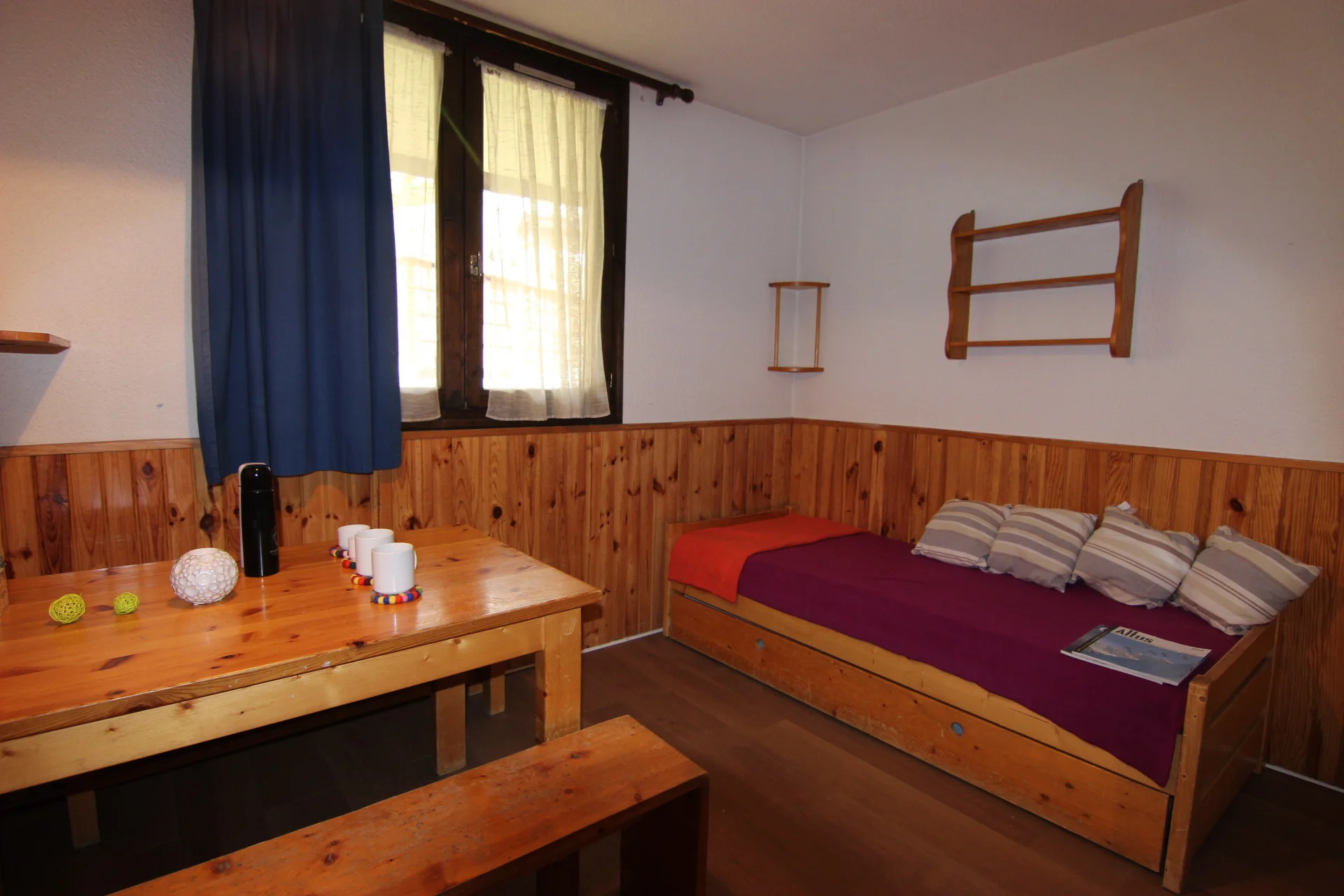 De woonkamer is voorzien van een comfortabele zit- en slaapruimte met TV en afstandsbediening. Hier bevinden zich de vier eenpersoonsbedden. De ruimte beschikt over een praktische bankeetconfiguratie met bankette en matrasjes. De kamer krijgt natuurlijk licht en heeft ramen met donkergroene gordijnen.