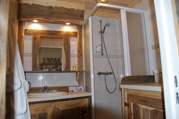 Badkamer met toilet, voorzien van douche, wastafel, föhn, spiegel en handdoekrekken.