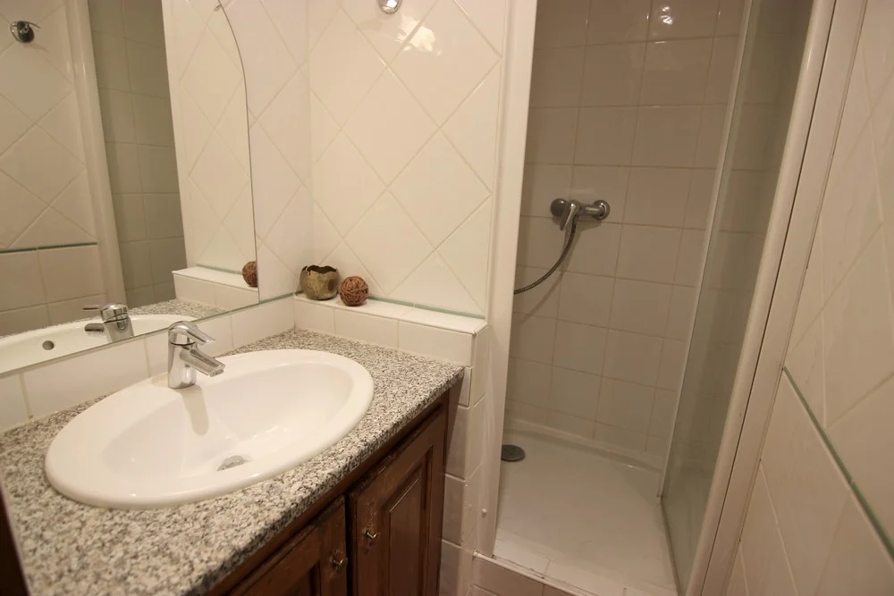 Badkamer met douchegelegenheid en apart toilet.