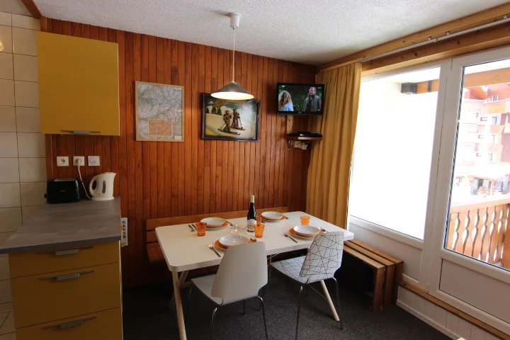Gezellige zithoek met televisie en afstandsbediening. De ruimte is goed verlicht en voorzien van een tafel met zitplaatsen.