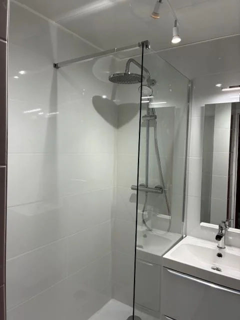 Badkamer met doucheruimte en apart toilet. De badkamer is uitgerust met een föhn.