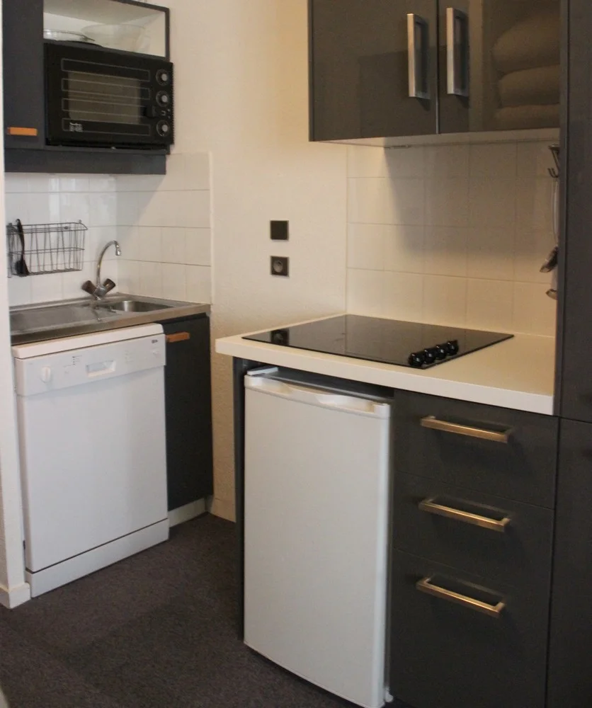 Het appartement is voorzien van een volledige keukenette met inductiekookplaat, oven, magnetron, vaatwasser, koelkast met vriesvak, waterkoker, broodrooster en koffiezetapparaat. Servies, bestek, pannen en keukenbenodigdheden zijn aanwezig.
