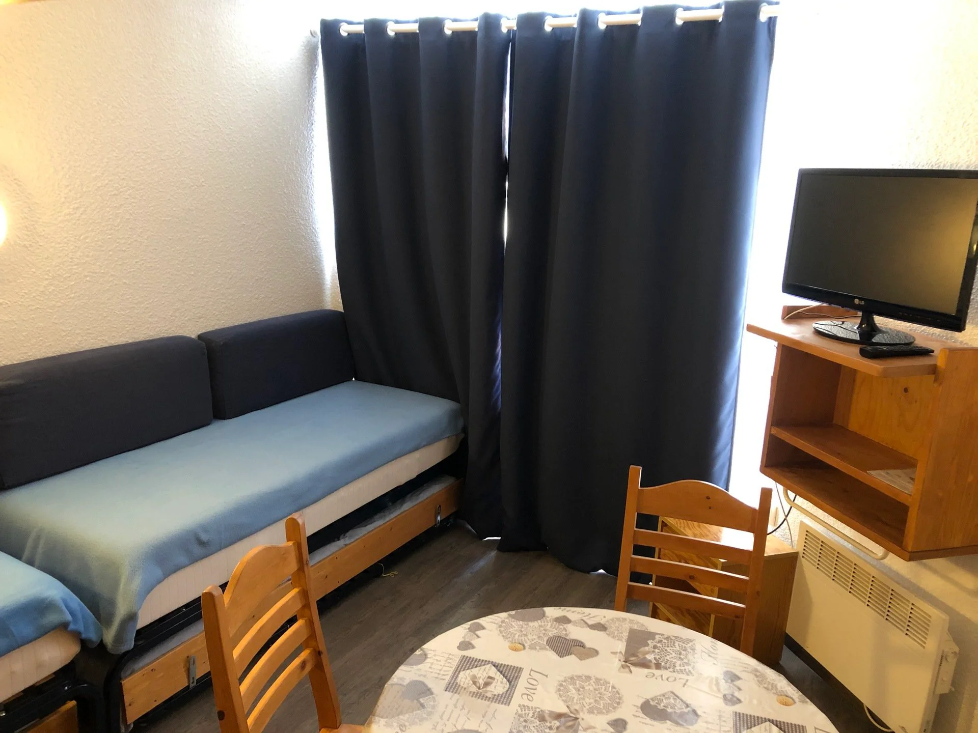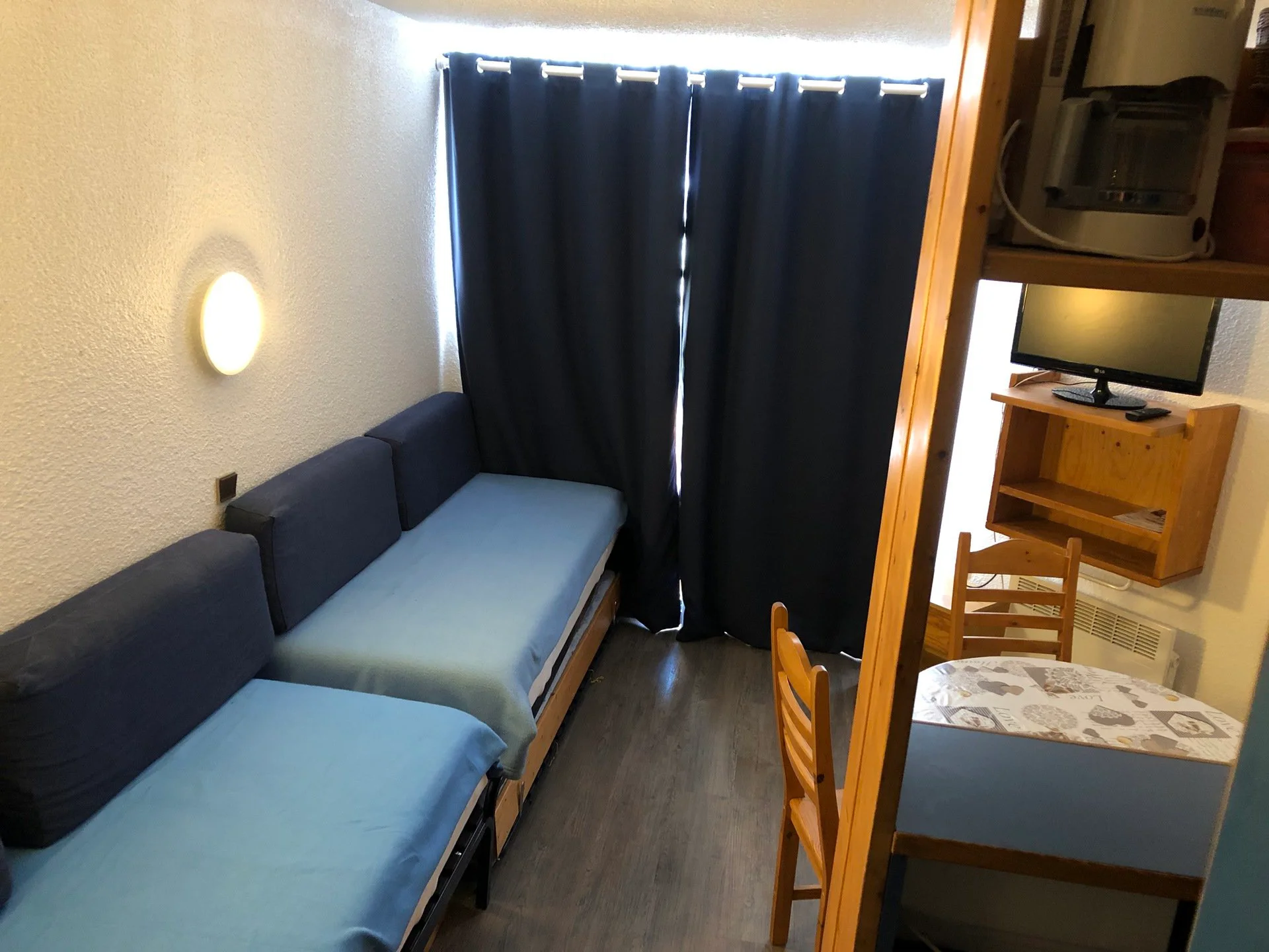 - Slaapkamer: 2 eenpersoonsbedden (80x190 cm) en 1 uitschuifbed