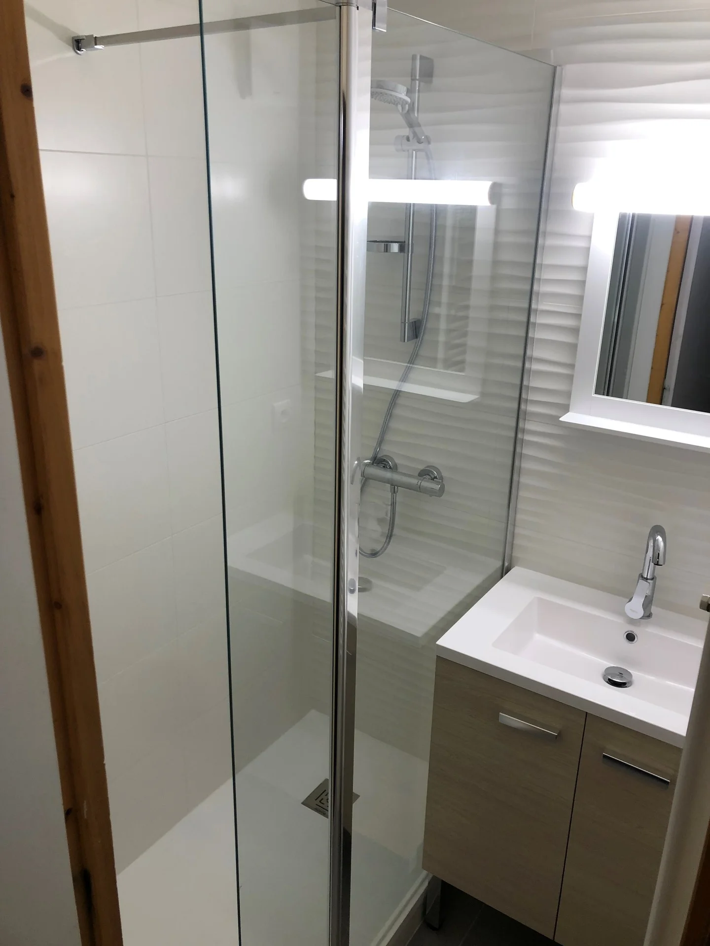 Het appartement heeft een badkamer met doucheruimte en apart toilet. In de badkamer bevinden zich een spiegel, handdoekrek en haardroger.