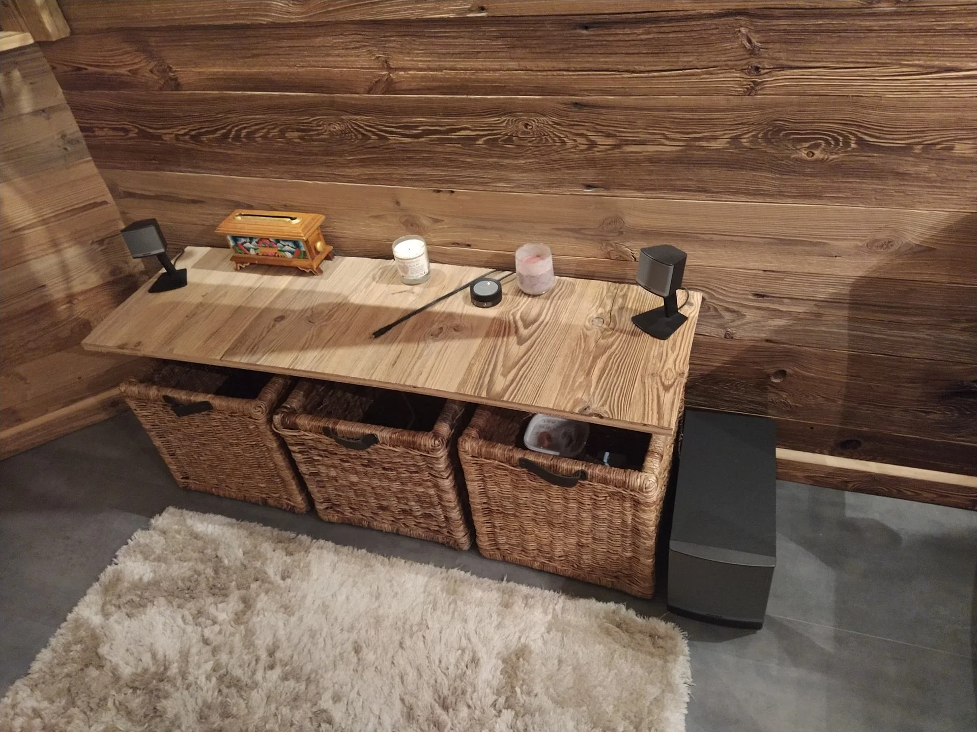 De gezellige woonkamer is ingericht met een slaapbank, fauteuil en salontafel. Een TV met afstandsbediening zorgt voor entertainment. Bose-luidsprekers en een radiator dragen bij aan het comfort.