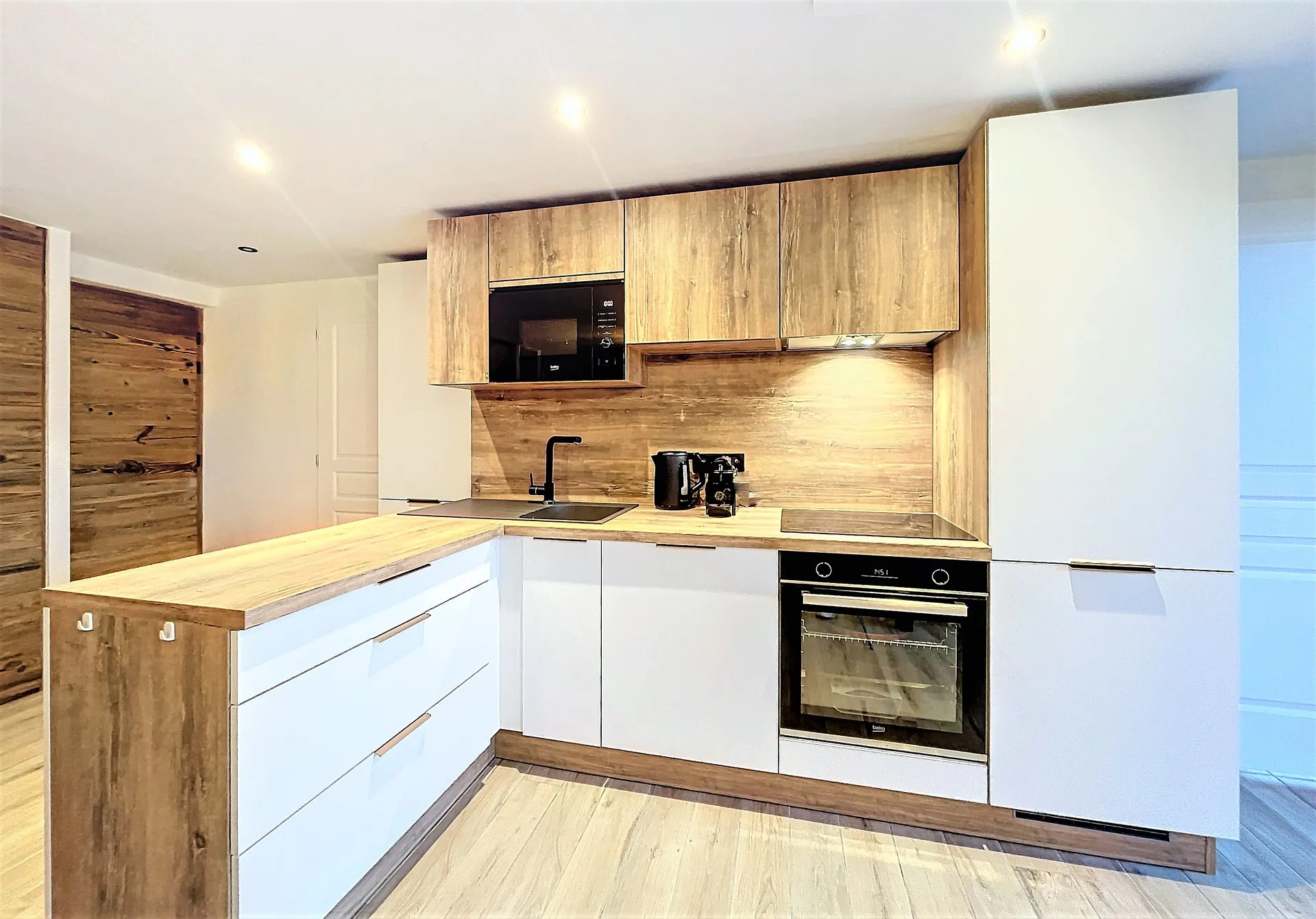 Open, volledig uitgeruste keuken met inductiekookplaat, oven, magnetron, vaatwasser, Nespresso®-apparaat, waterkoker, broodrooster, fondue- en racletteset, wasmachine