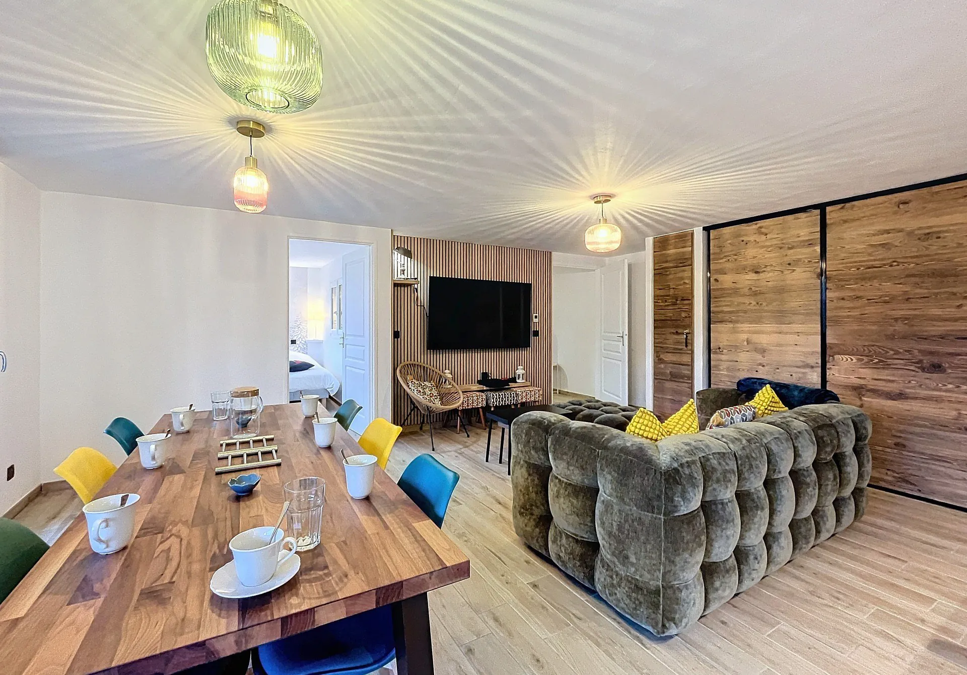 Grote en sfeervol ingerichte woonkamer (ca. 40 m²) met zithoek, flatscreen-tv en eethoek met grote tafel voor 8 à 10 personen