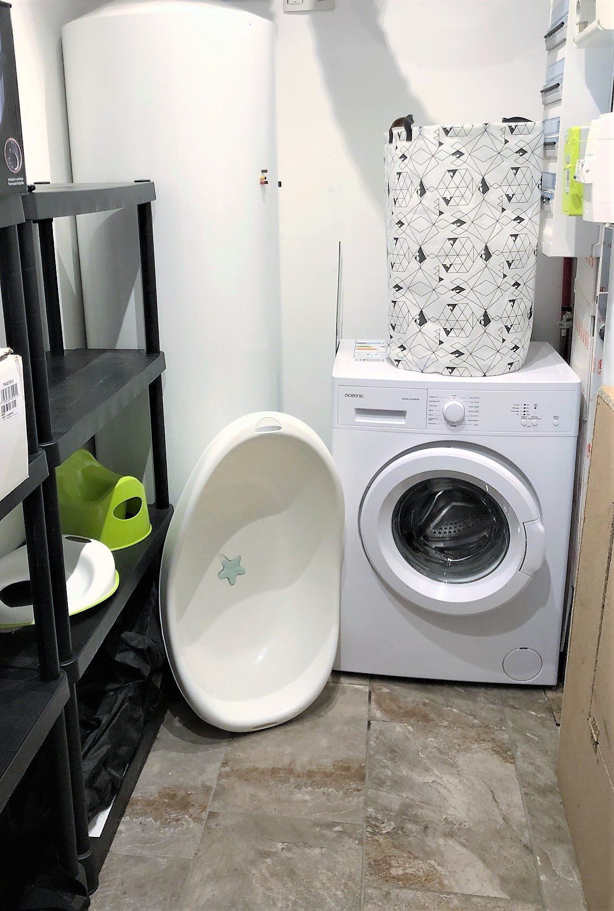 Berging/wasruimte met wasmachine, strijkijzer en babybenodigdheden (babybad, reisbed, kinderstoel, potje)