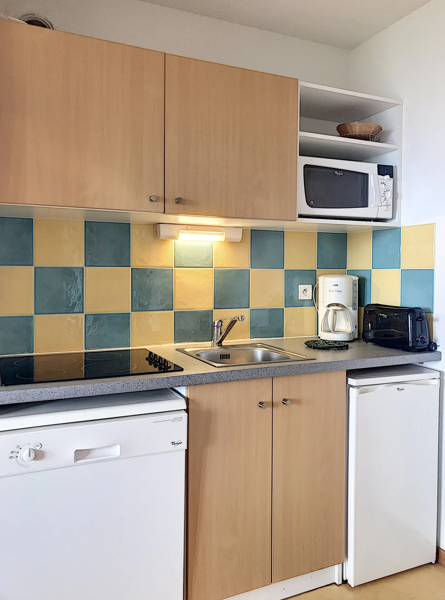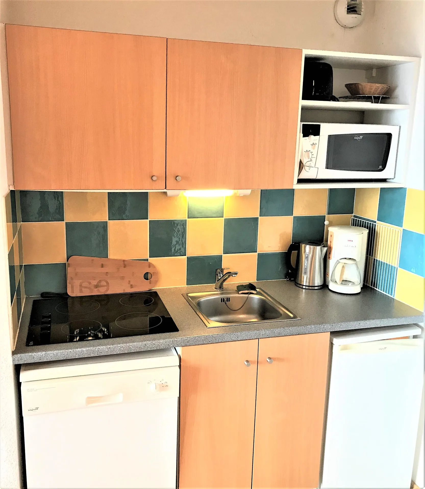 Keukenhoek met 4 keramische kookplaten, magnetron, koelkast (top), vaatwasser, koffiezetapparaat, waterkoker, broodrooster, raclette- en fondueset