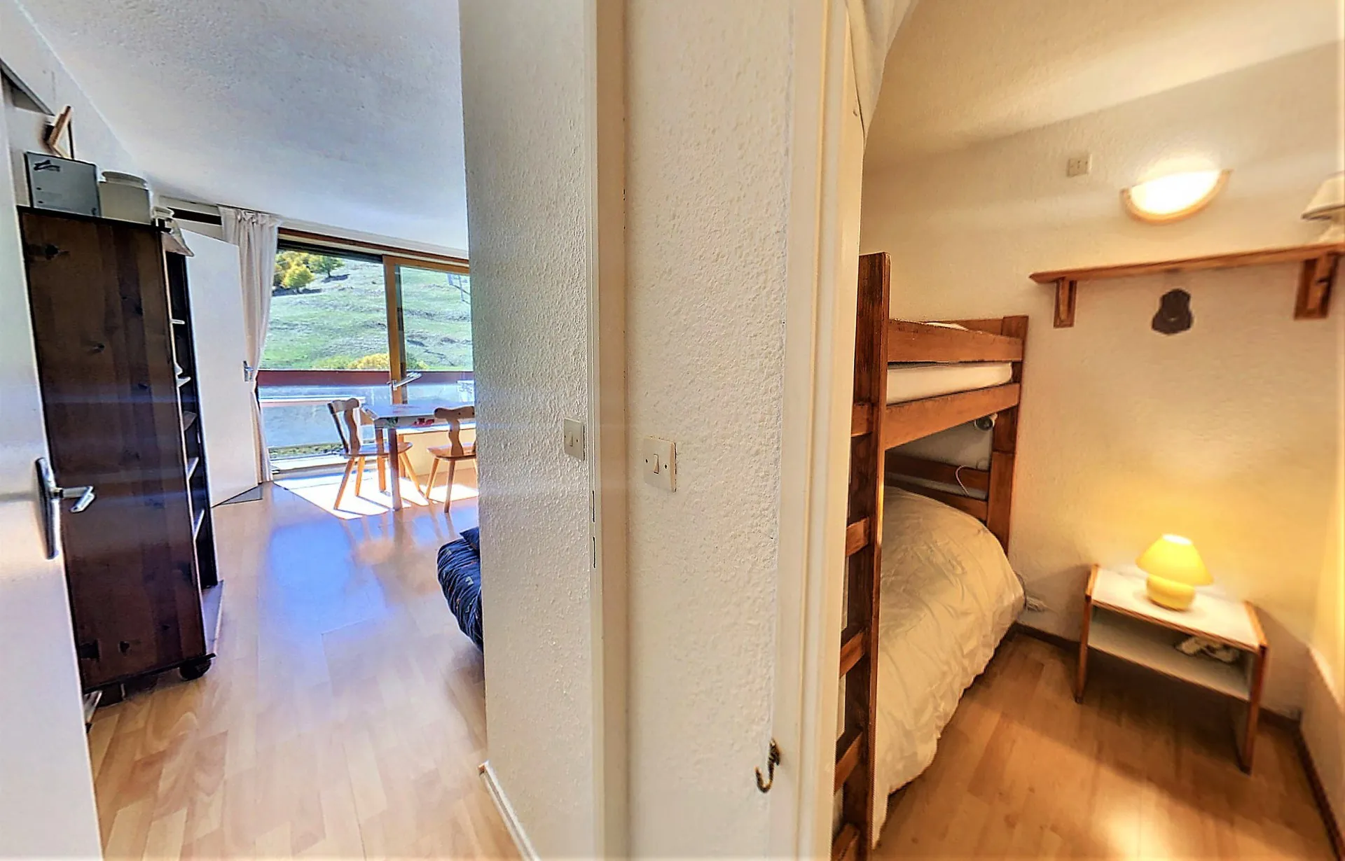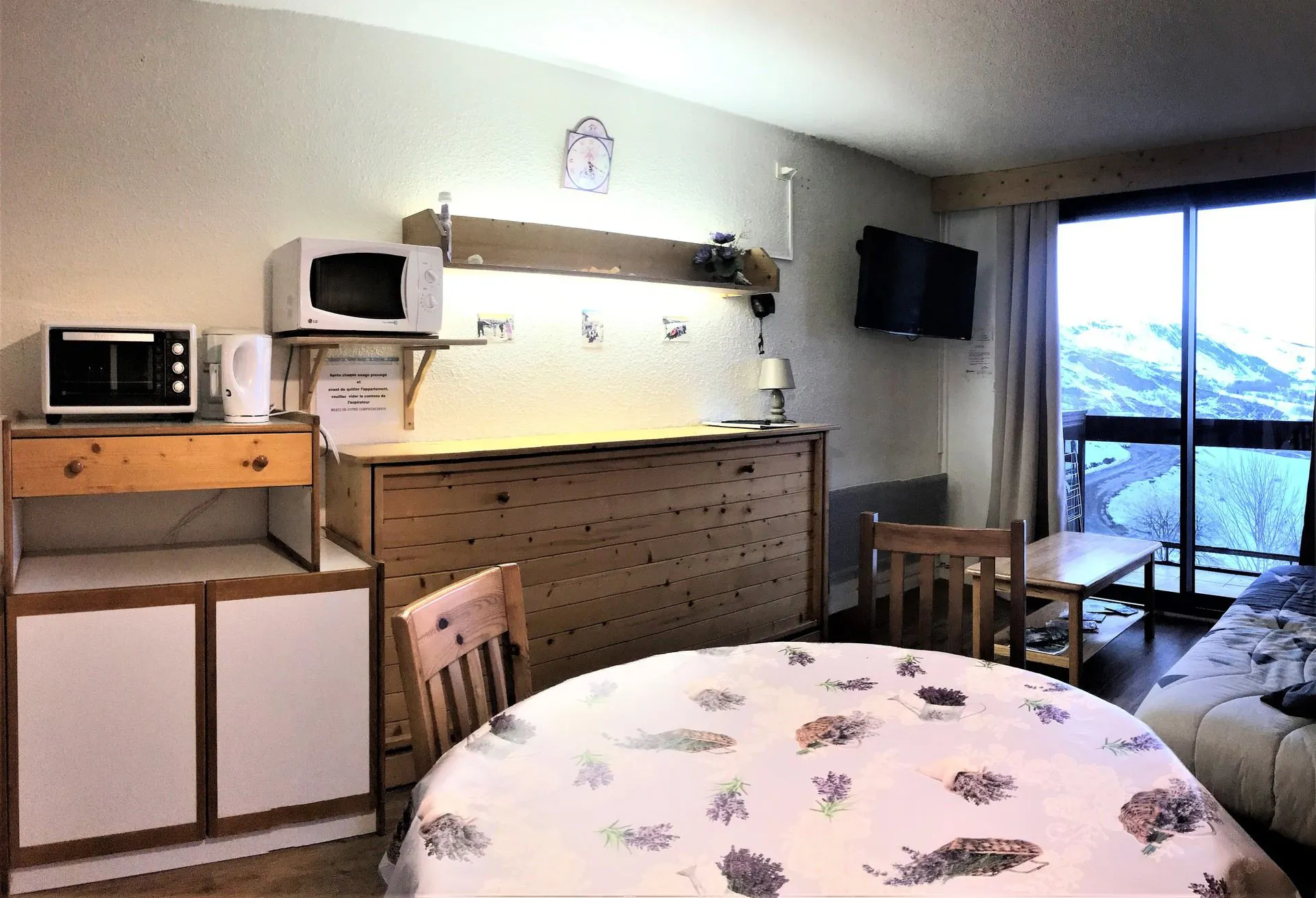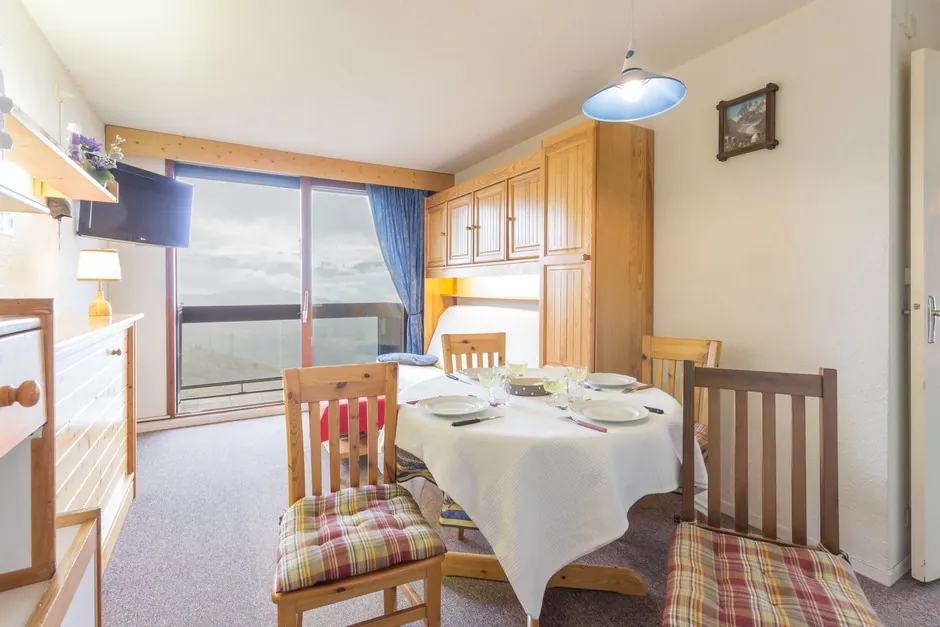 Dit verzorgde en gerenoveerde appartement van 32m² ligt op de 8e verdieping van Résidence Lunik, direct bij de télésiège La Voie Lactée. Dankzij de twee balkons geniet je zowel van de ochtendzon met uitzicht over de vallei als van de middagzon met uitzicht op de pistes en de Mont Charvin.