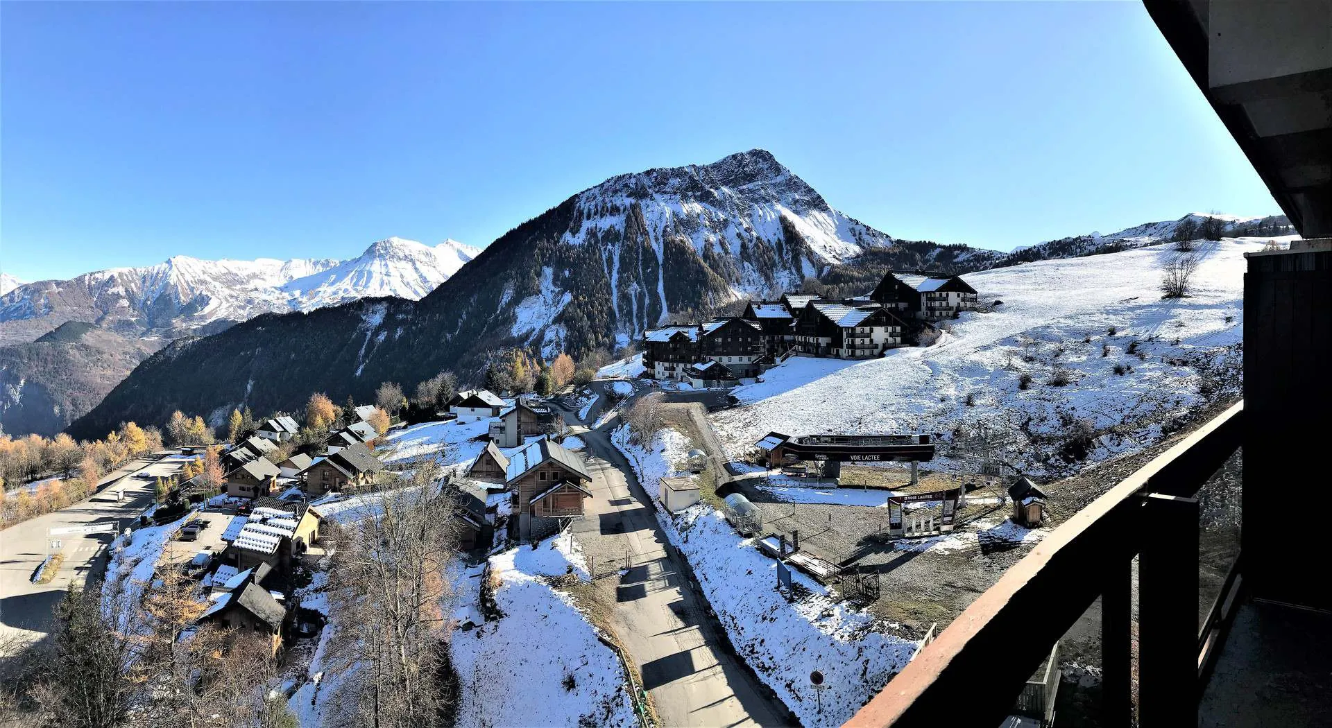 Balkon zuidzijde met uitzicht op de Mont Charvin en de pistes, voorzien van tuinmeubilair