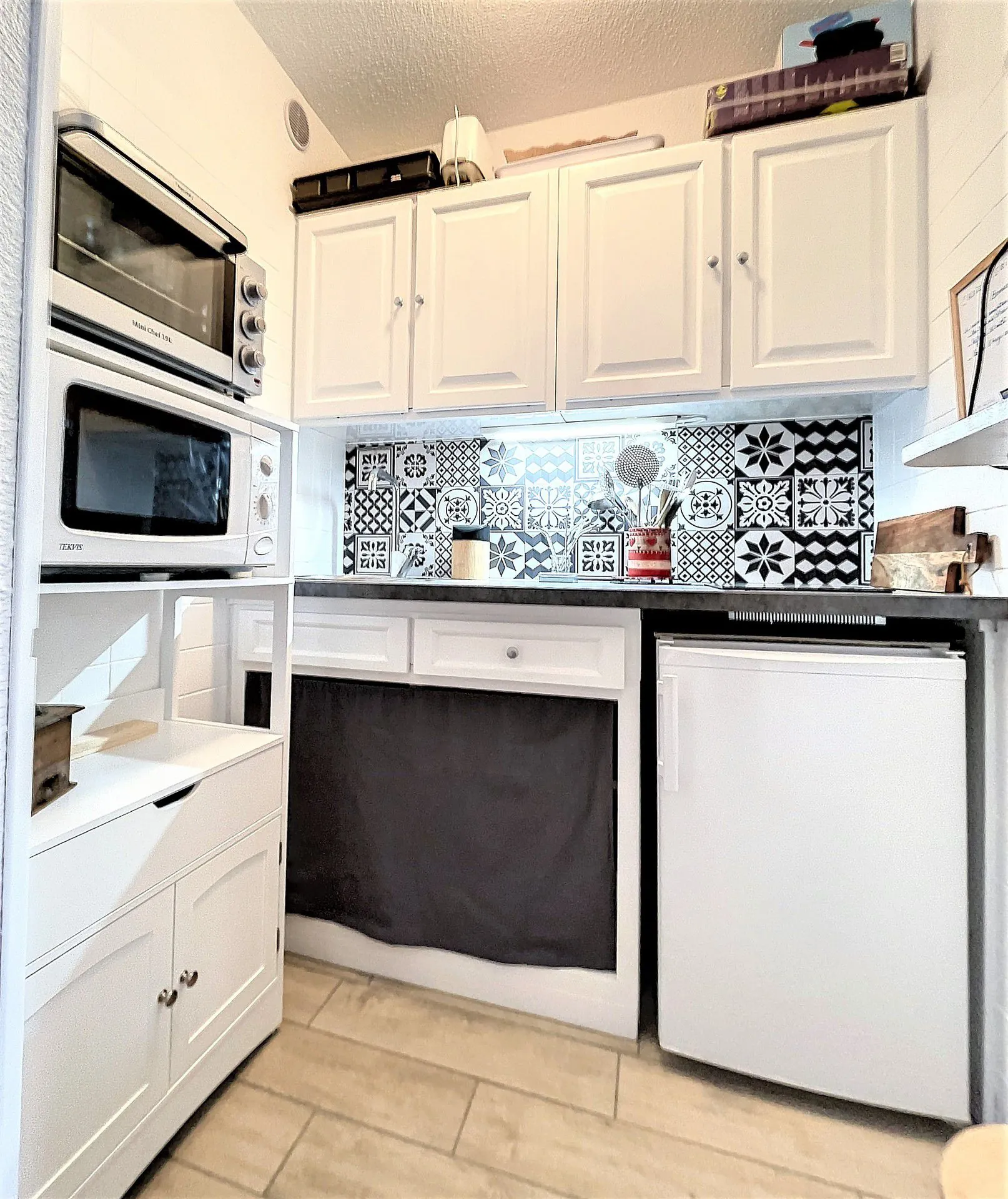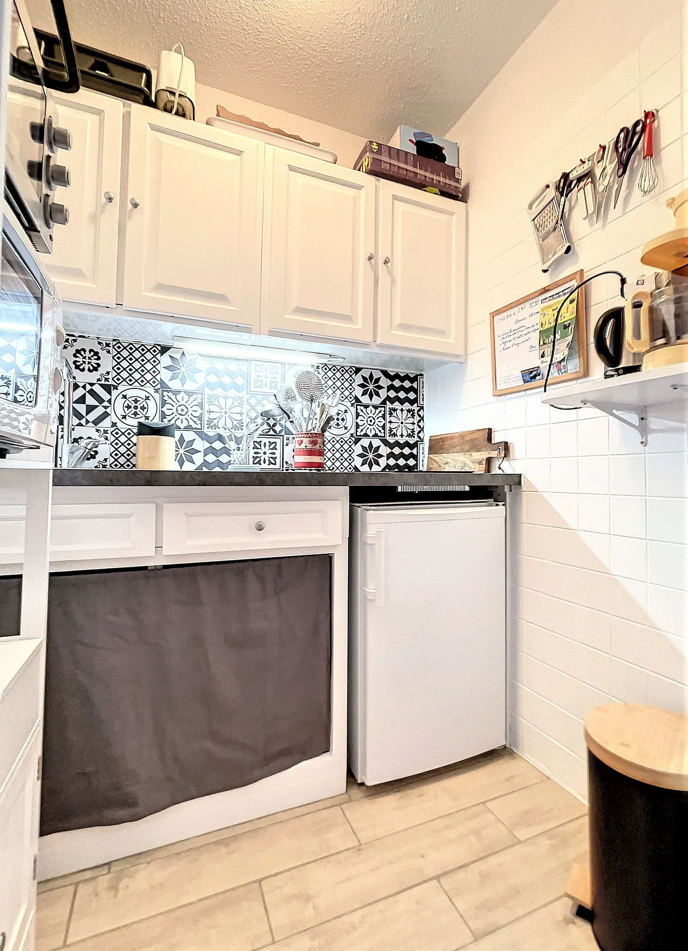 Keukenhoek met 4 keramische kookplaten, vaatwasser, koelkast, magnetron, koffiezetapparaat, waterkoker, broodrooster, grill, blender, raclette-apparaat en broodmachine