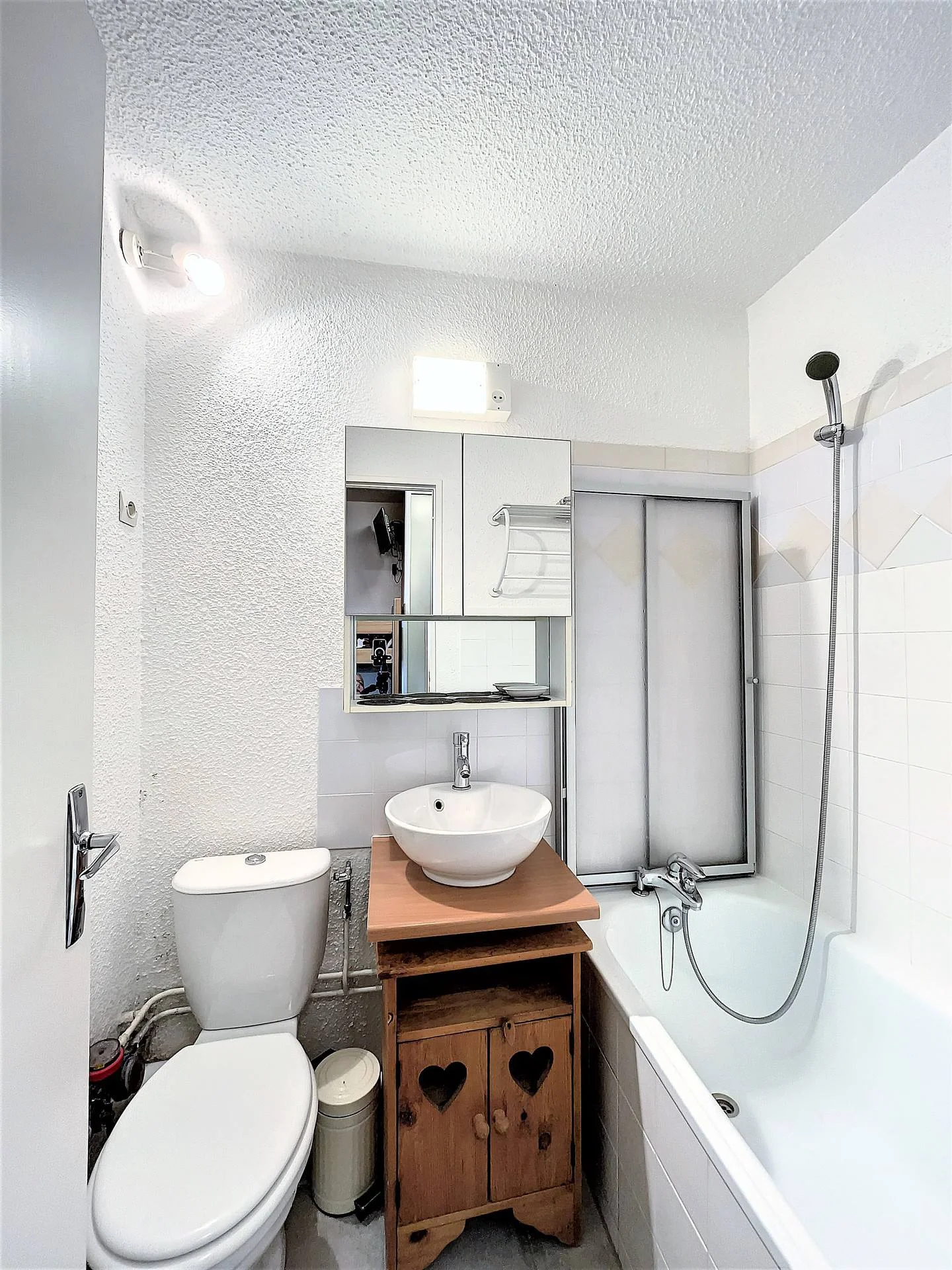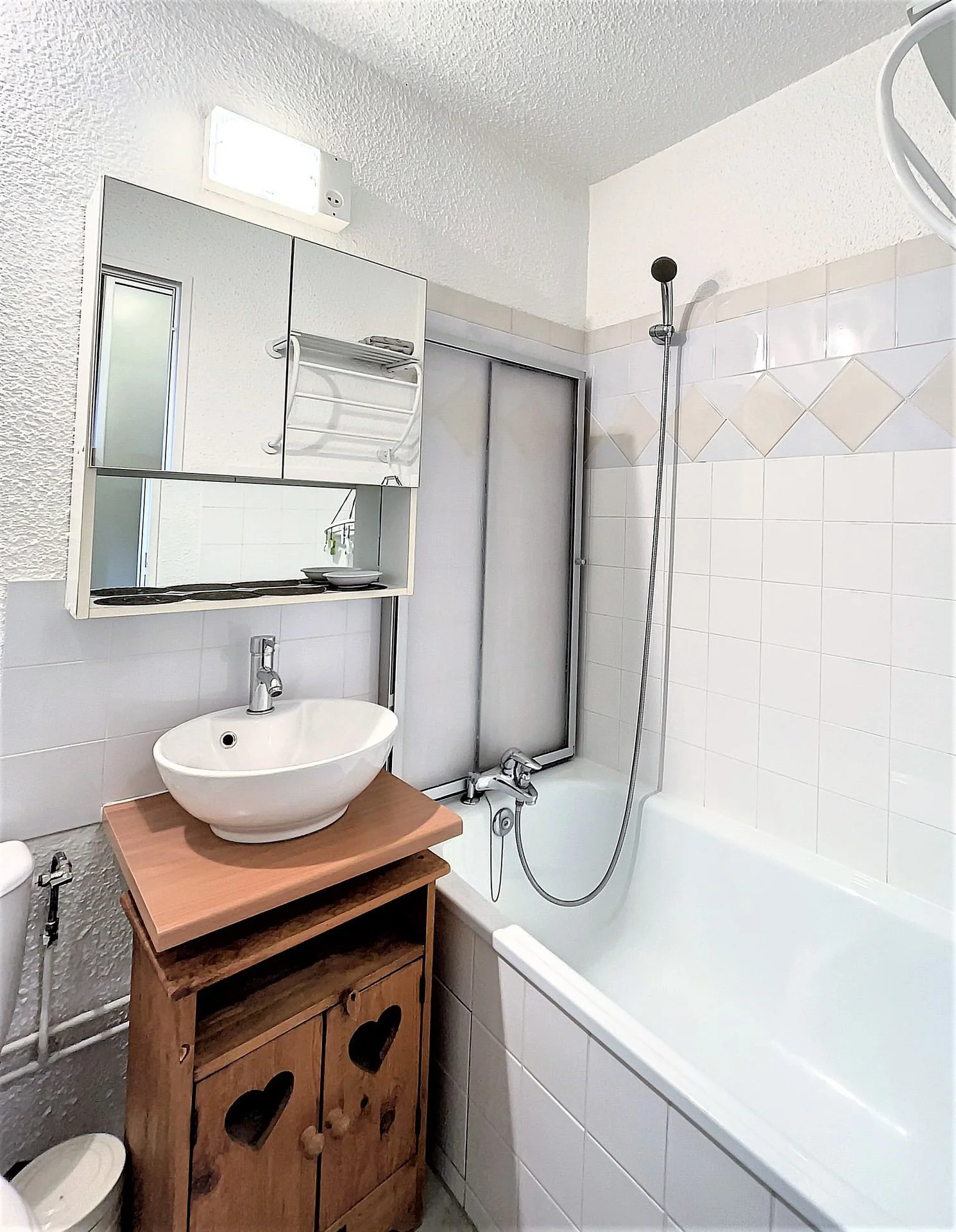 Badkamer met bad of douche, wastafel met spiegel, föhn en douchegordijn. Apart toilet.