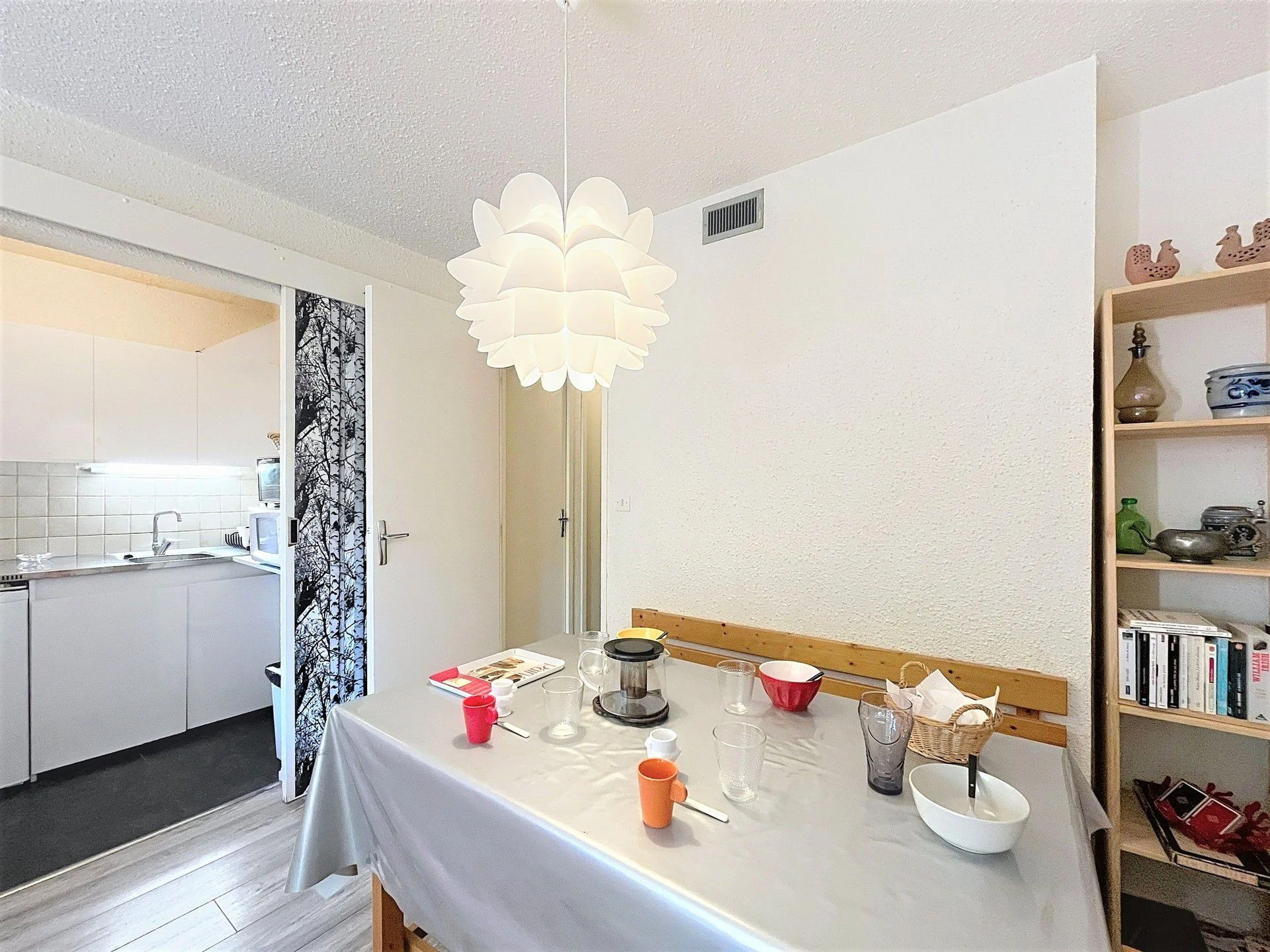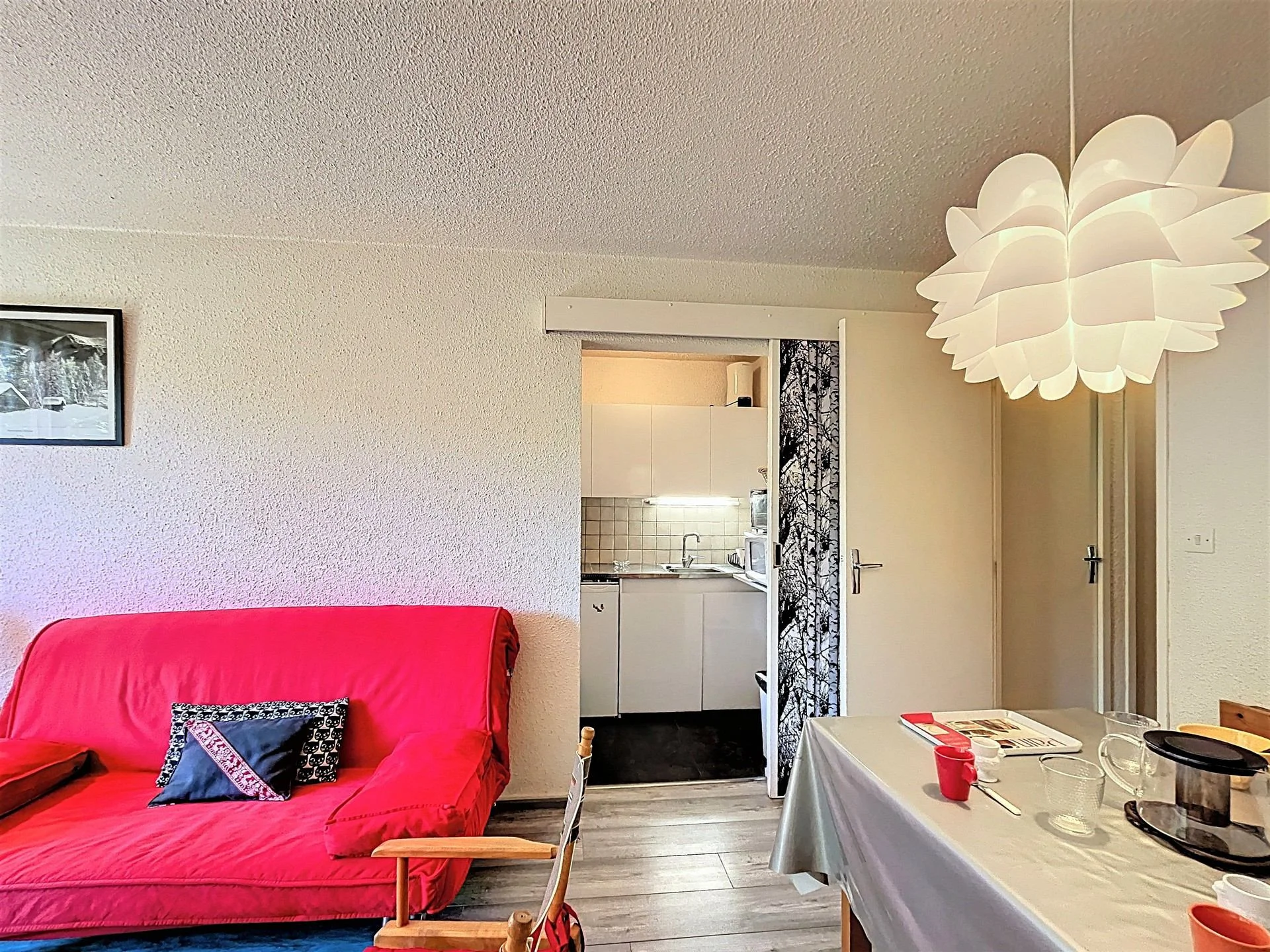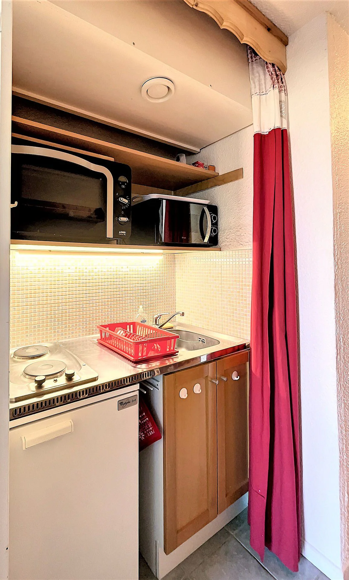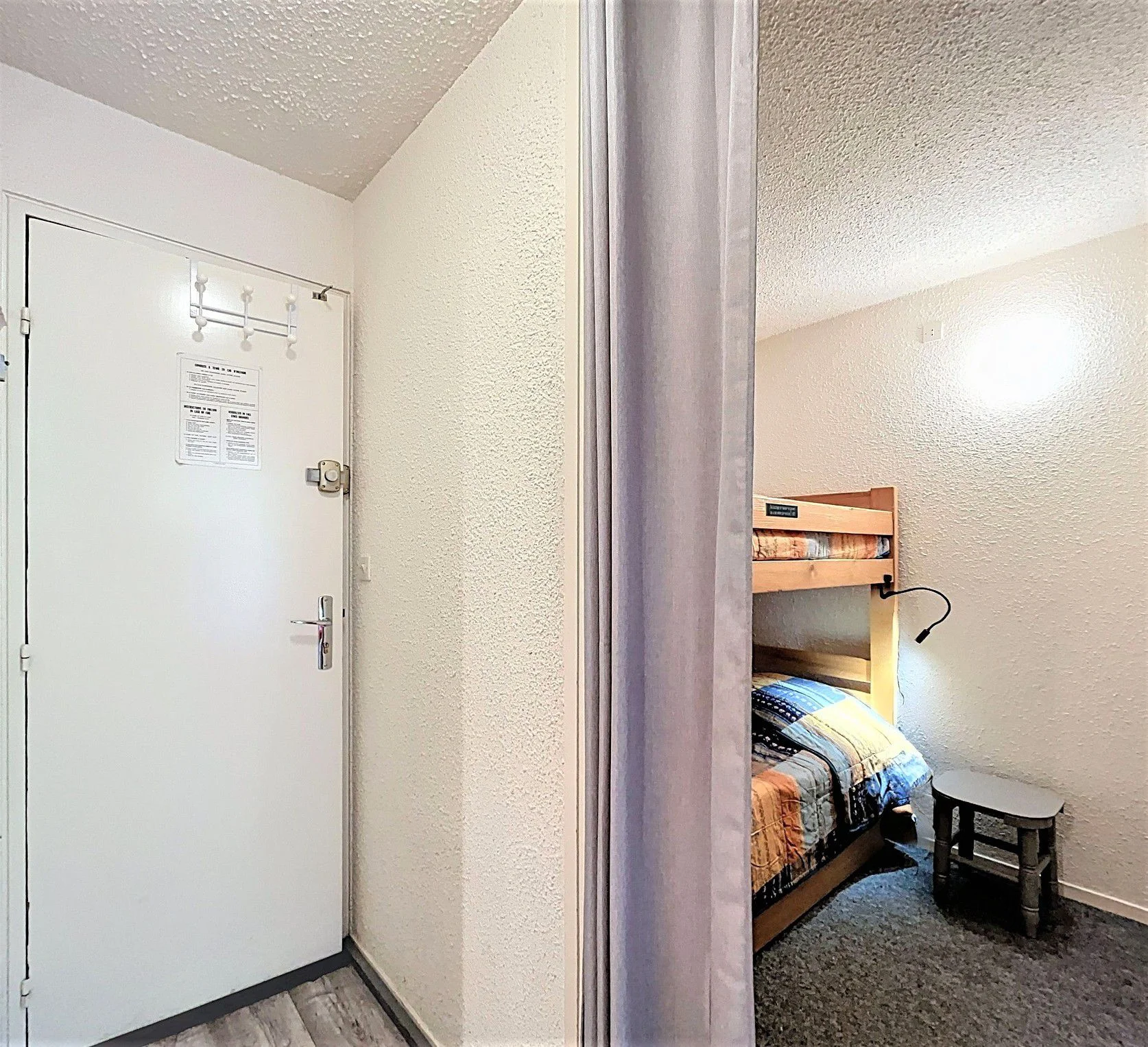 Dit studio cabine-appartement bestaat uit een woonkamer met een slaapkabine. Het heeft een gezellige woonruimte met eethoek, een ingerichte keuken en een badkamer met toilet. Door de compacte indeling is het ideaal voor families of groepen die efficiënt willen verblijven.